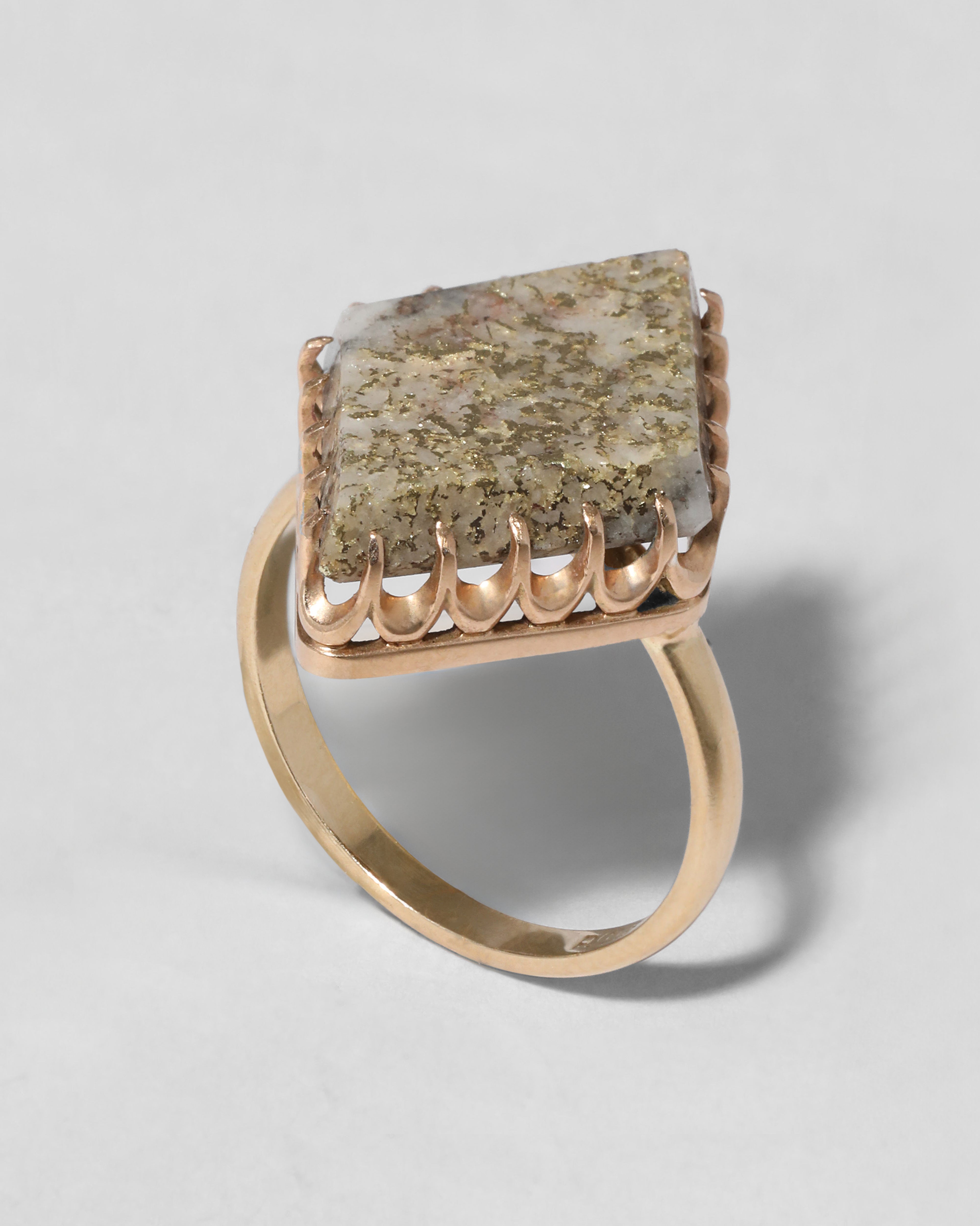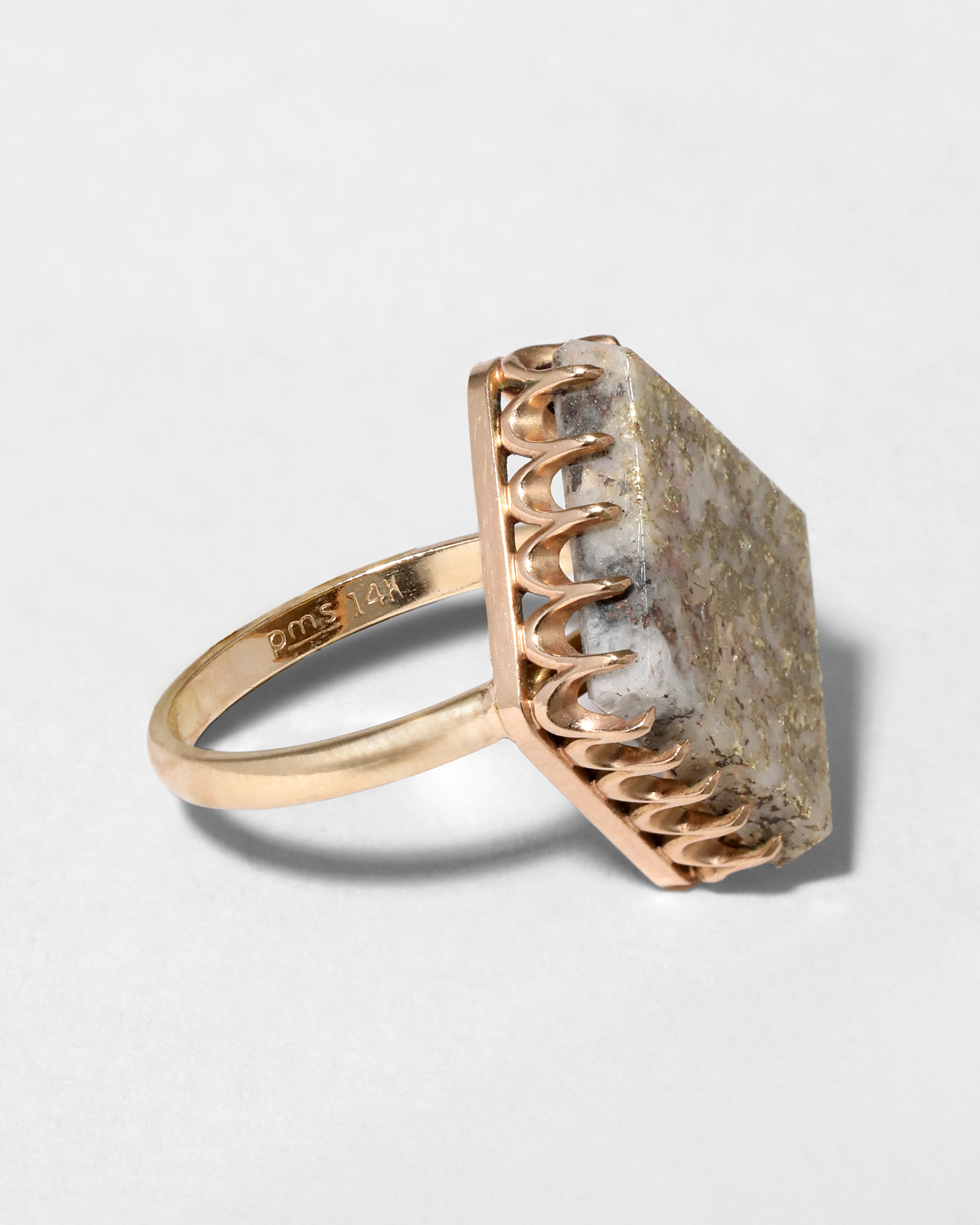 Glistening golden quartz is square cut and prong set onto this gorgeous 14k gold ring from the 1800s.