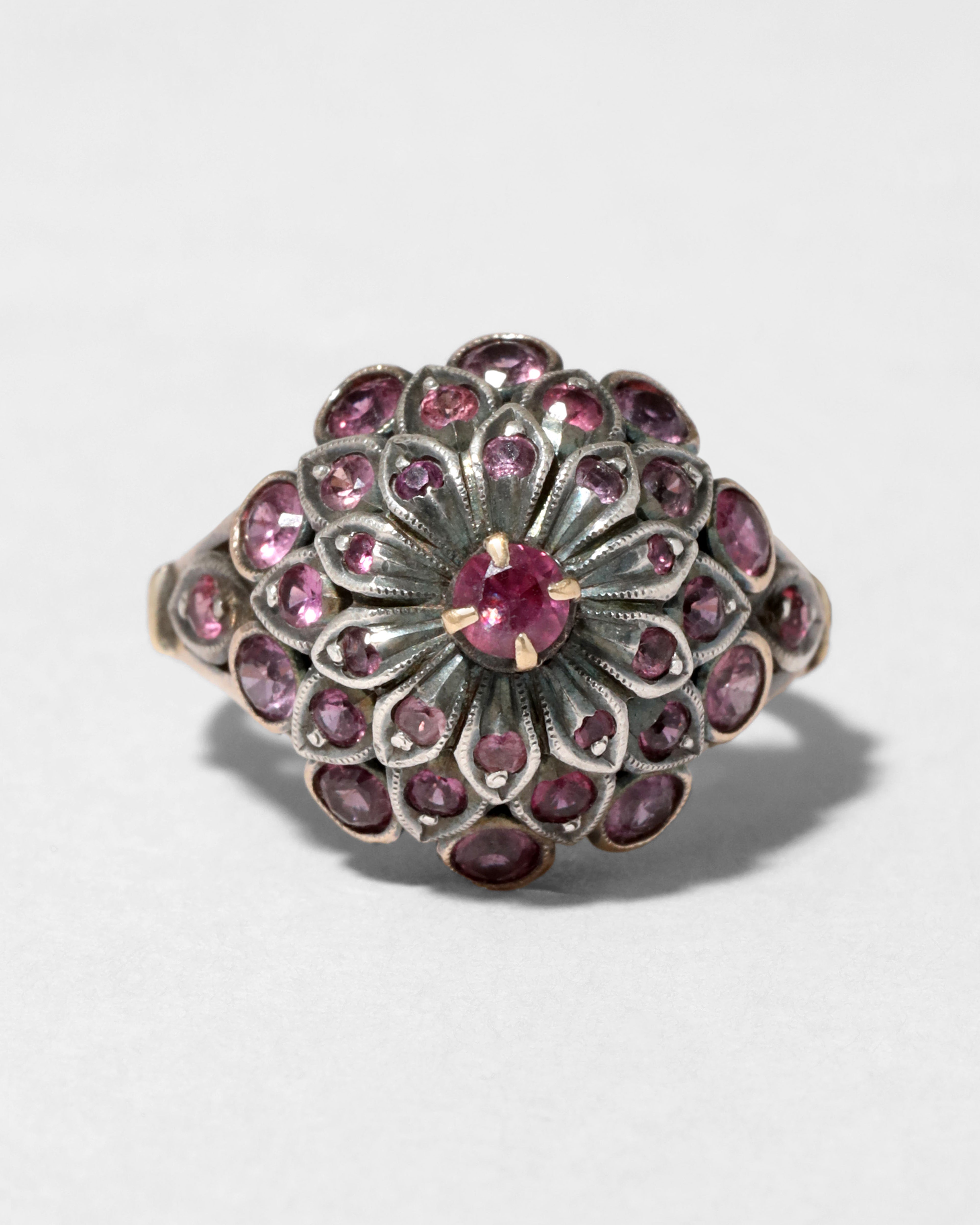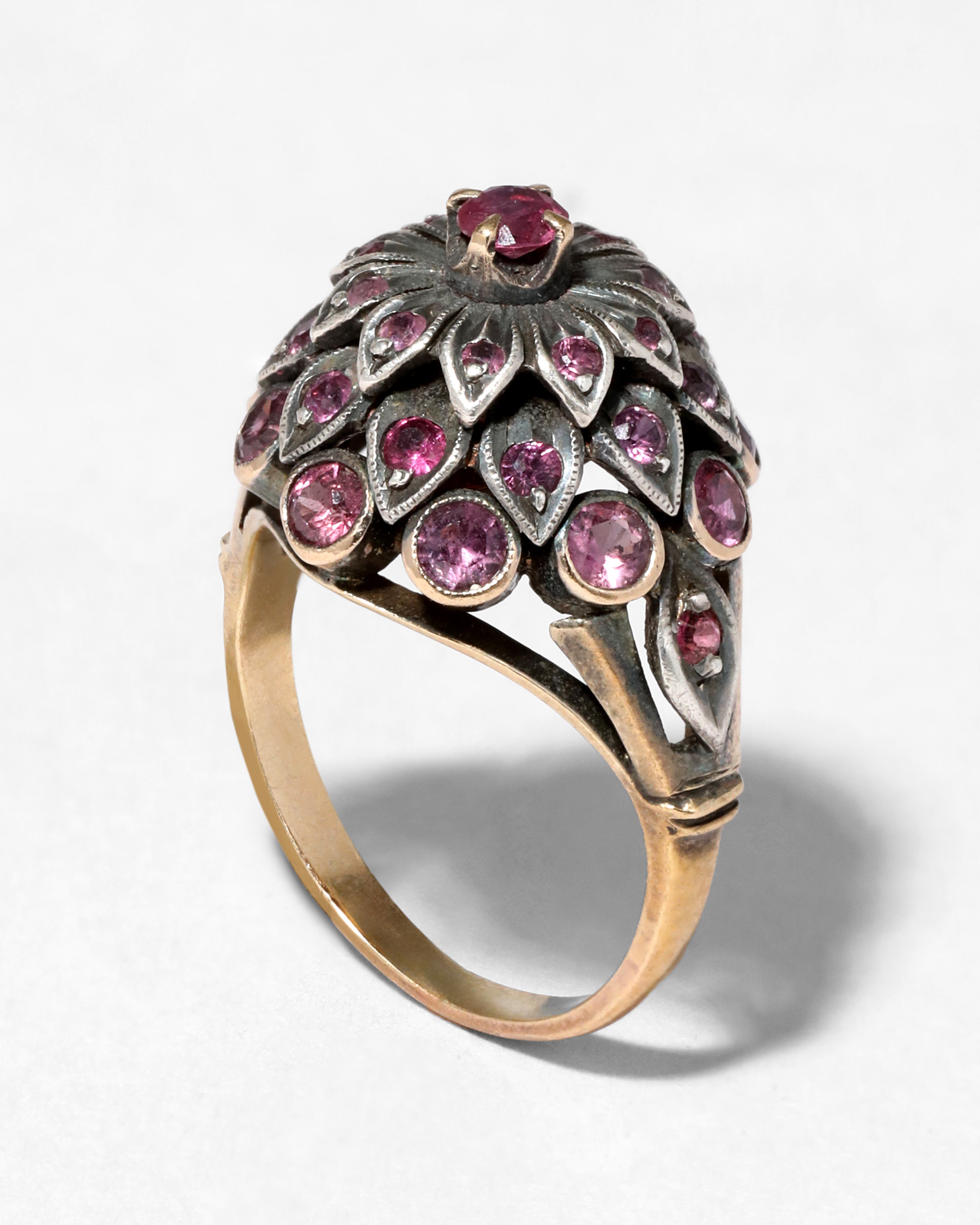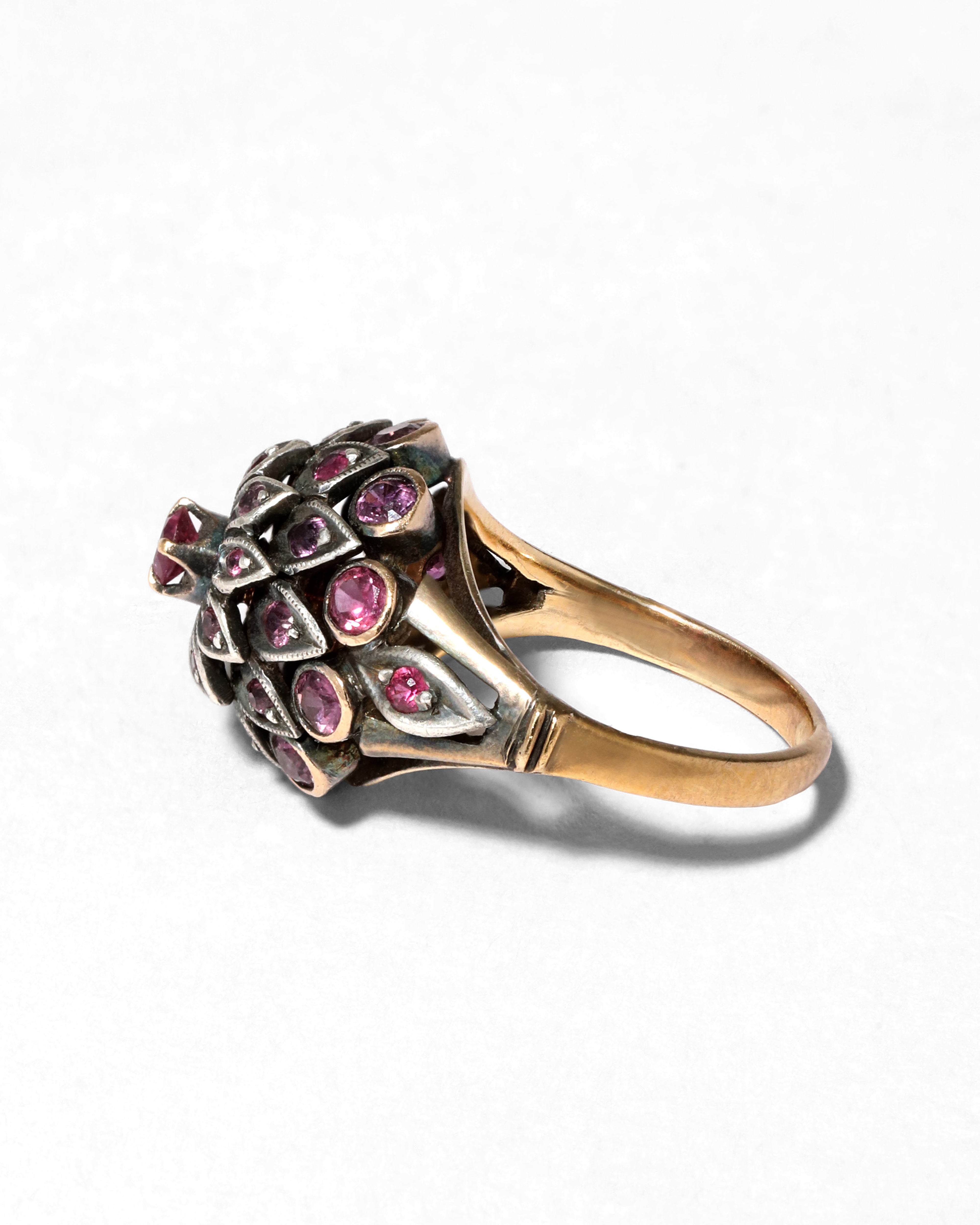 From the 1800s, this stunning 18k gold & sterling silver cocktail ring has a domed silhouette of tiered meticulously detailed feather metalwork accented with ruby centers and a claw set ruby perched on top.