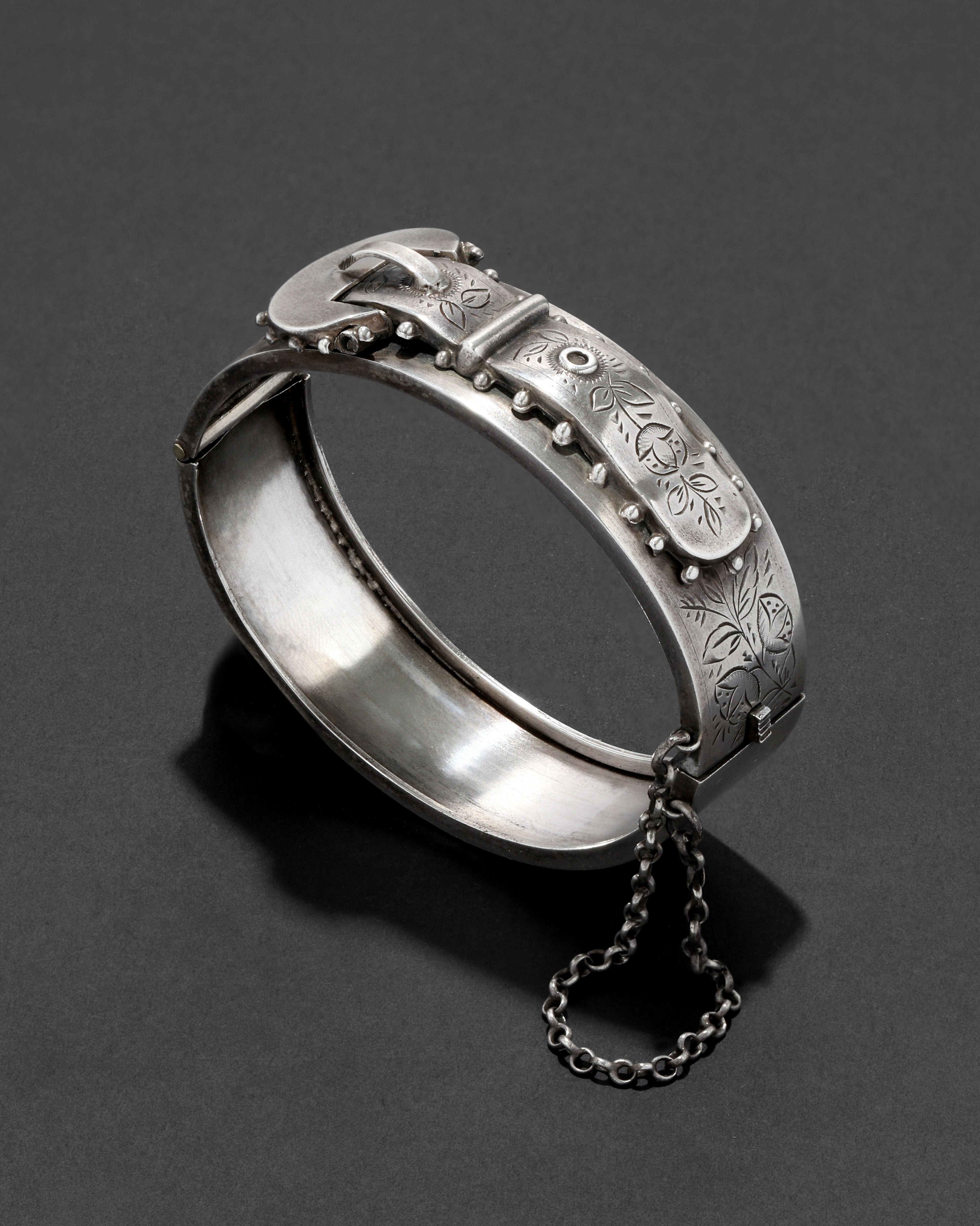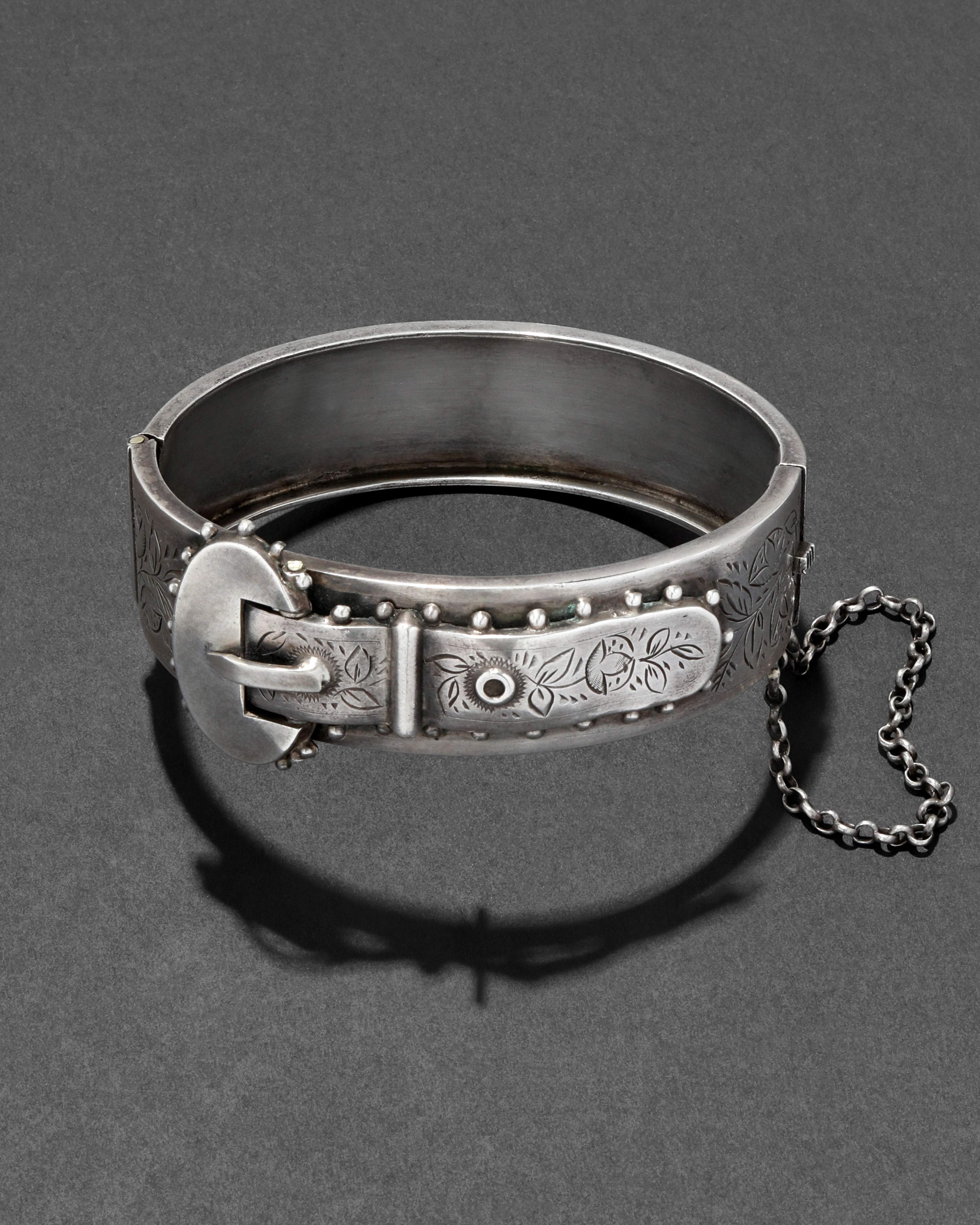 From the Victorian 1800s, this antique sterling silver bracelet features an ornate buckle motif engraved with floral details. Buckle motifs were commonly used to symbolize eternal love & loyalty in Victorian jewelry making.