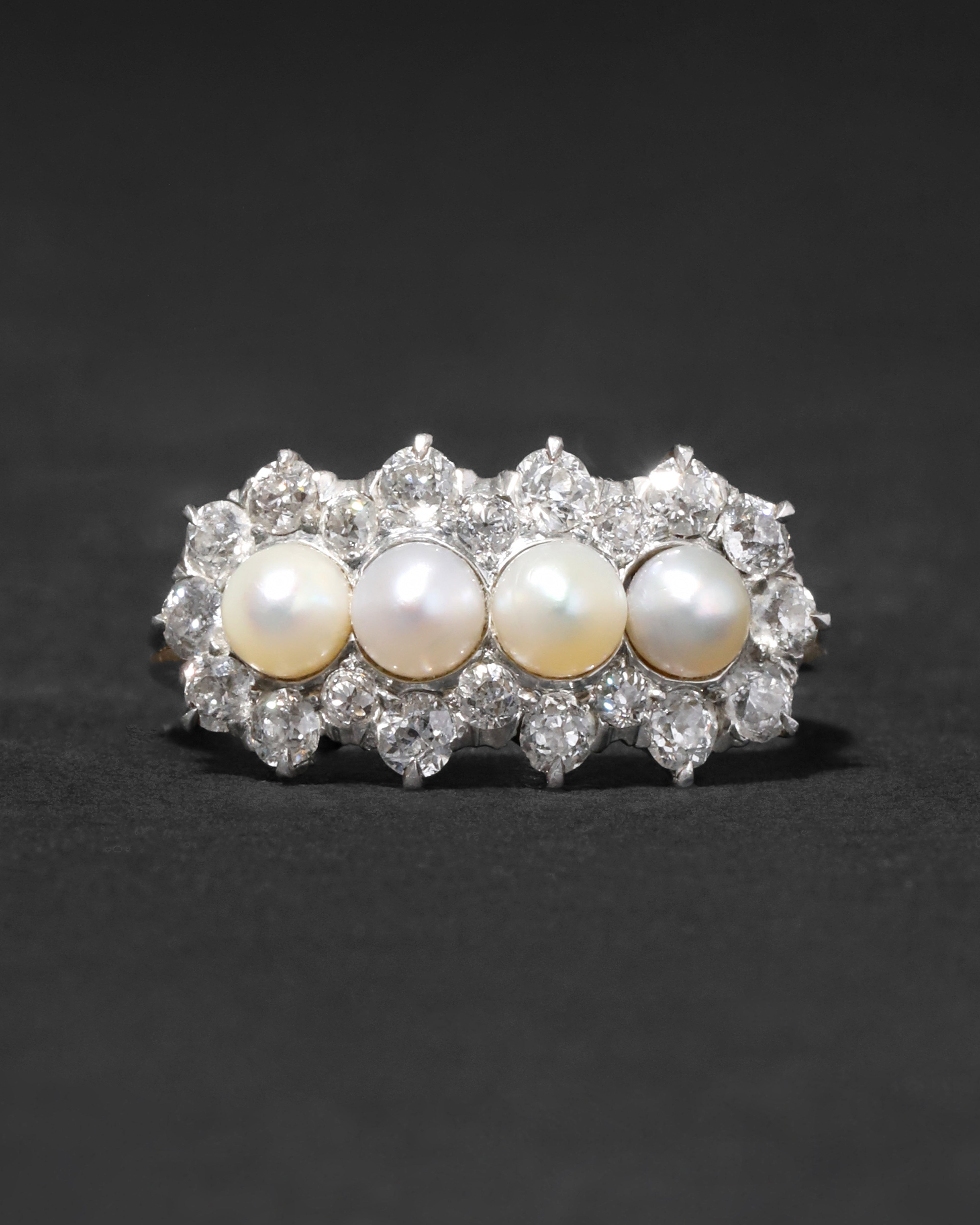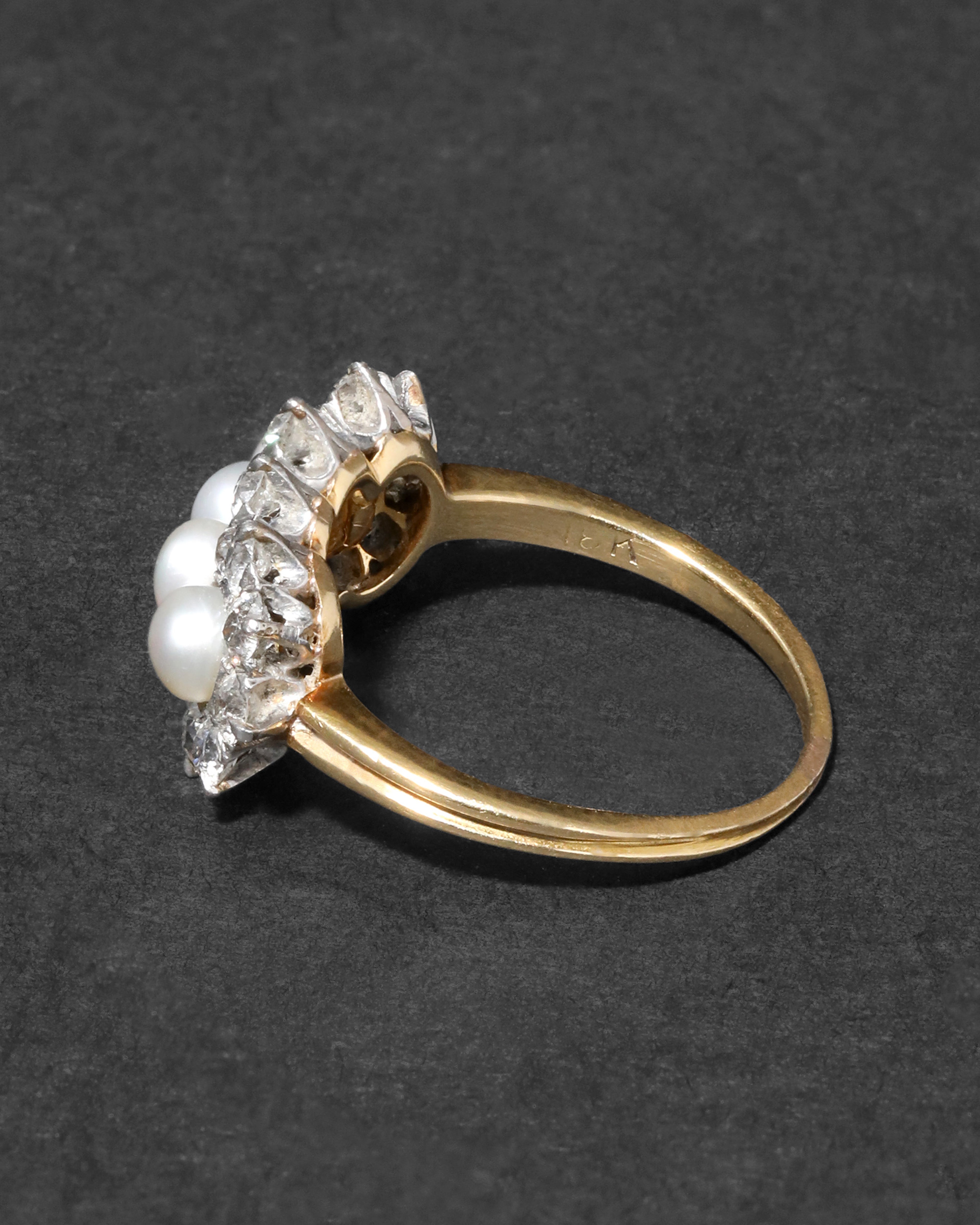 Stunning and truly unique, this 18k gold ring from the 1900s has a row of opalescent natural pearls surrounded by clusters of claw set diamonds.