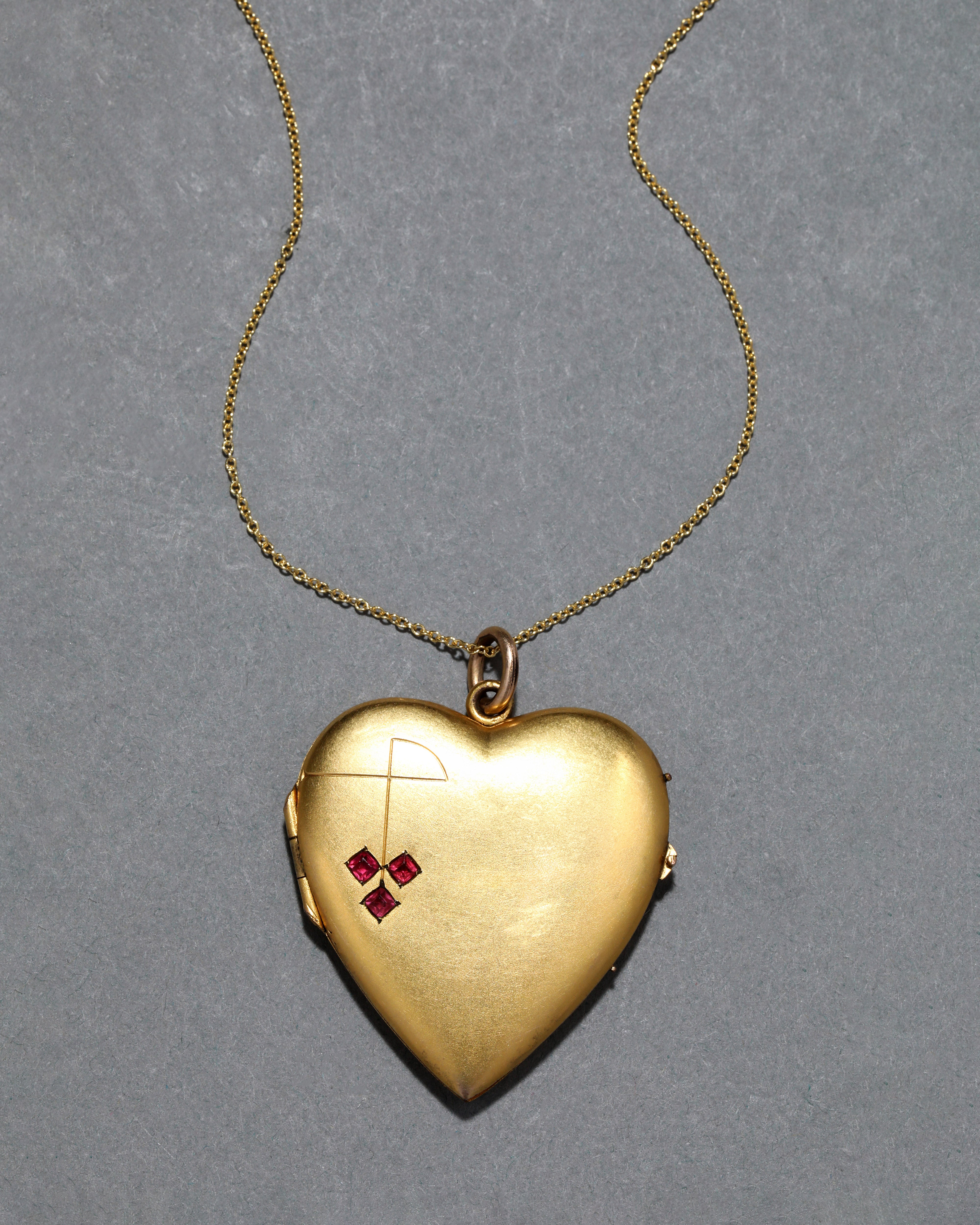 Lustrous 14k gold fill heart locket dating from the 1910s, with a hand-etched minimalist cross motif accented with vibrant garnets. Strung on a 14k gold fill chain.