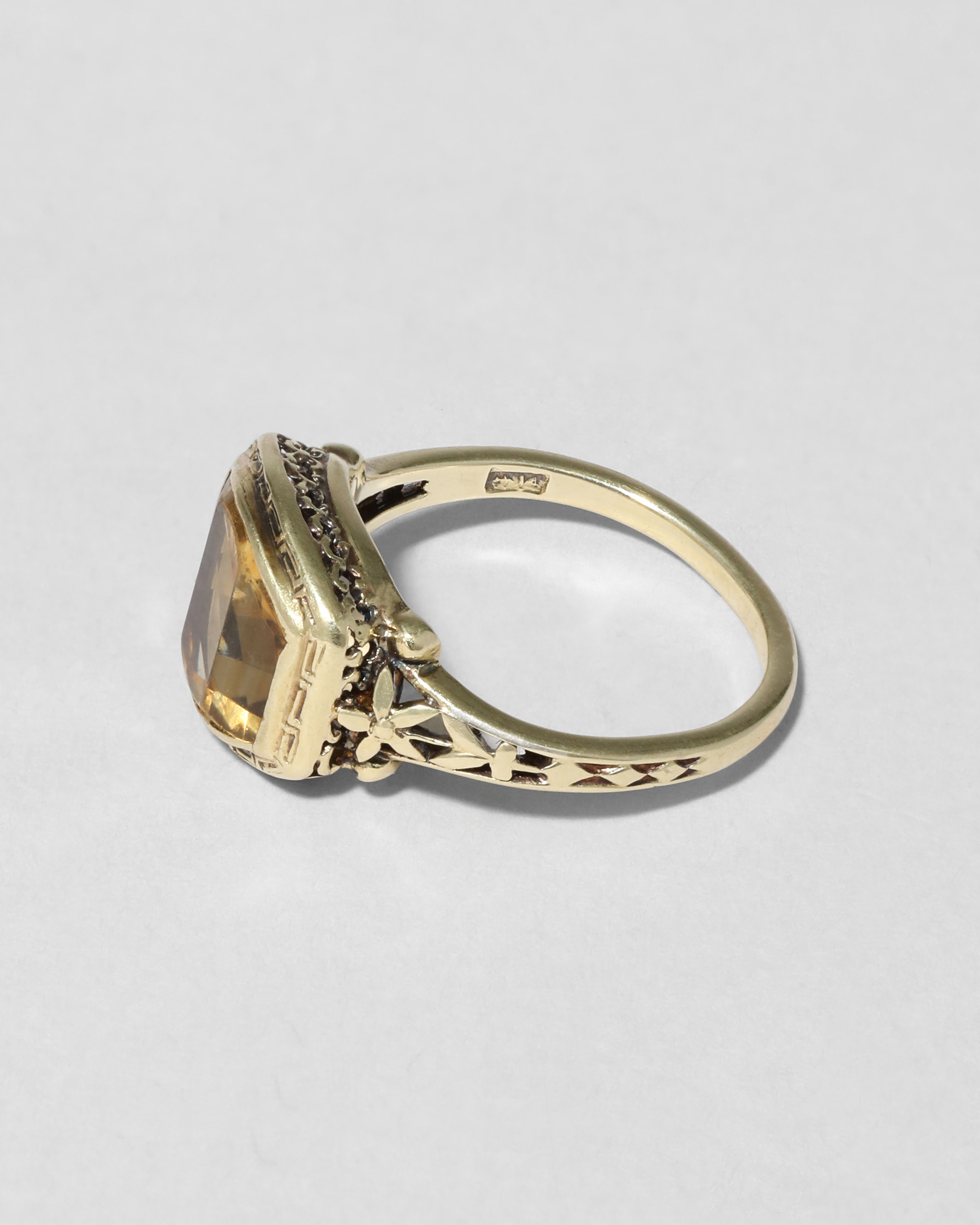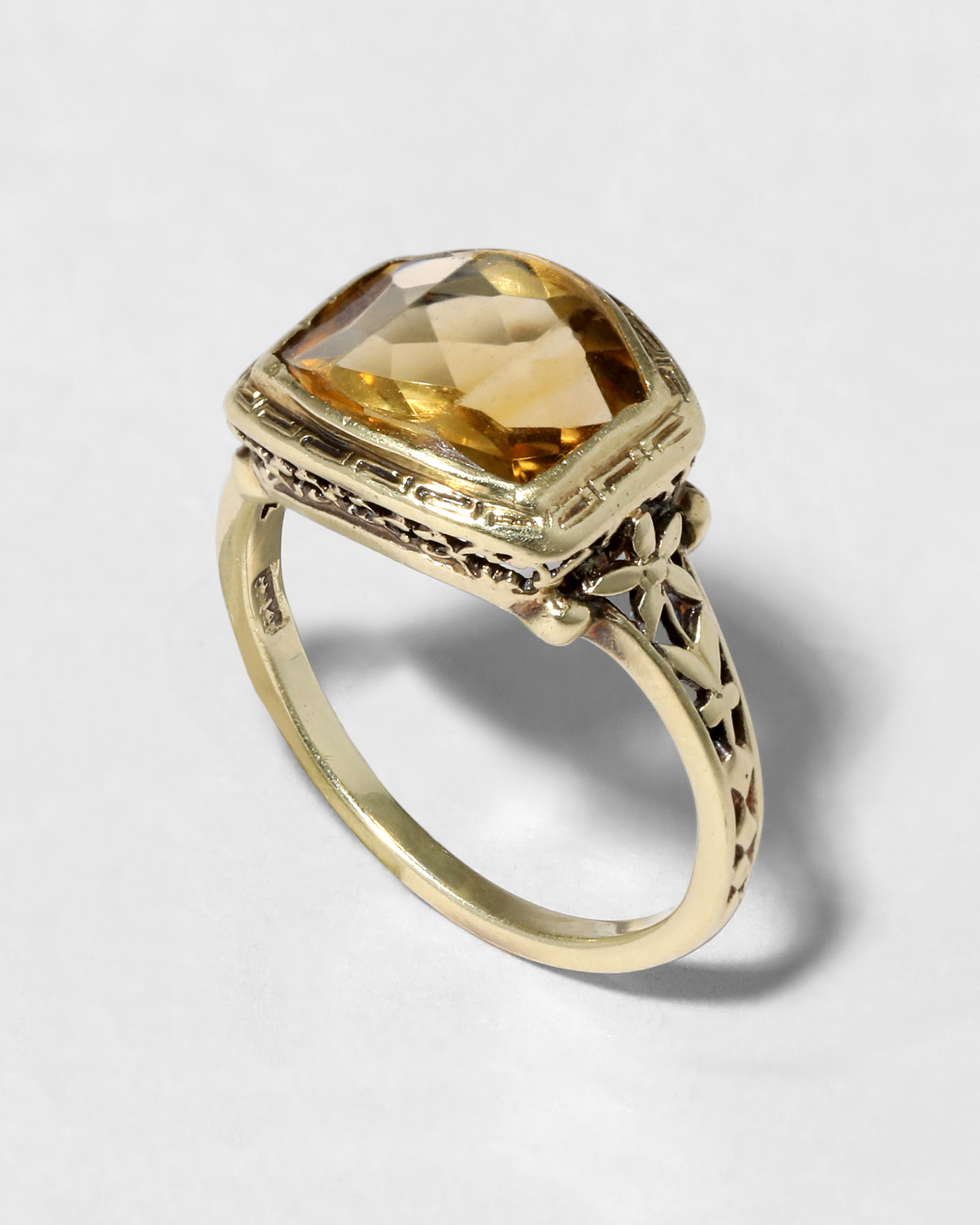 Unique antique 14k gold ring from the 1910s, with a lustrous custom cut citrine stone in a greek key bezel setting and an ornate floral motif shank band.