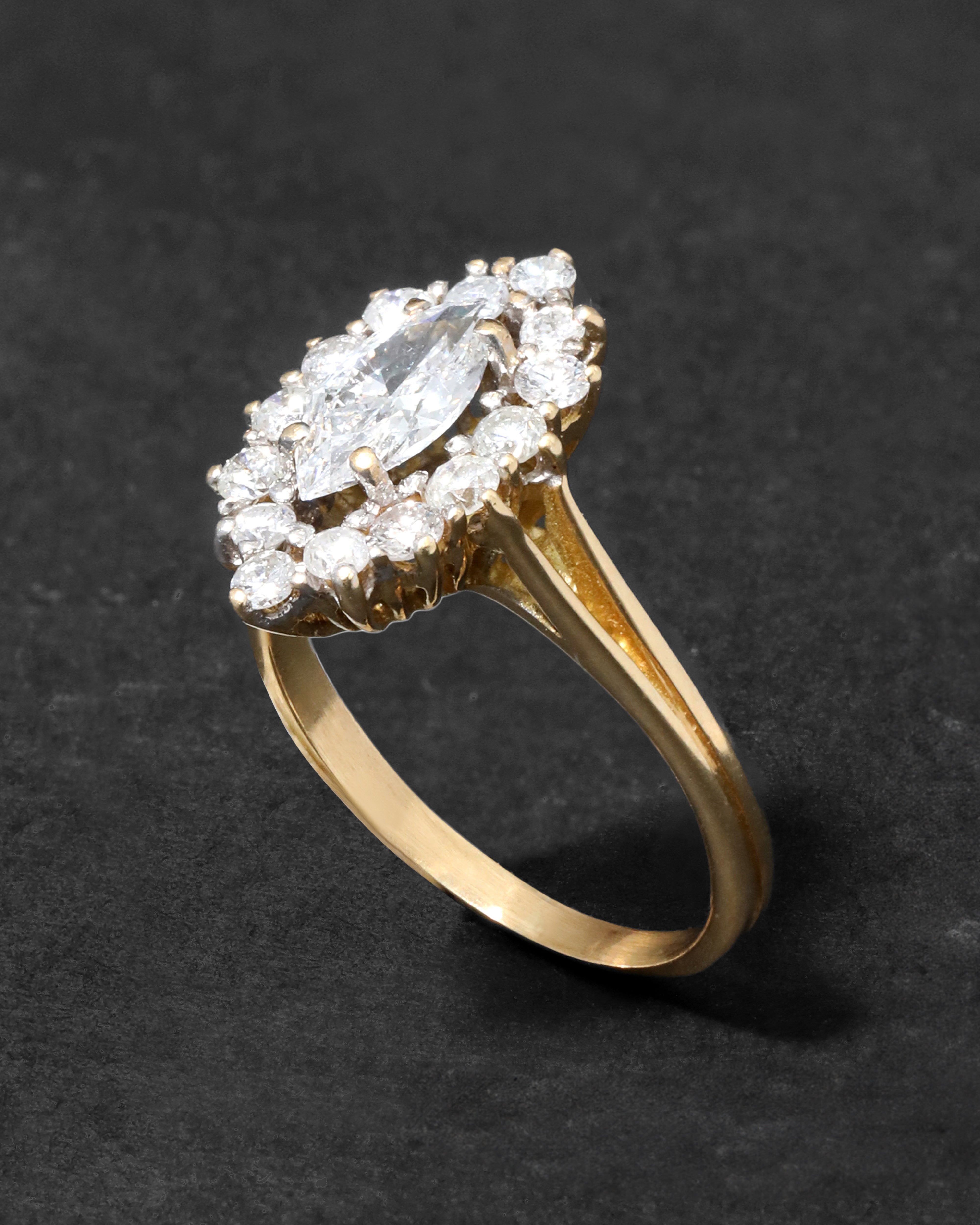 From the 1910s, this stunning 14k gold ring has a stunning natural diamond marquis center encircled by a halo of prong set diamonds.