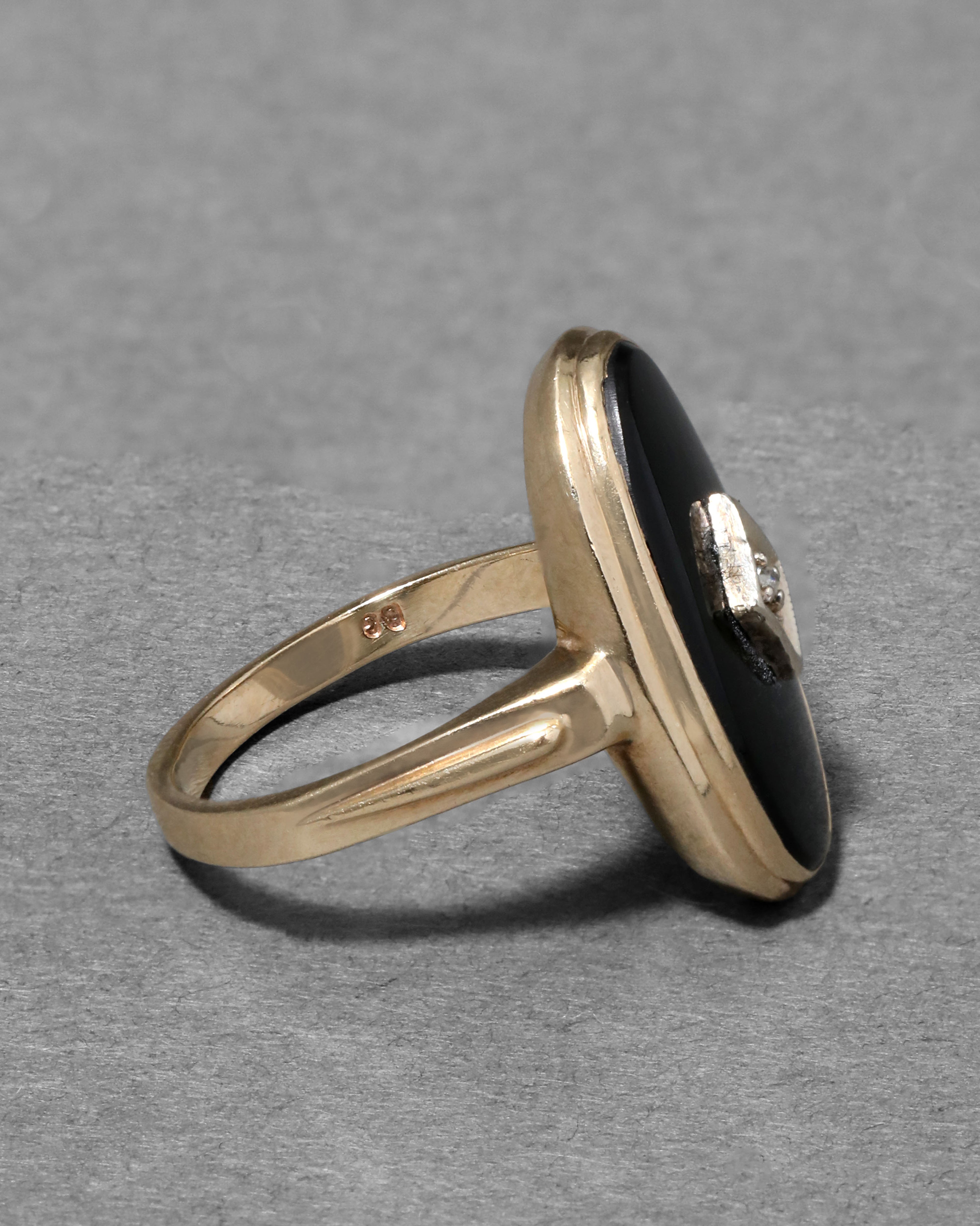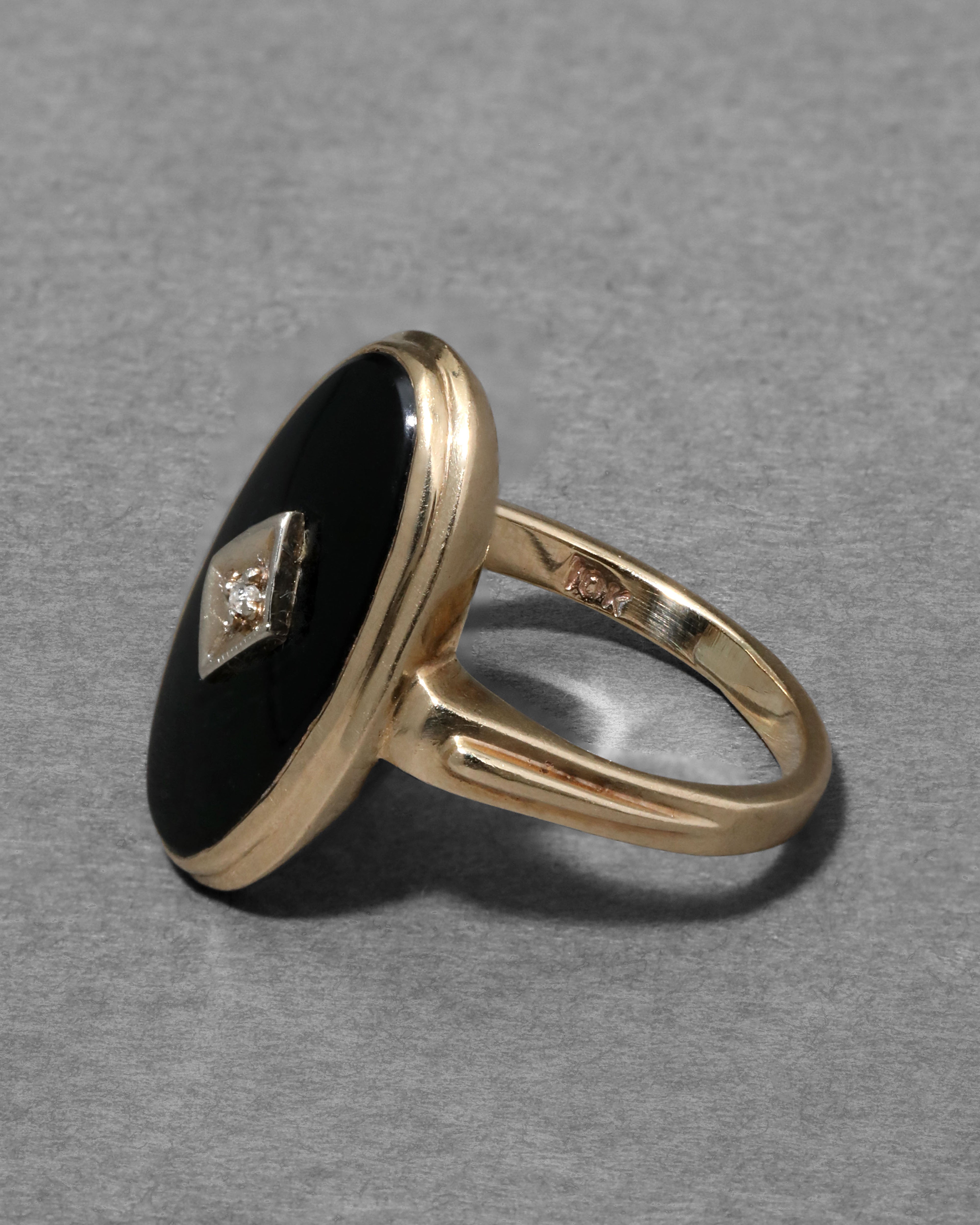 Classic 10k gold ring from the 1920s, with a prong set diamond in a white gold frame studded onto a sleek oval onyx base.