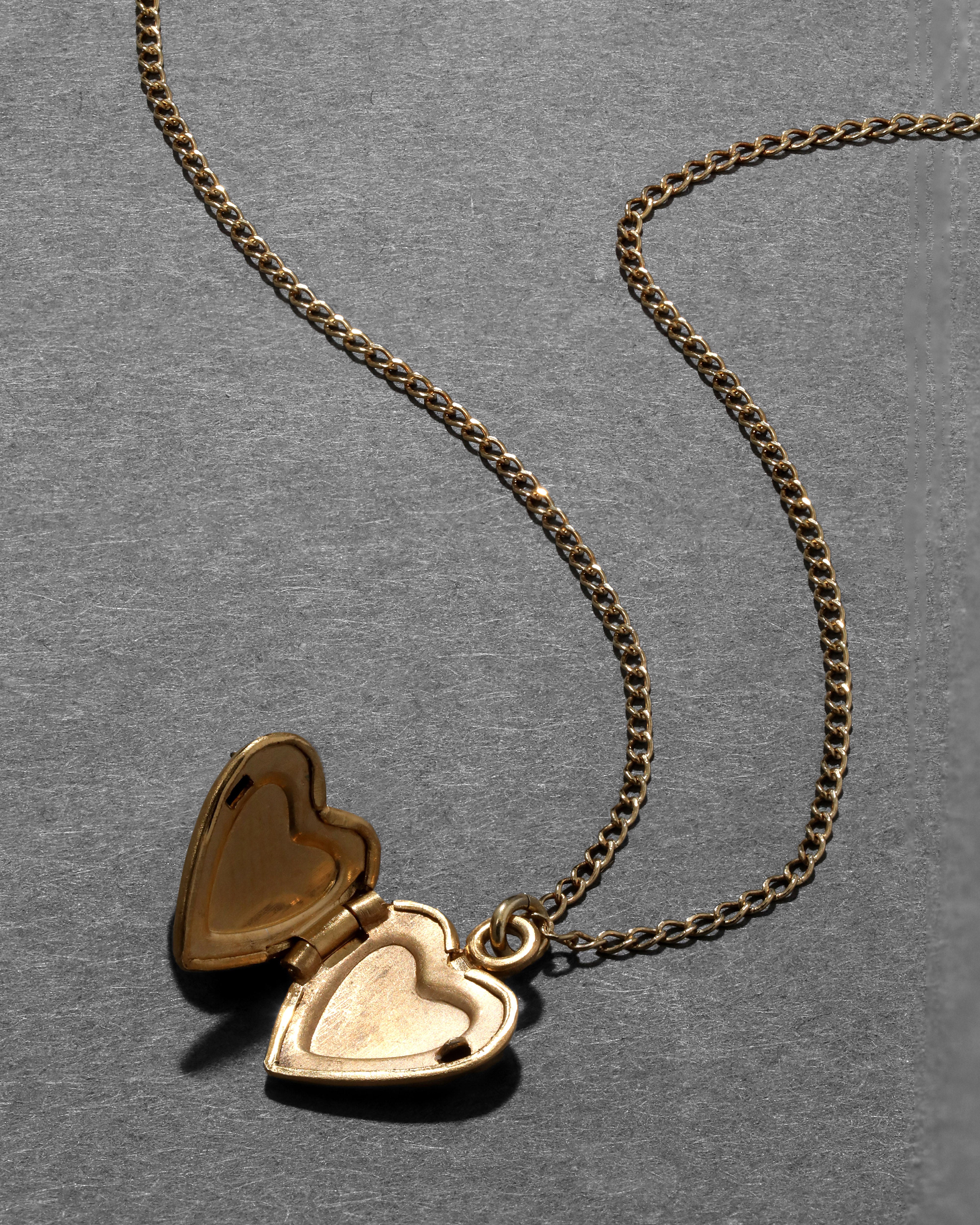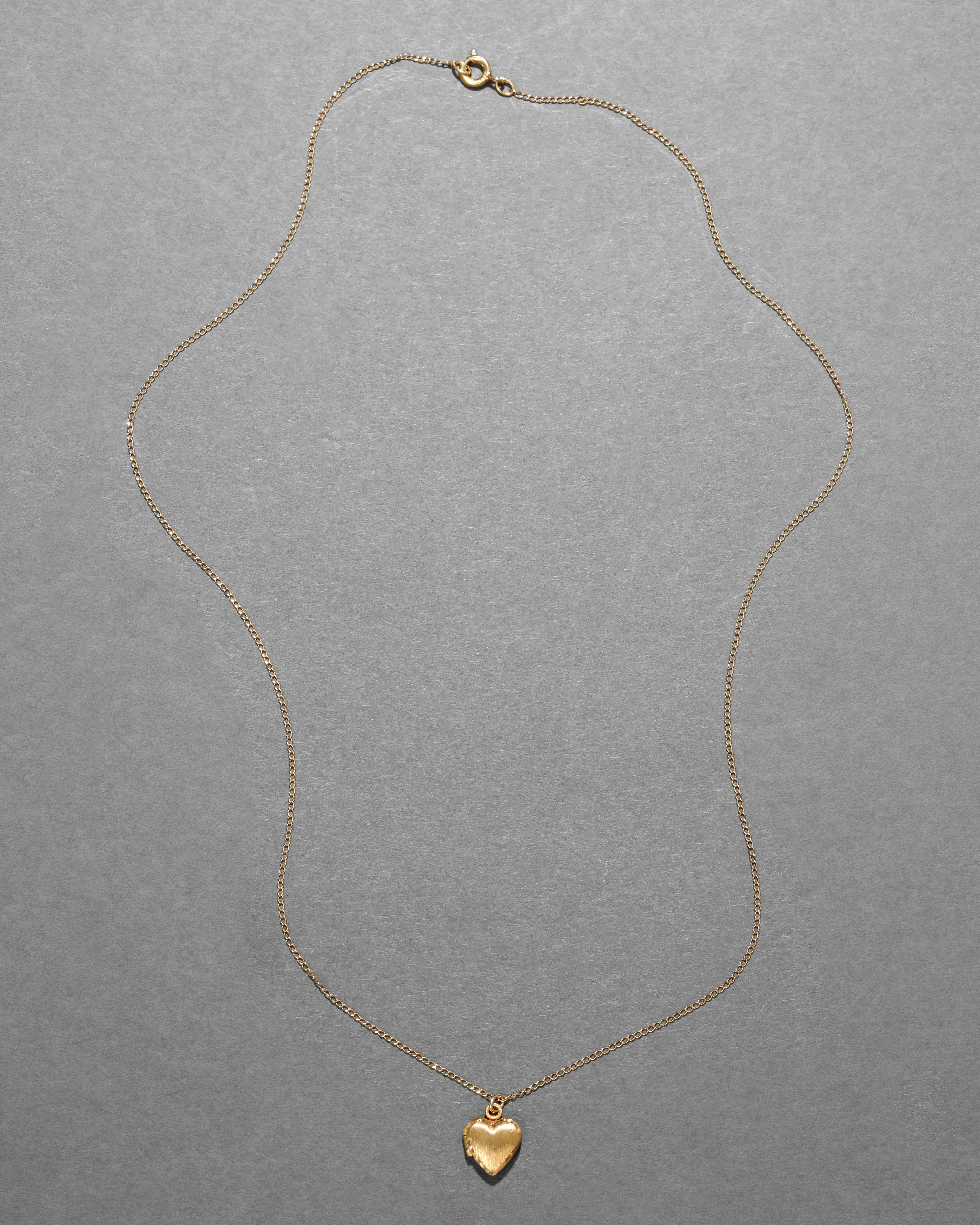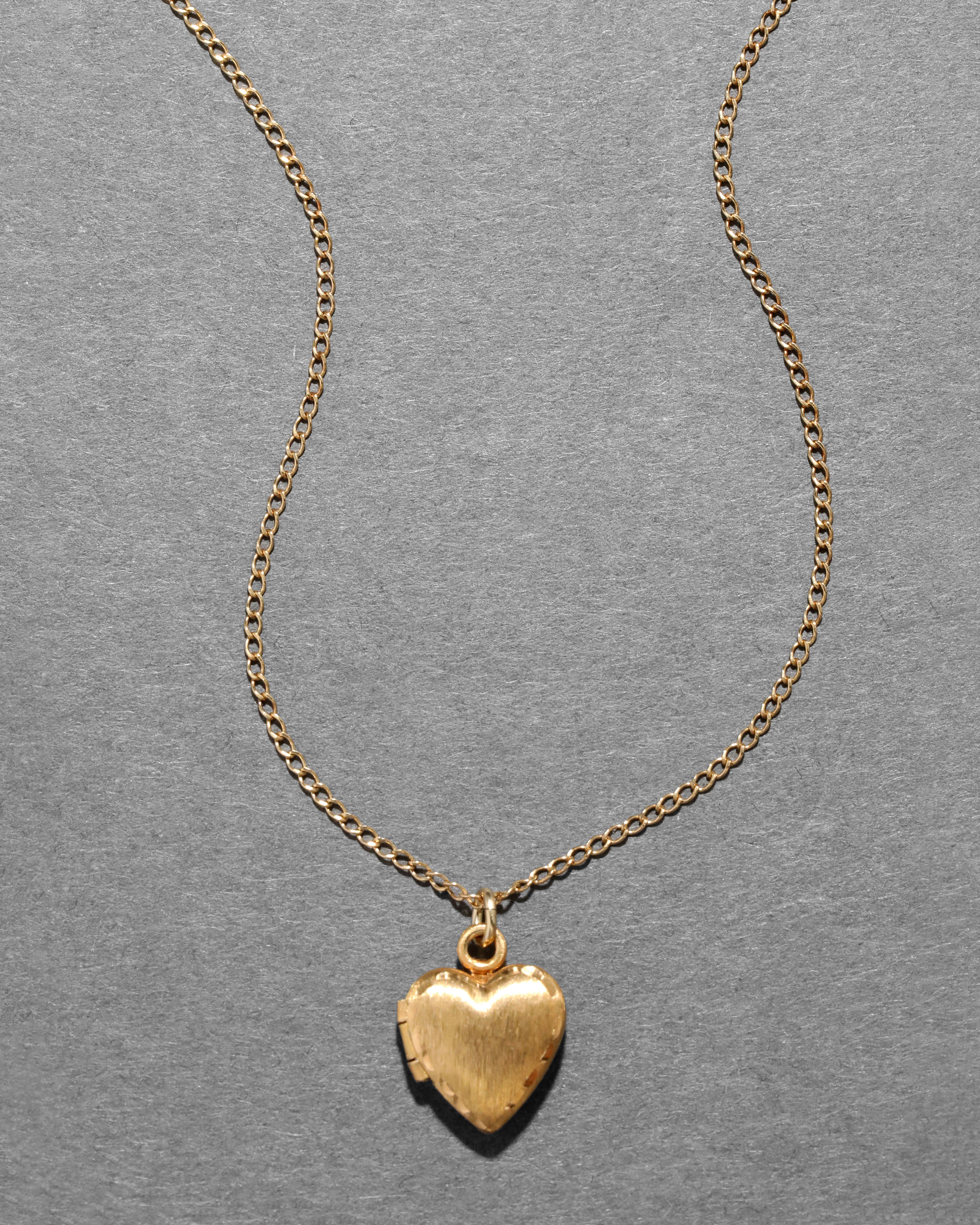 Charming miniature 12k gold fill baby heart locket from the 1920s, with a textured brush sheen on the face bordered by scalloped high-shine edges. Strung on a 14k gold fill chain.