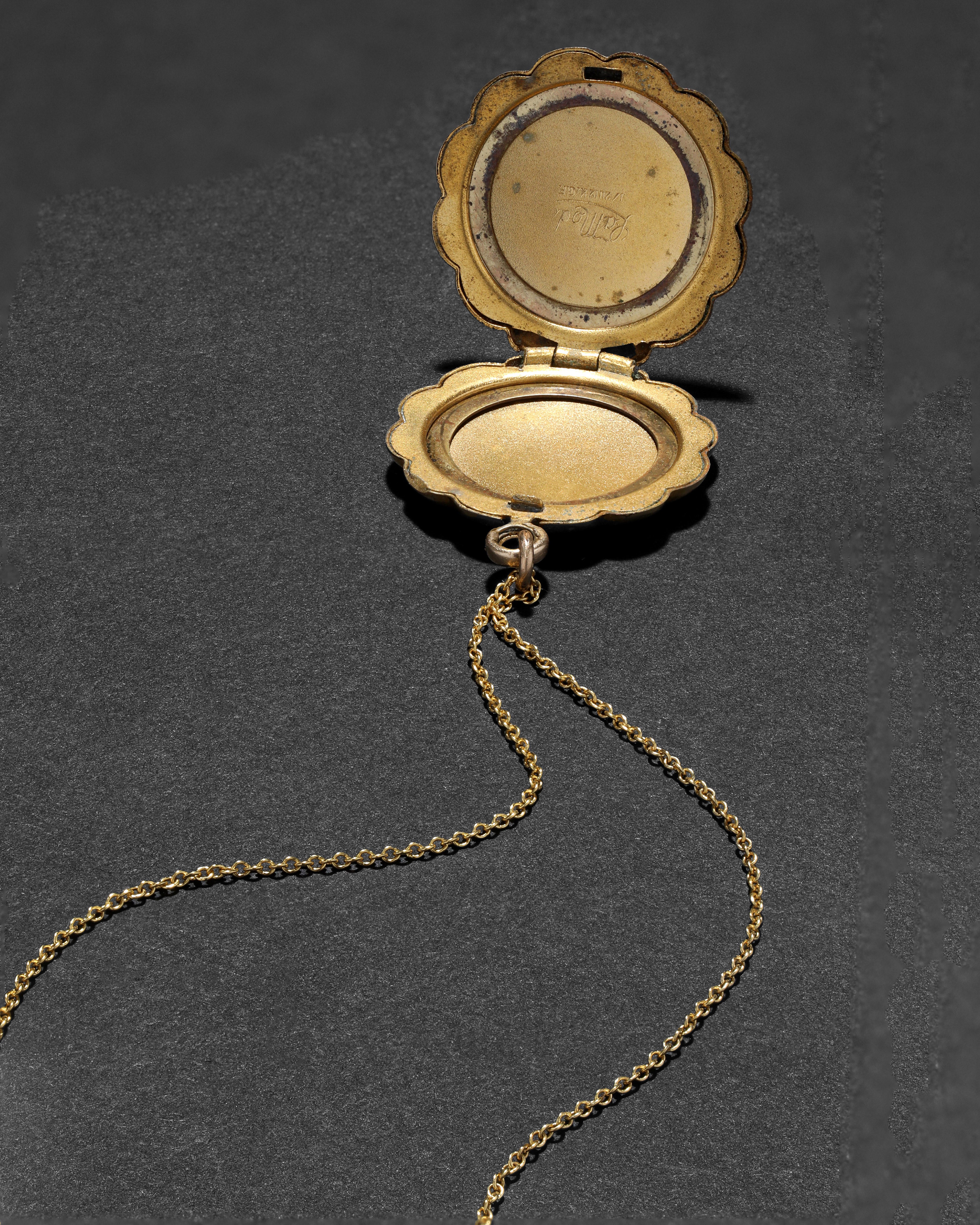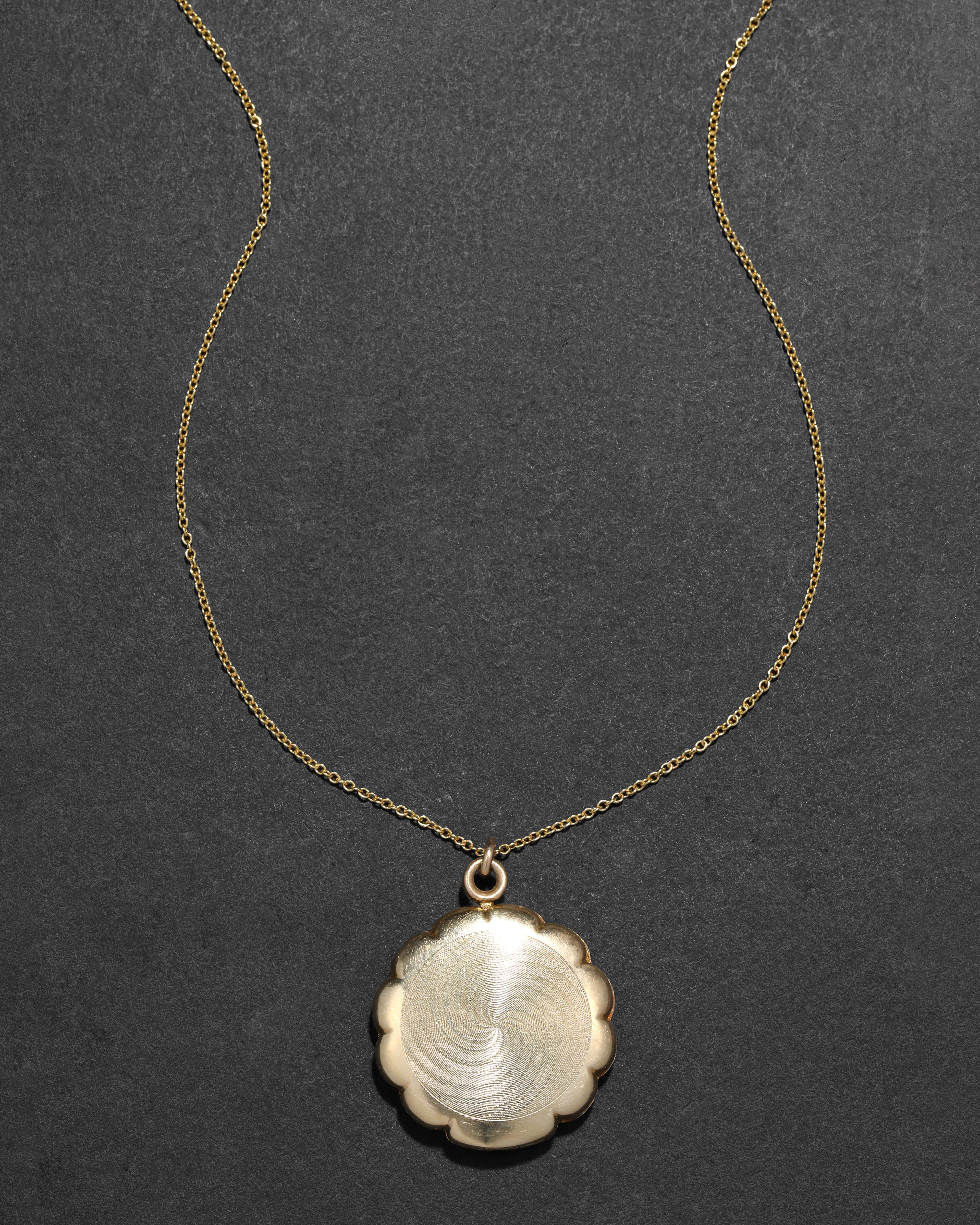 From the 1920s, this 12k gold filled locket has a unique scalloped edge with a classic floral motif etched onto the face. Strung on a 14k gold fill chain.