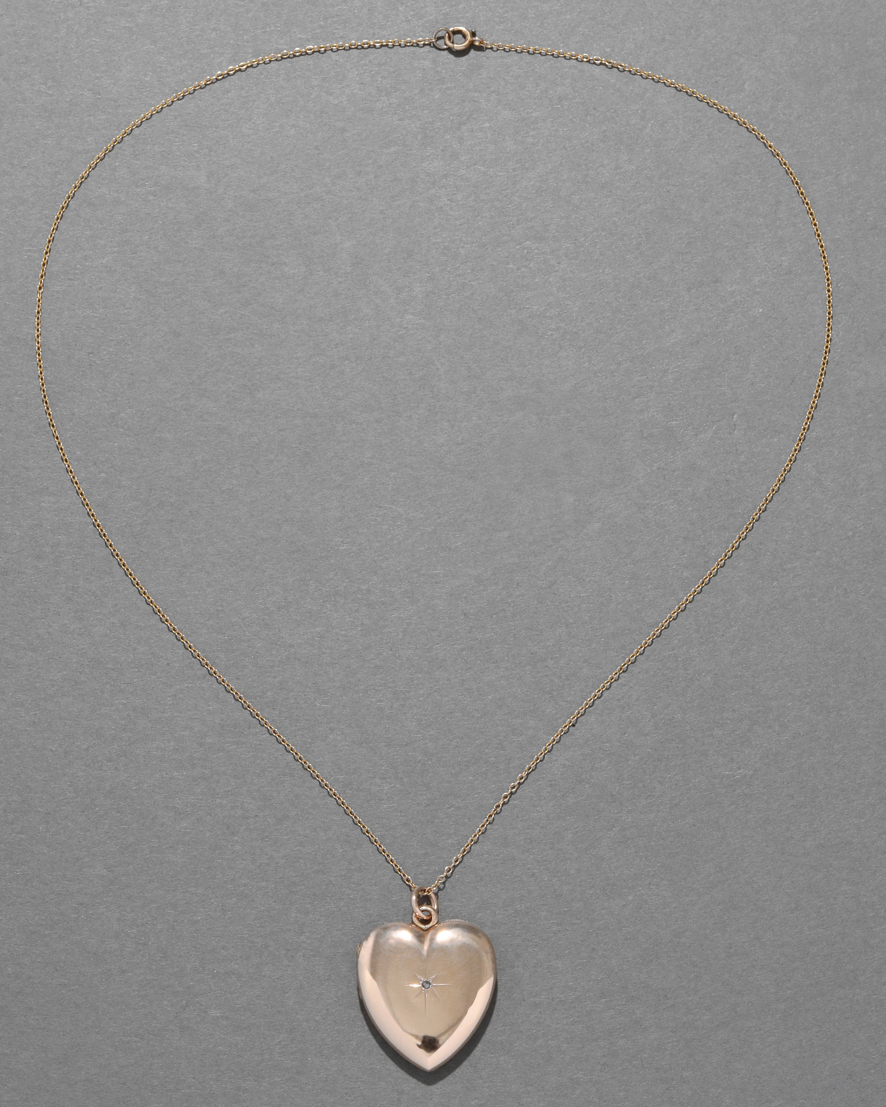 With a classic heart shaped silhouette, this high-shine 14k gold filled antique locket from the 1920s has hand-etched details and a crystal center in a starburst setting. Locket hangs on a 14k gold filled chain.