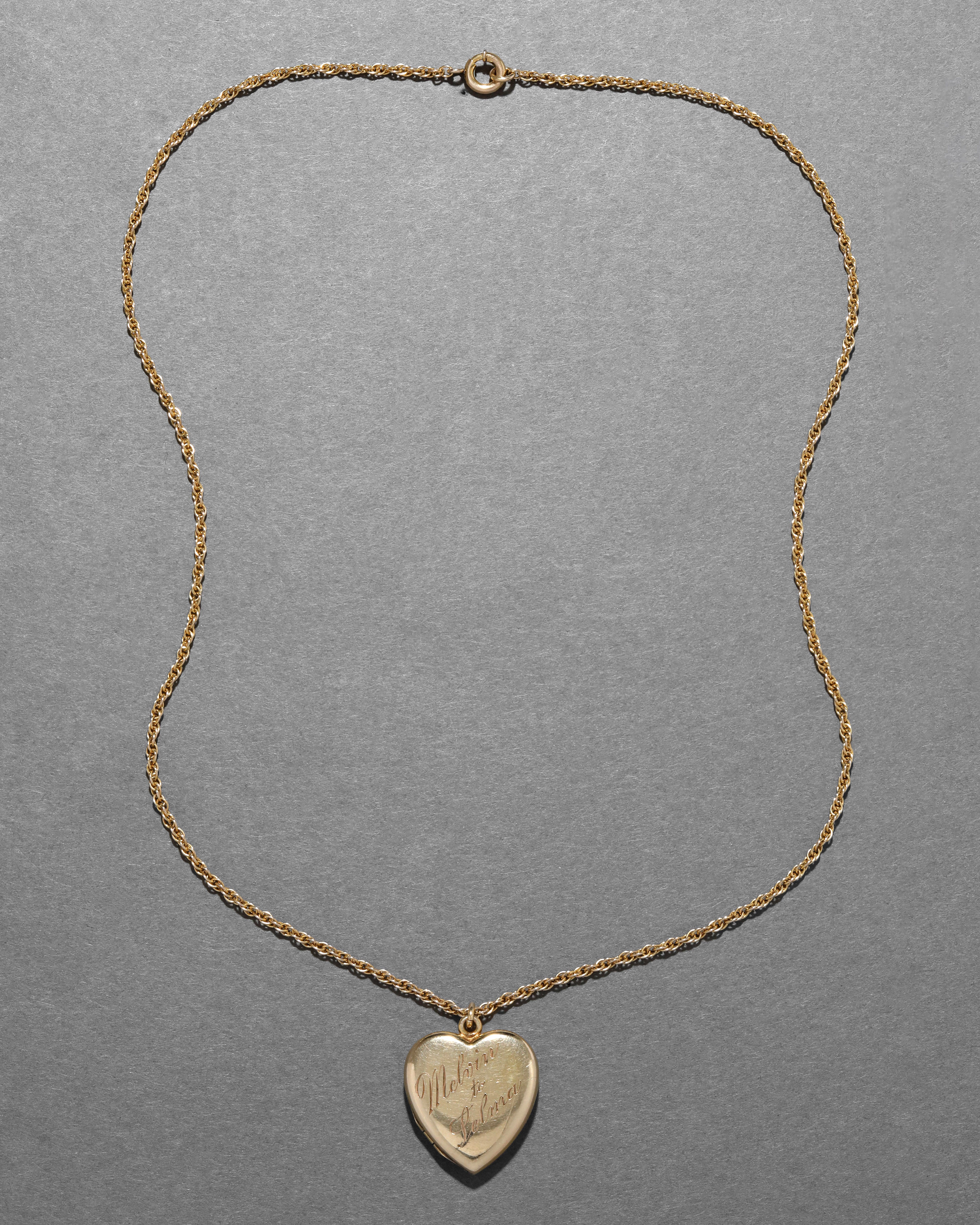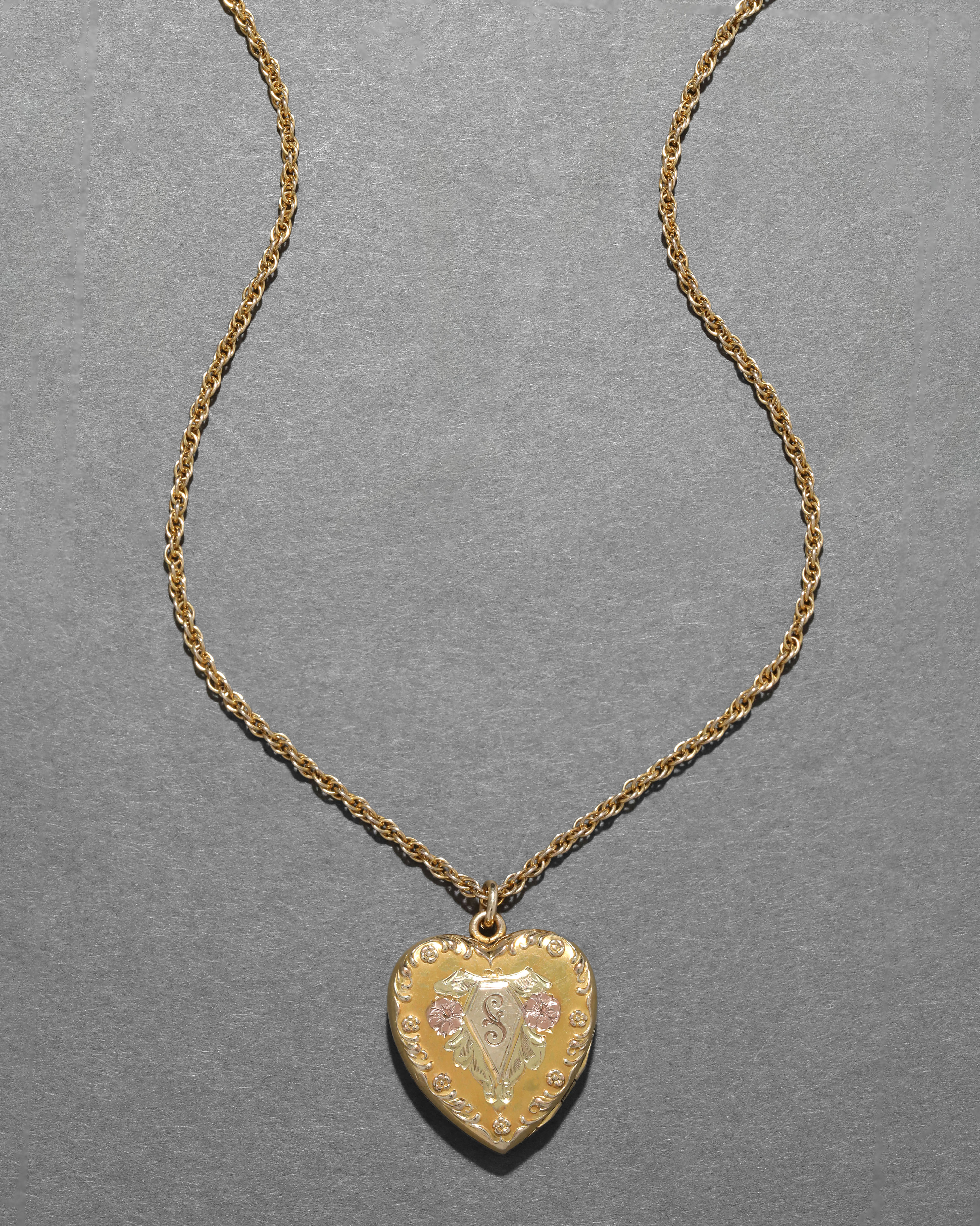 14k tri-color gold fill heart locket from the 1920s, with a center shield surrounded by a detailed floral motif. Strung on a 14k gold fill chain.