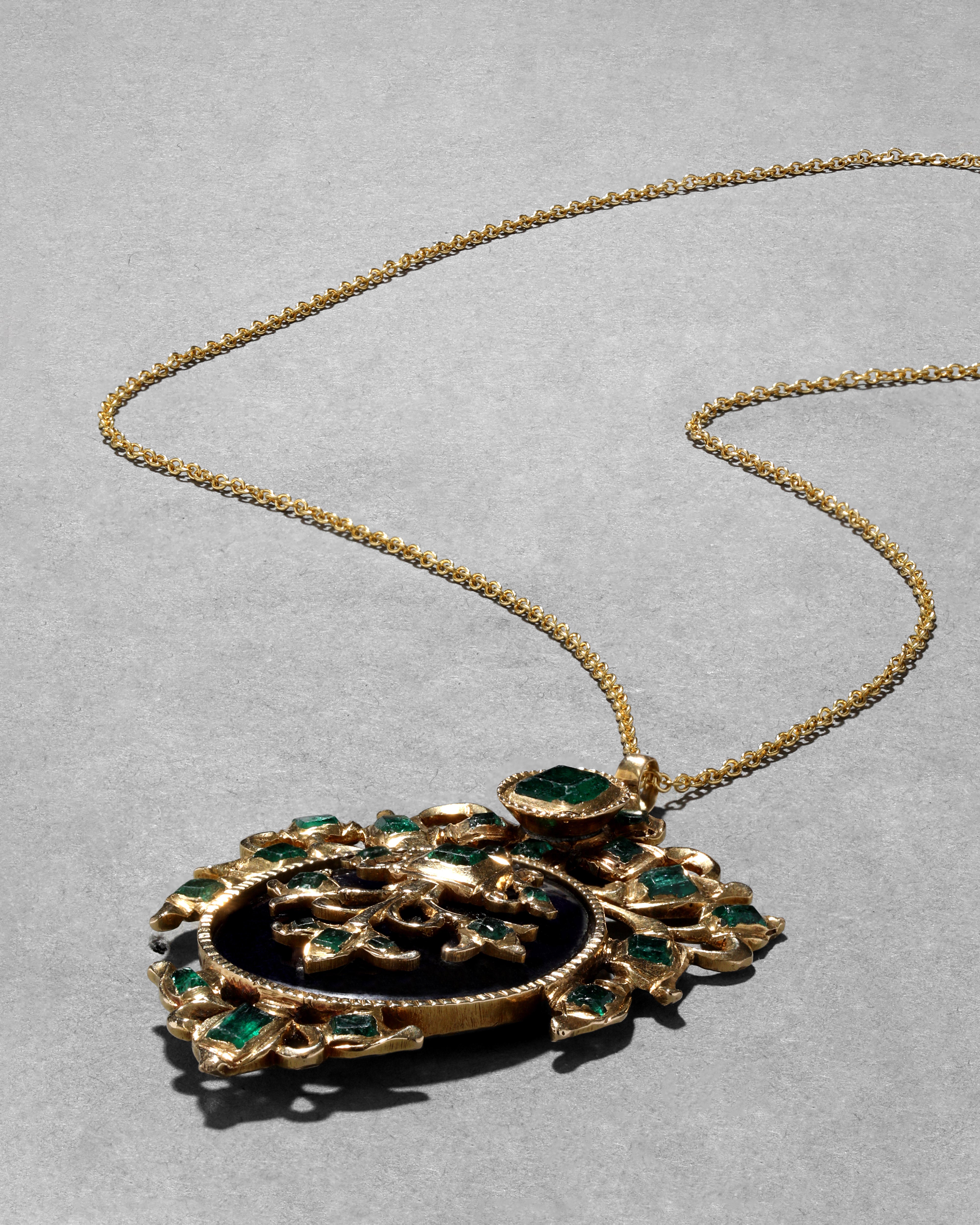 With a regal French medallion silhouette, this gorgeous 14k gold pendant dates from the early 1800s with a hand-enamel vibrant blue center and accented with an array of hand-cut emeralds throughout. Strung on a 14k gold fill chain.
