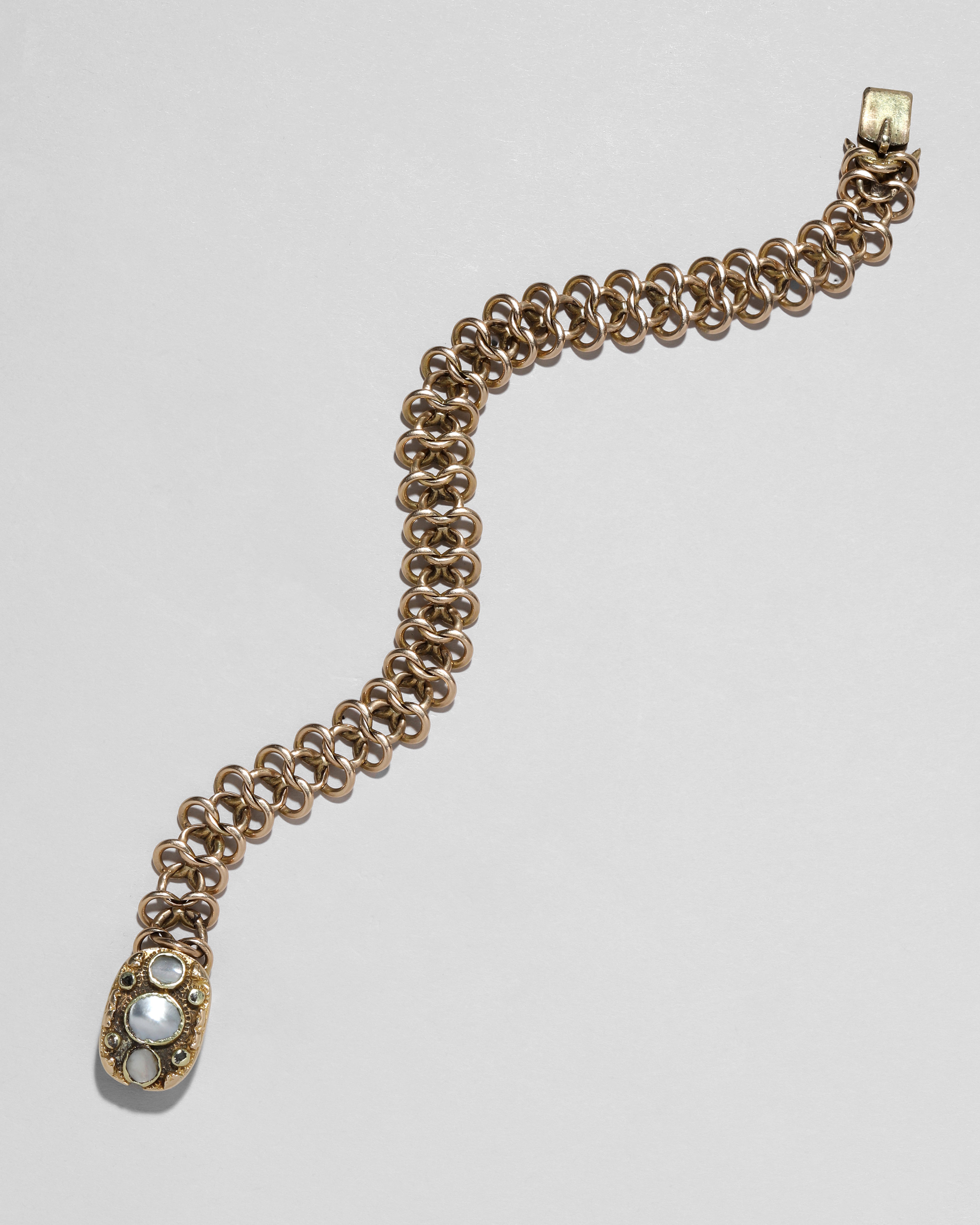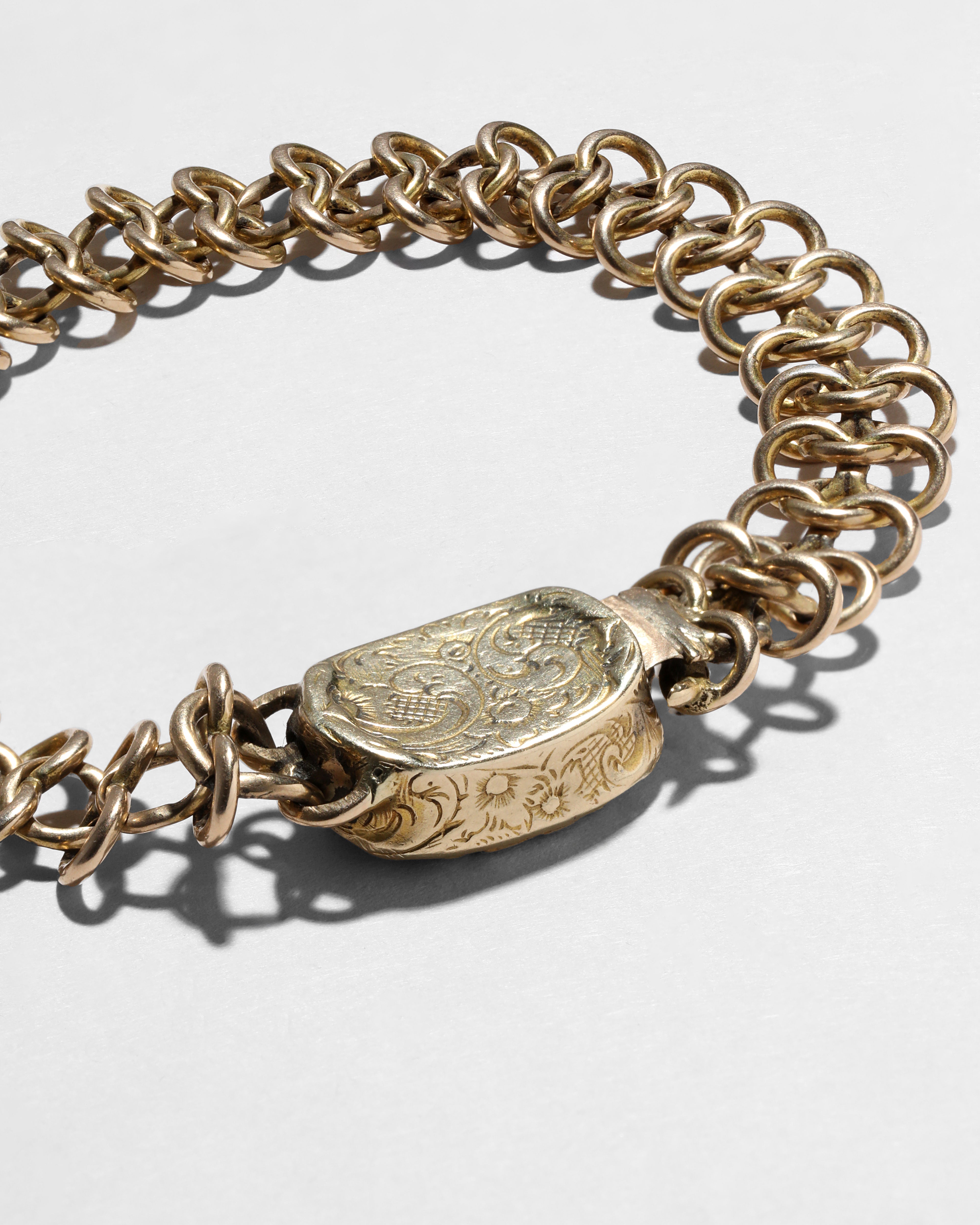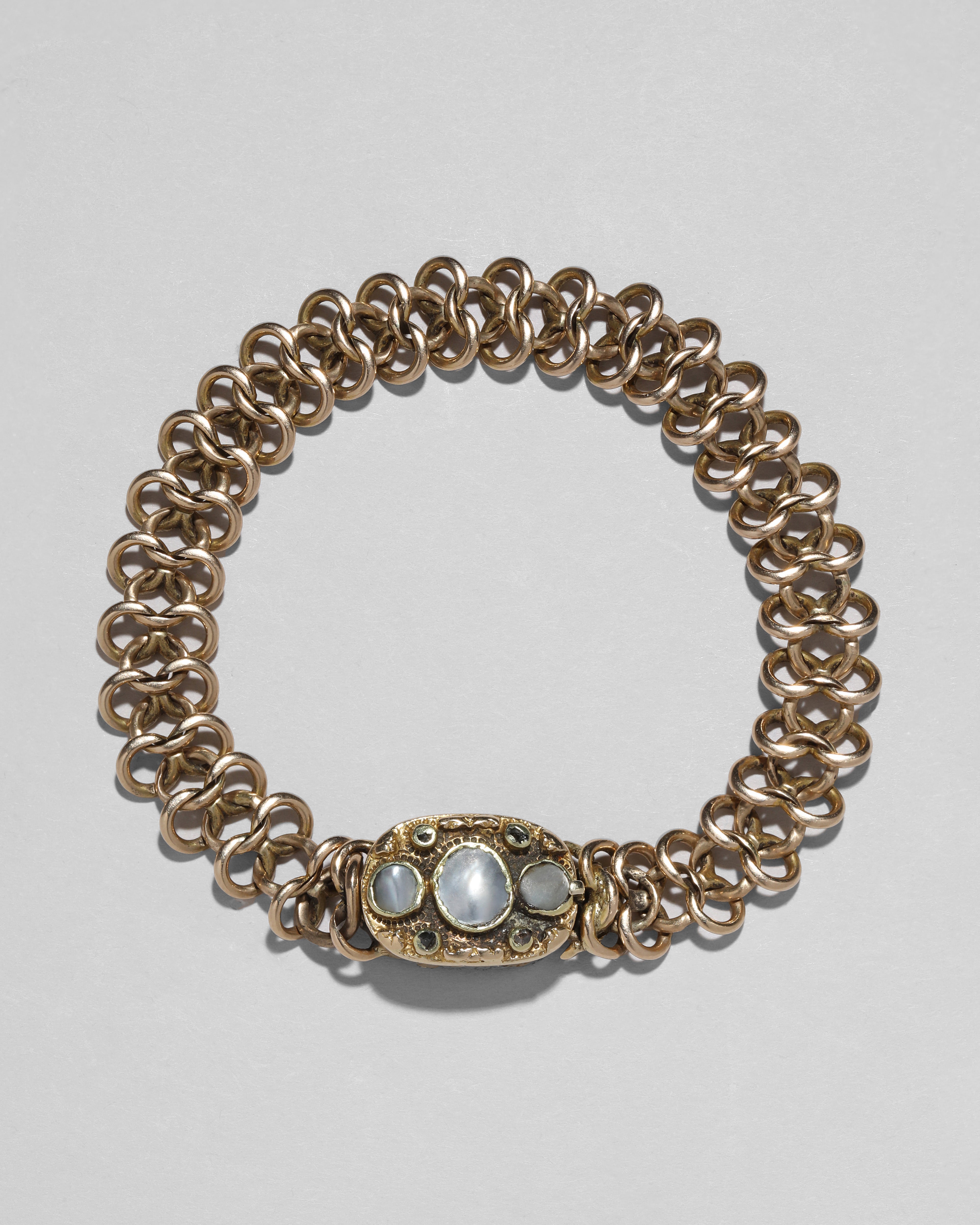 With a unique hand engraved clasp accented with lustrous mother of pearl cabochons and diamonds, this 14k gold double circle link bracelet dates from the early 1800s. A beautiful example of antique jewelry making and makes a truly elegant statement on any wrist.