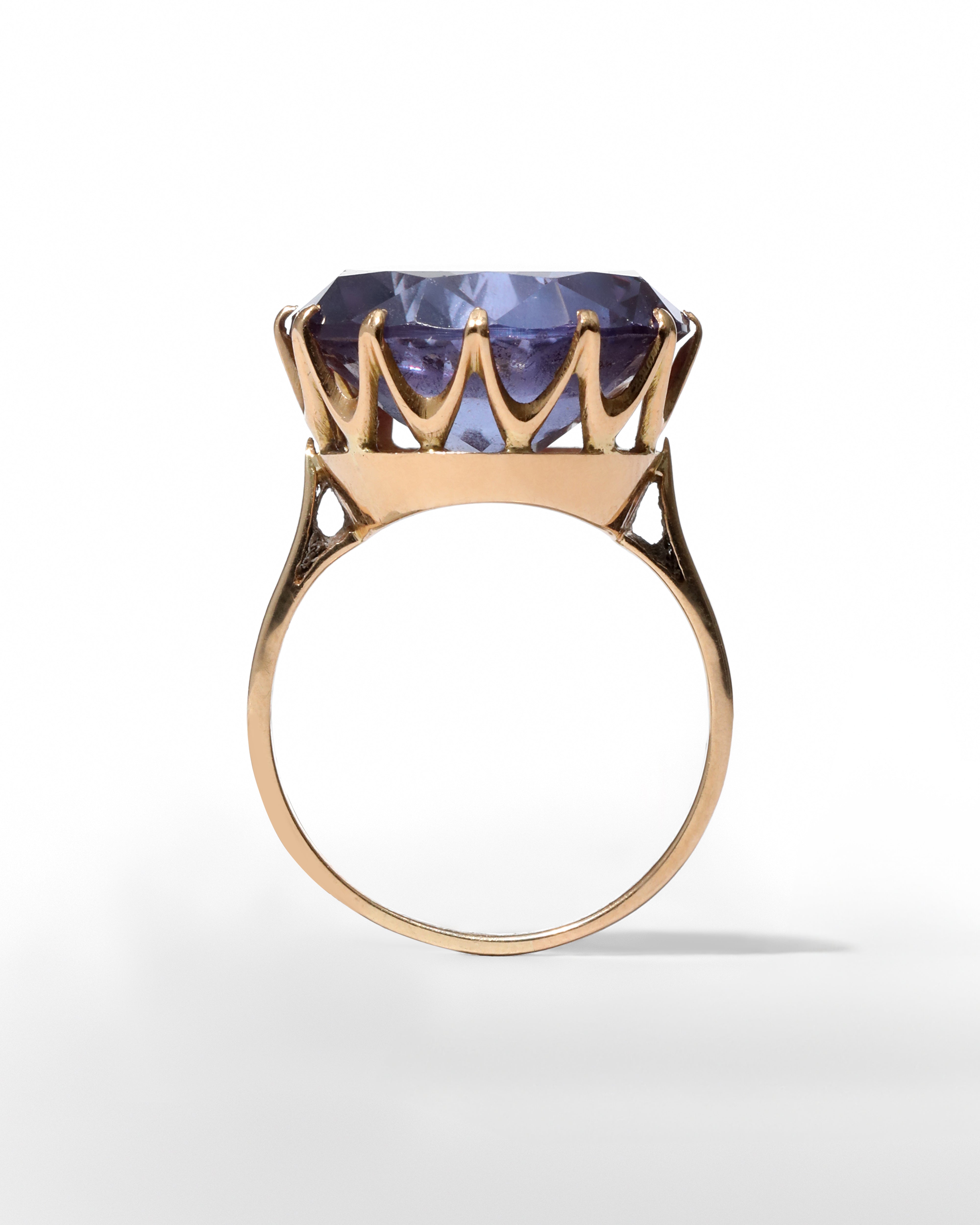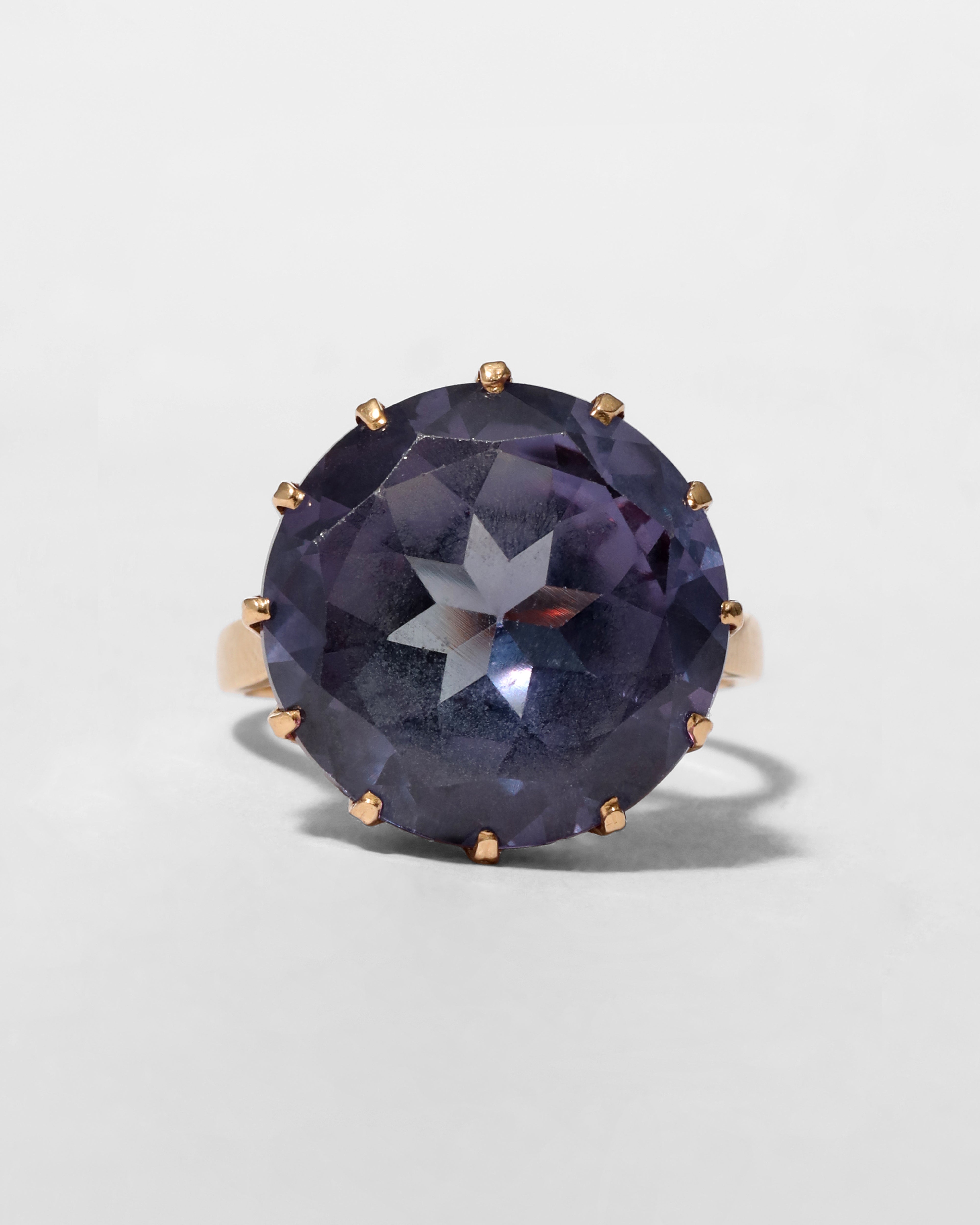 From the early 1900s, this 10k gold ring has a lustrous Alexandrite tone crystal in a elegant crown prong setting.