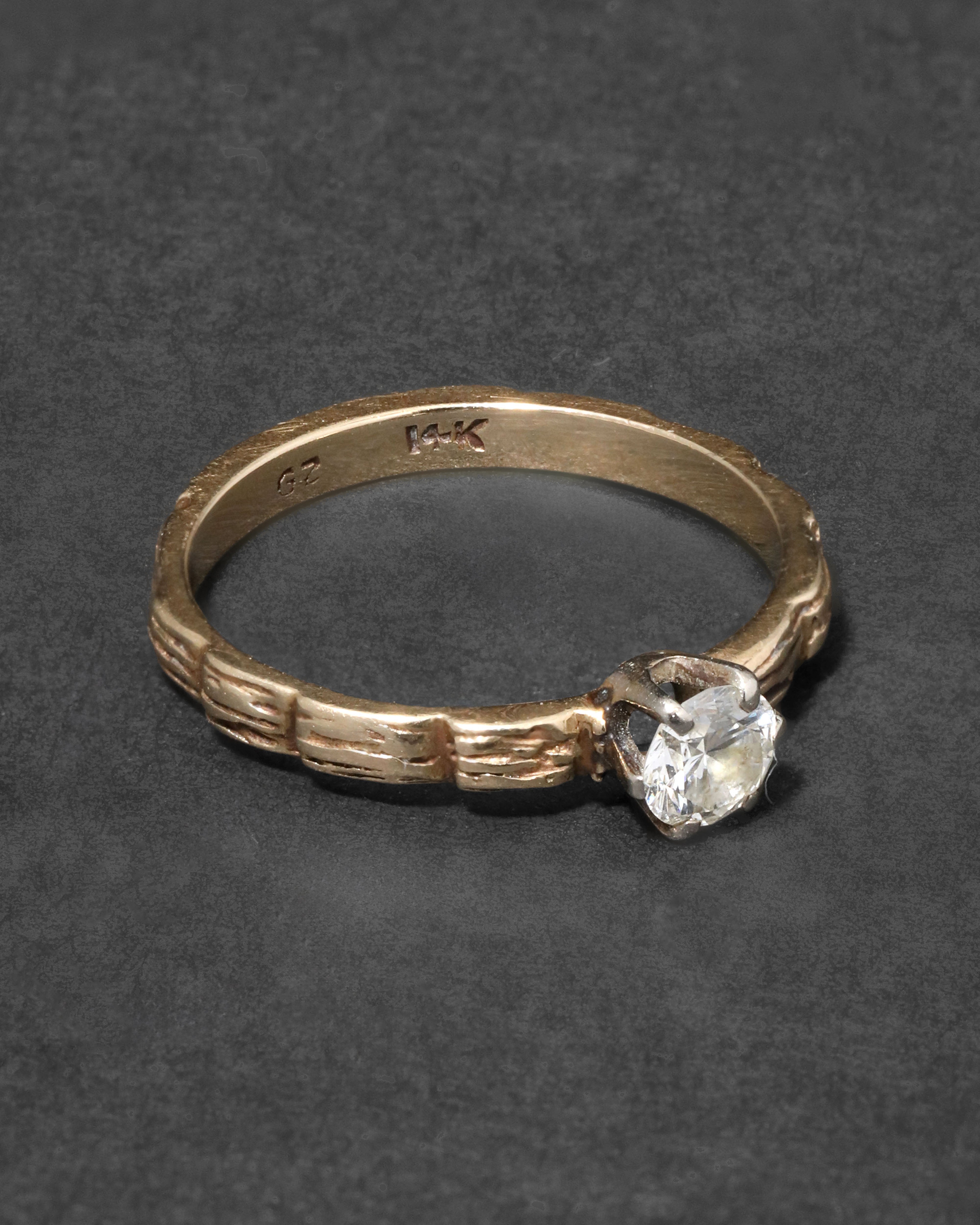 From the early 1900s, this 14k gold ring has a beautifully faceted .25 carat diamond crown set onto a wood-grain inspired textural tiered band.