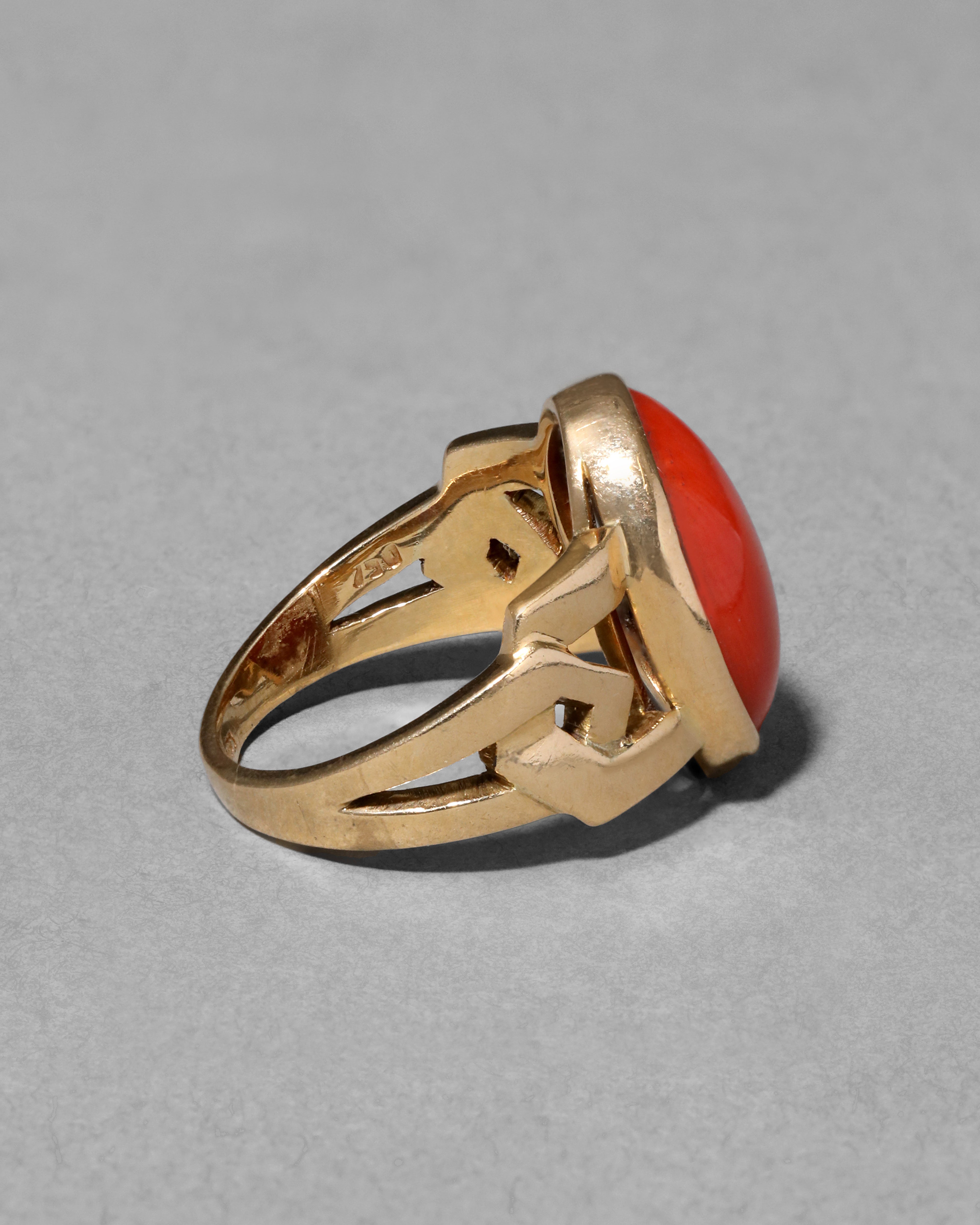 This fiery 18k gold ring from the Edwardian 1910s has a vibrant coral cabochon center, shouldered by an interlocking motif band of open metalwork.