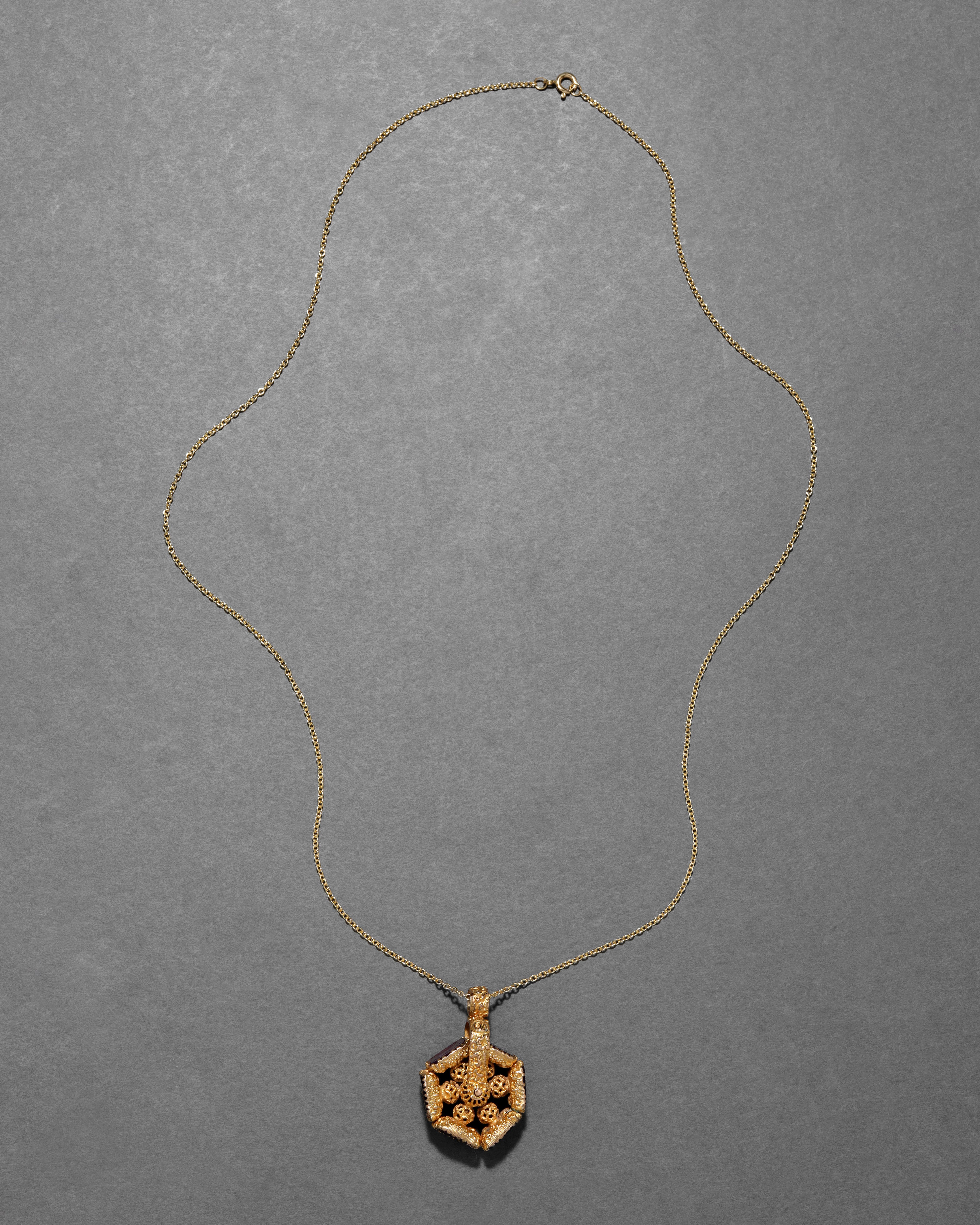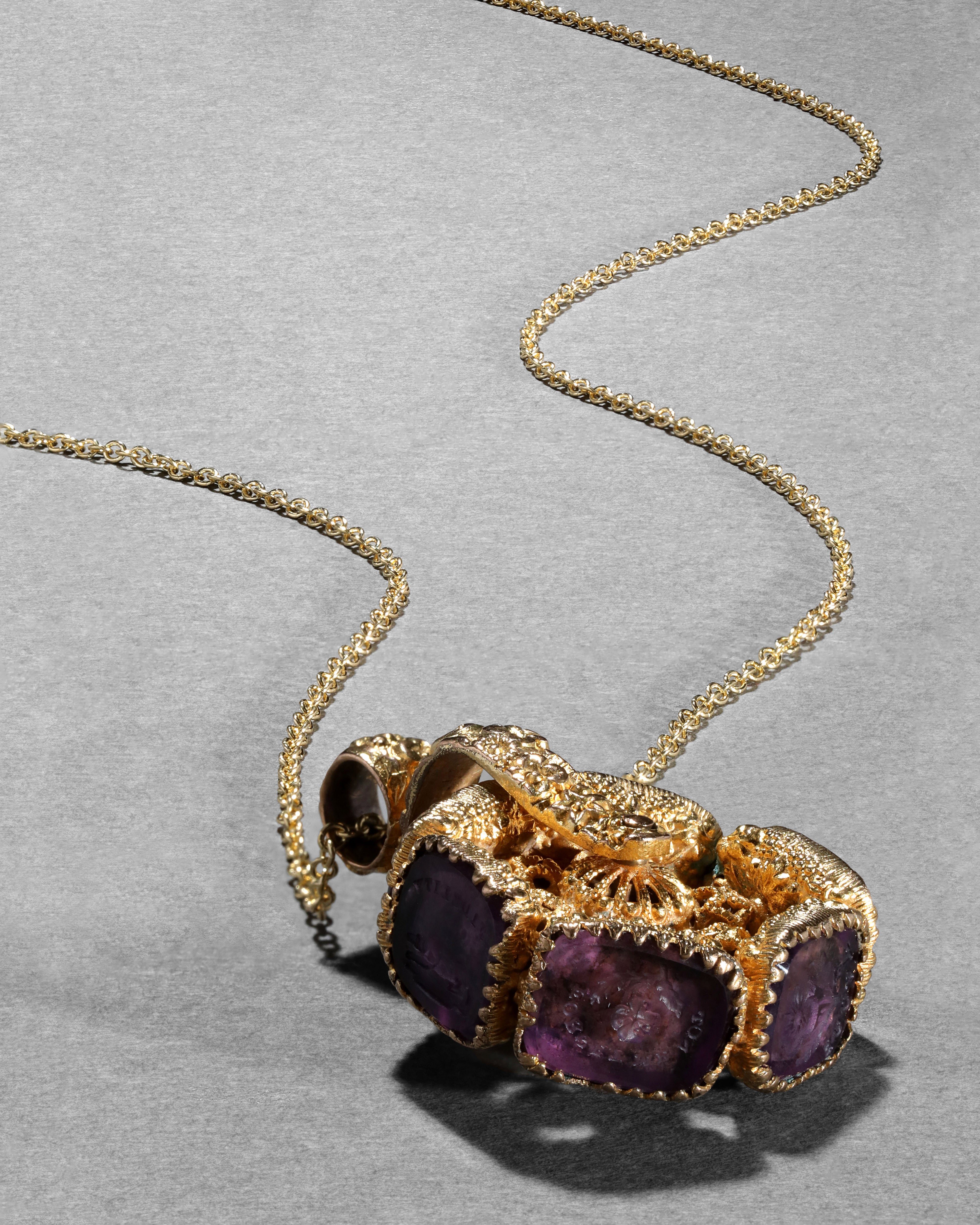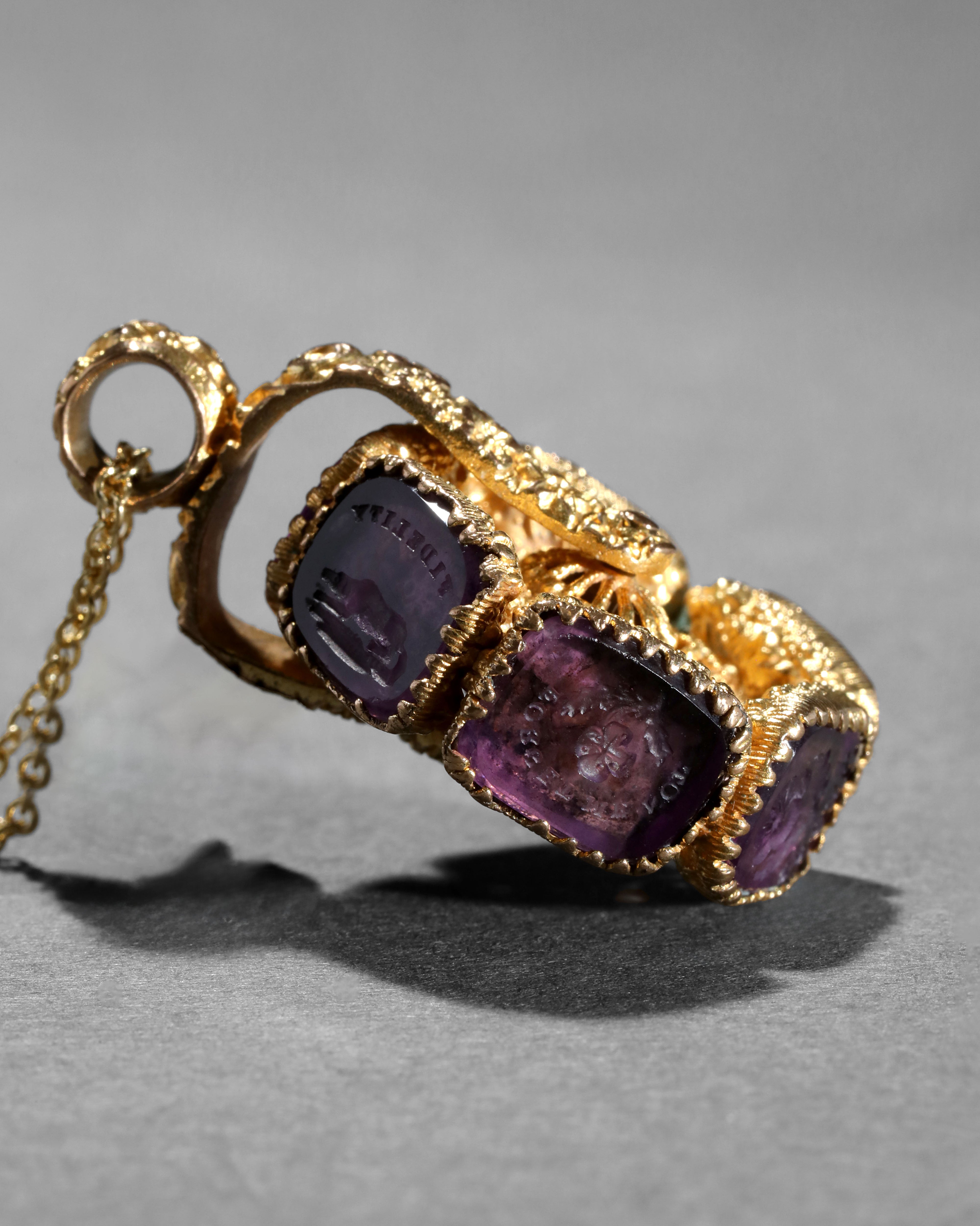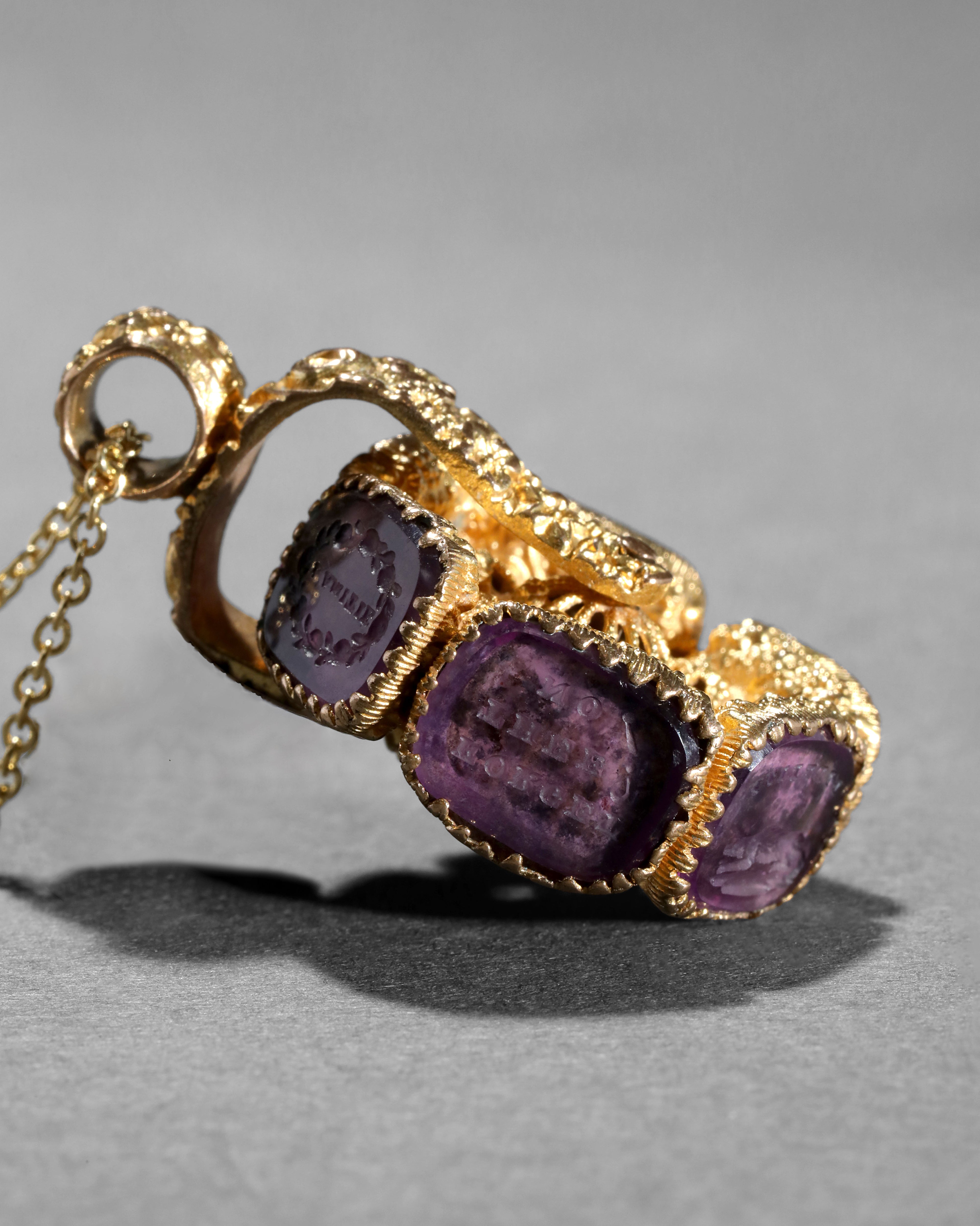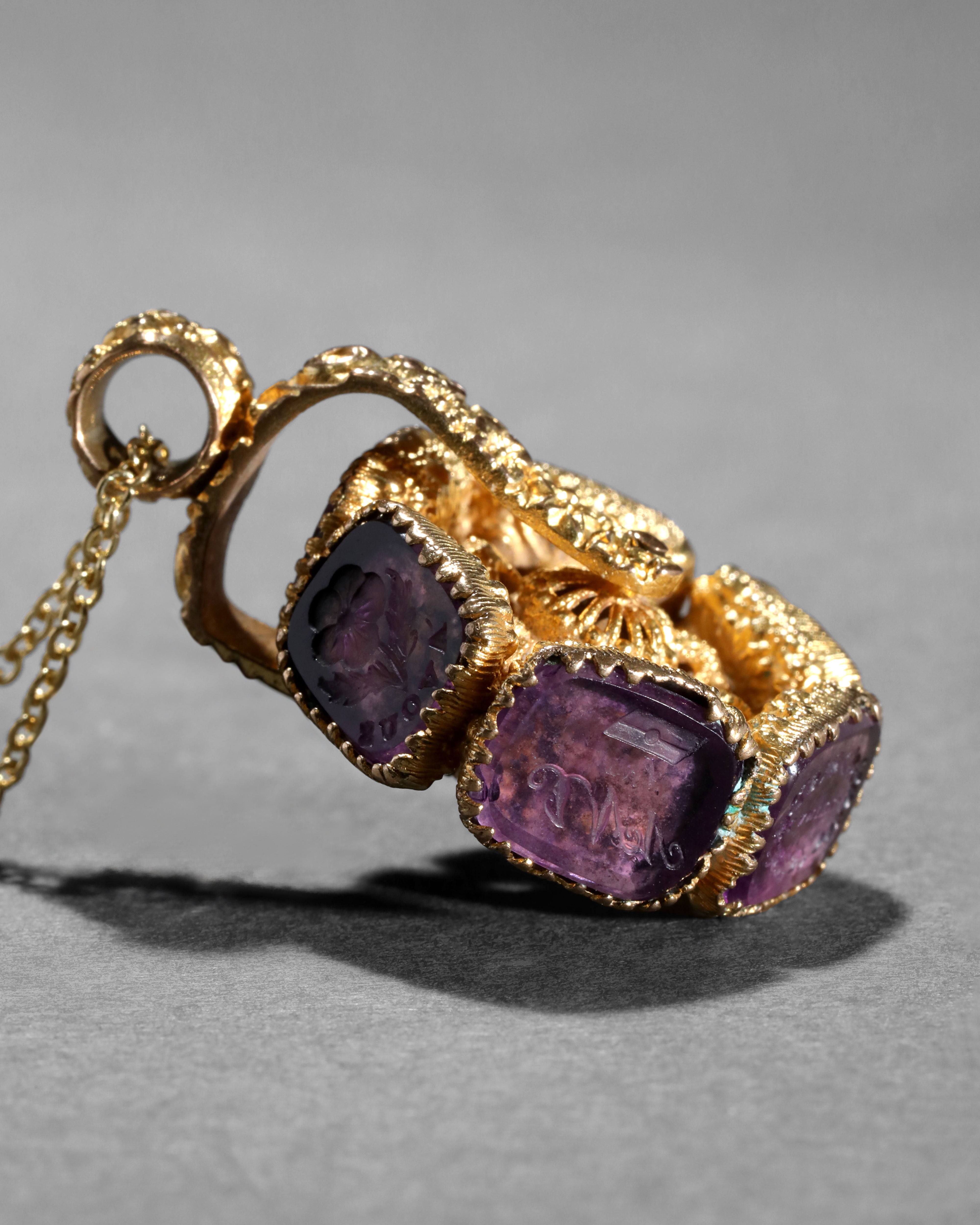 Exceptional & meticulously detailed gold plated silver wheel fob pendant from the Georgian 1860s. Adorned with prong set amethyst stones hand-etched with various symbols & motifs. A truly covetable relic and gorgeous example of antique jewelry making, fobs were commonly use to wax seal or stamp stationary during the period. Strung on a 14k gold fill chain.