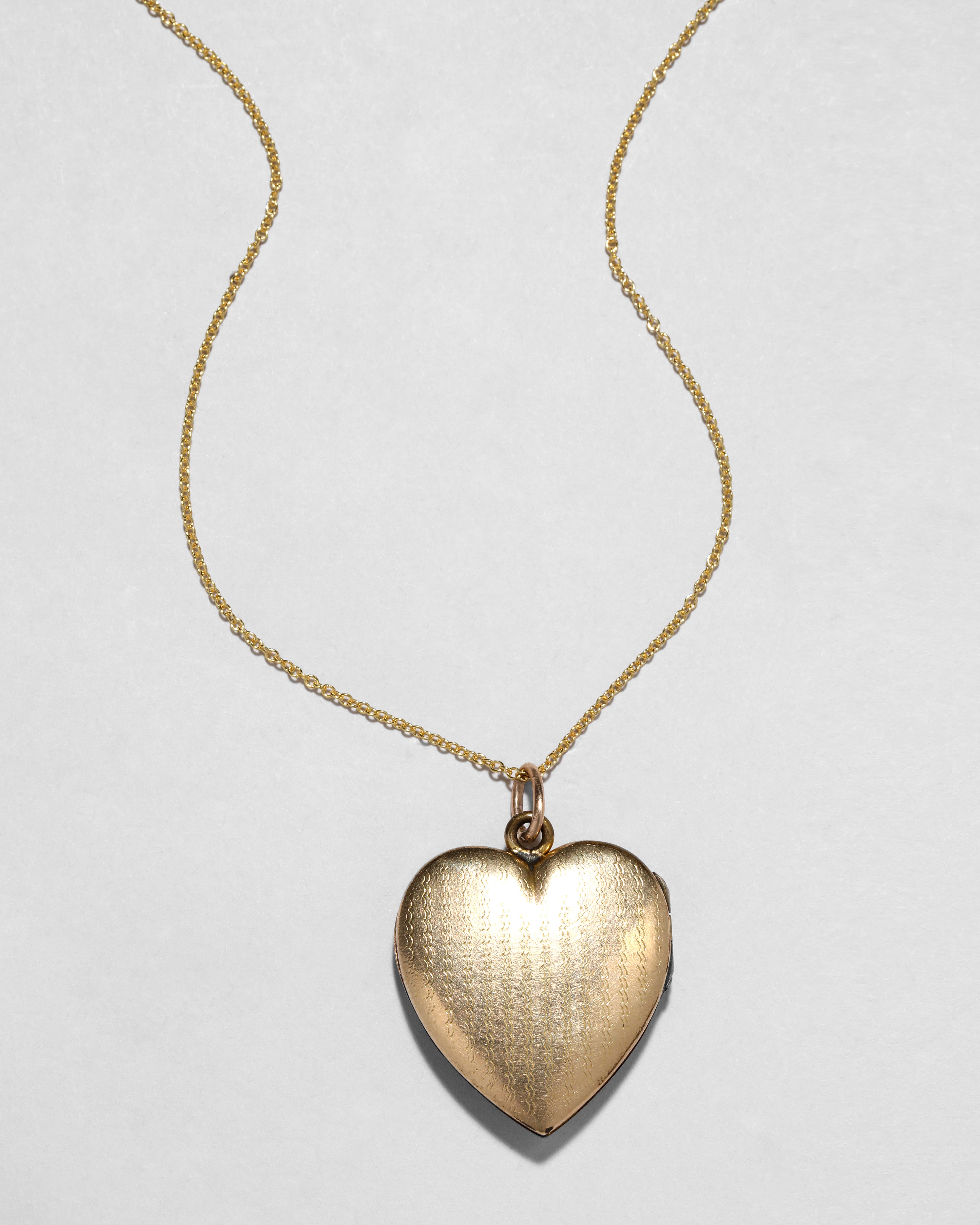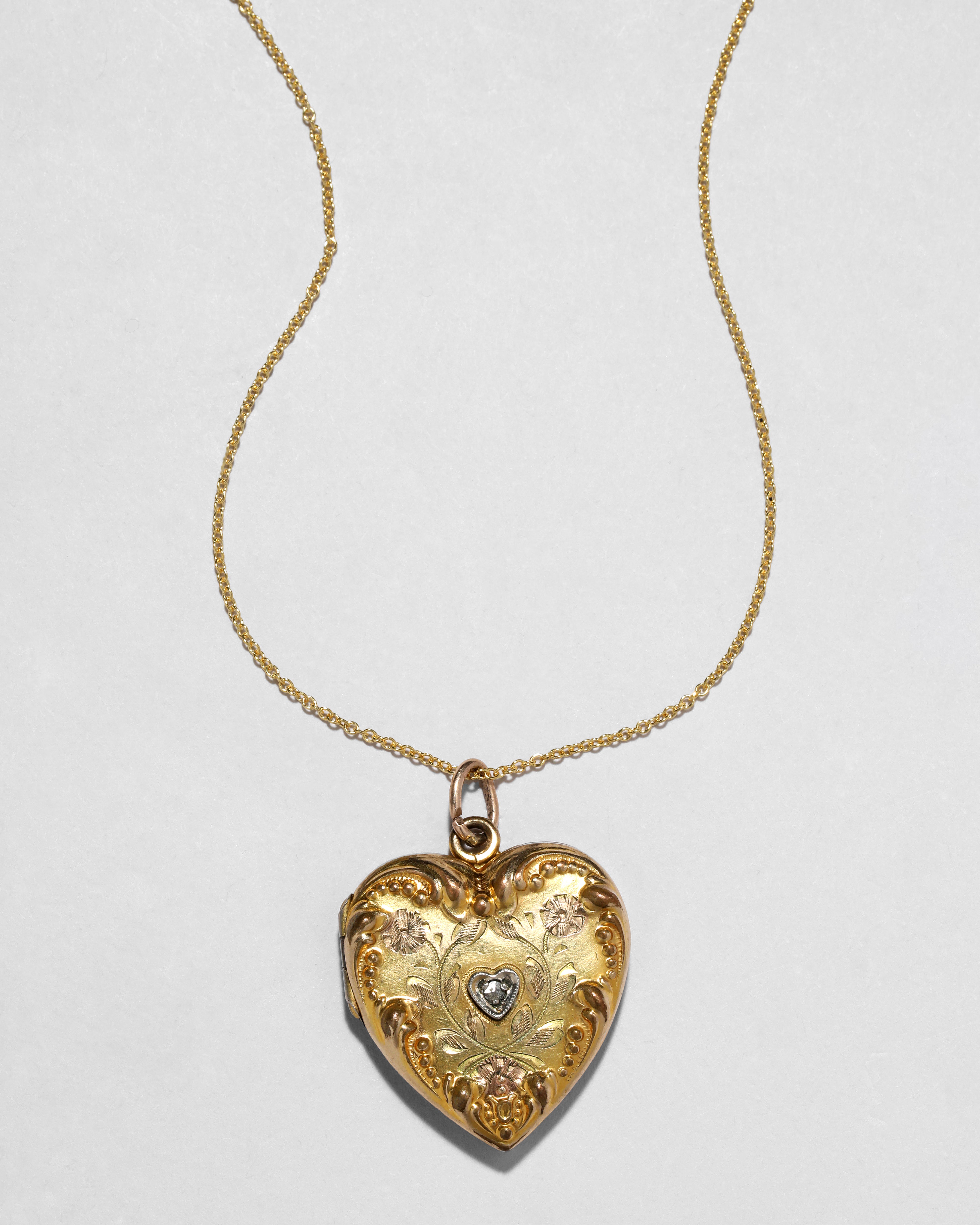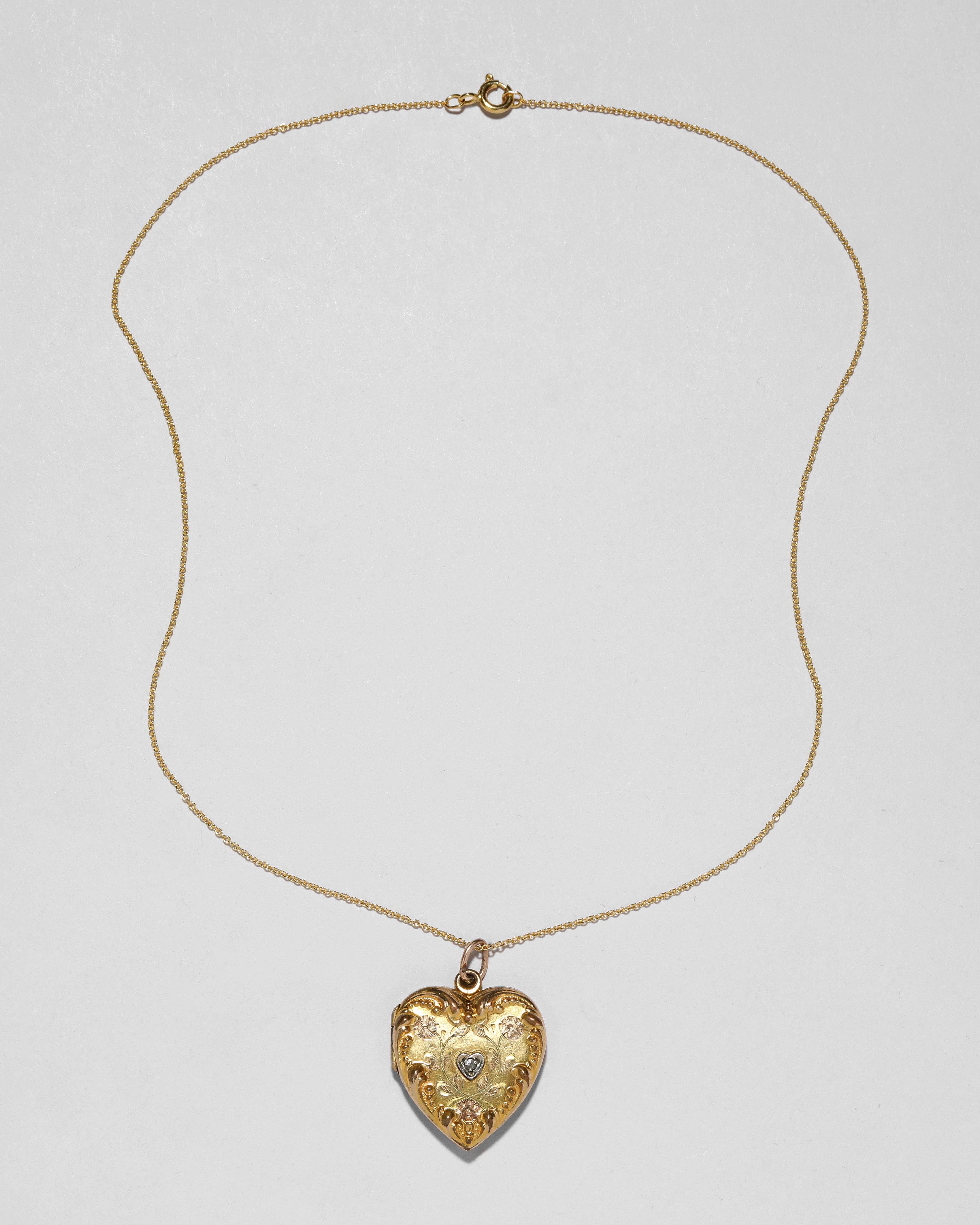 Elaborate 14k gold fill heart locket from the Art Nouveau 1800s, with a meticulously detailed hand-etched floral motif design. Strung on a 14k gold fill chain.