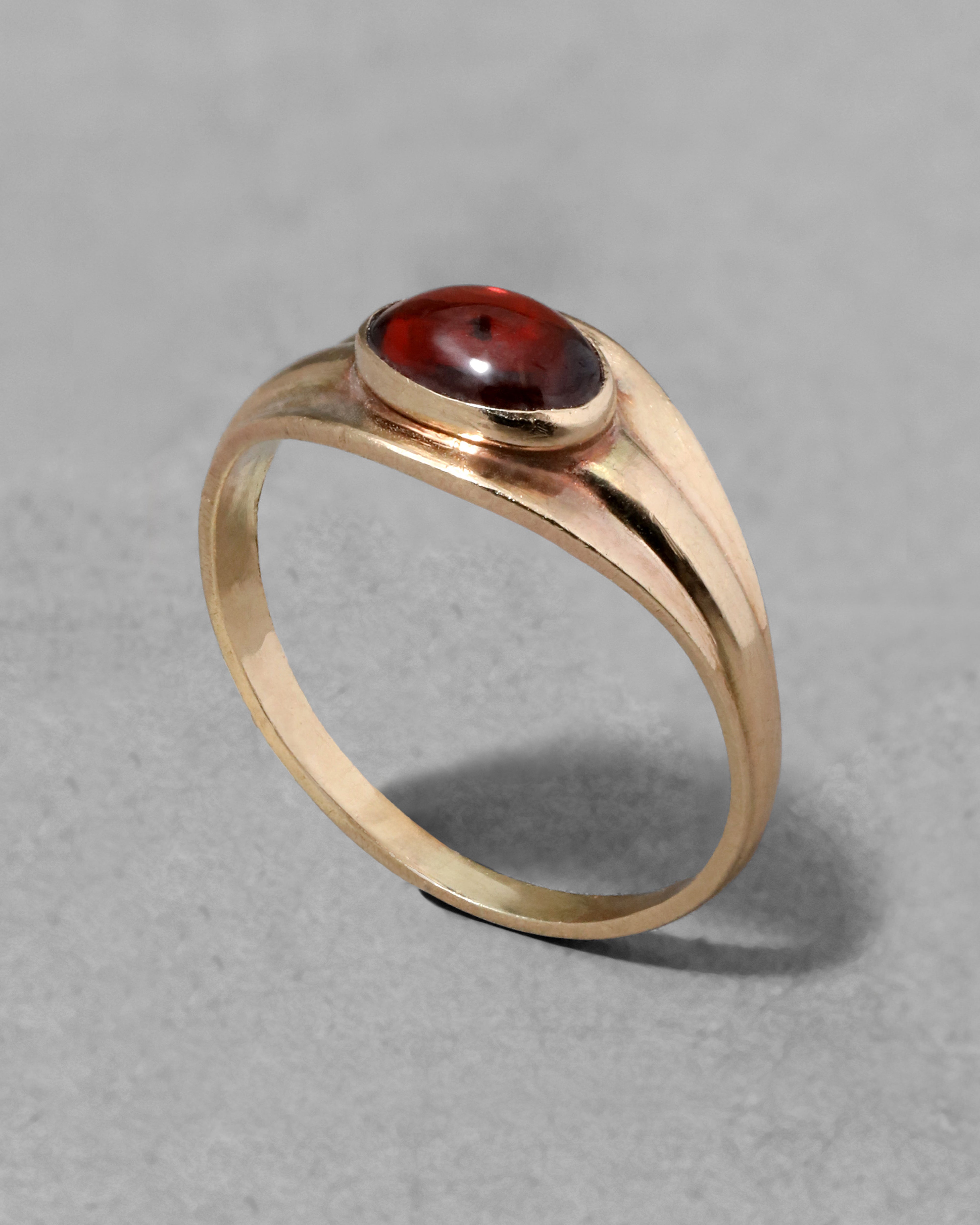 Dainty yet stunning 10k gold baby ring from the Victorian era. Adorned with a vivid garnet cabochon bezel set on a tiered band.
