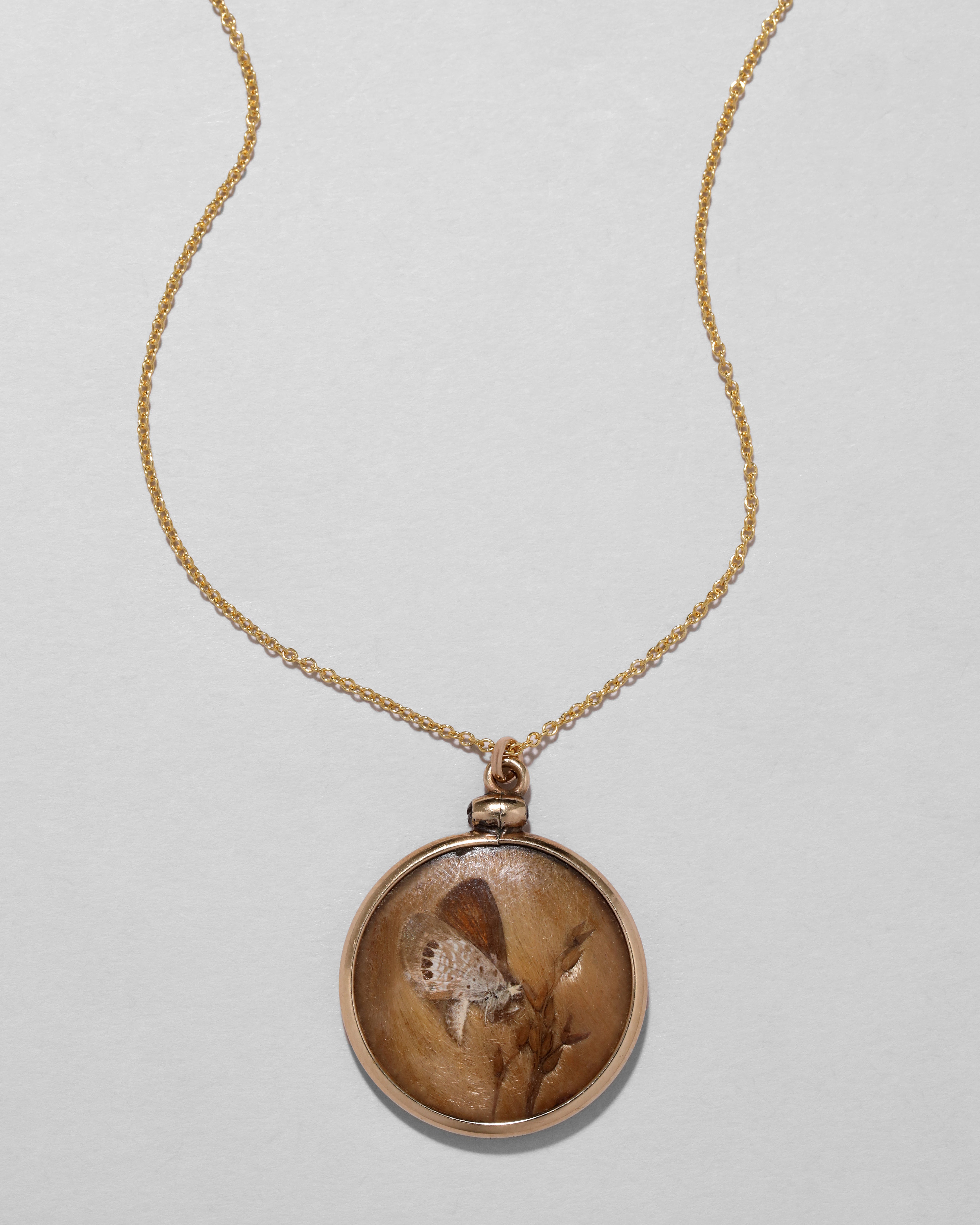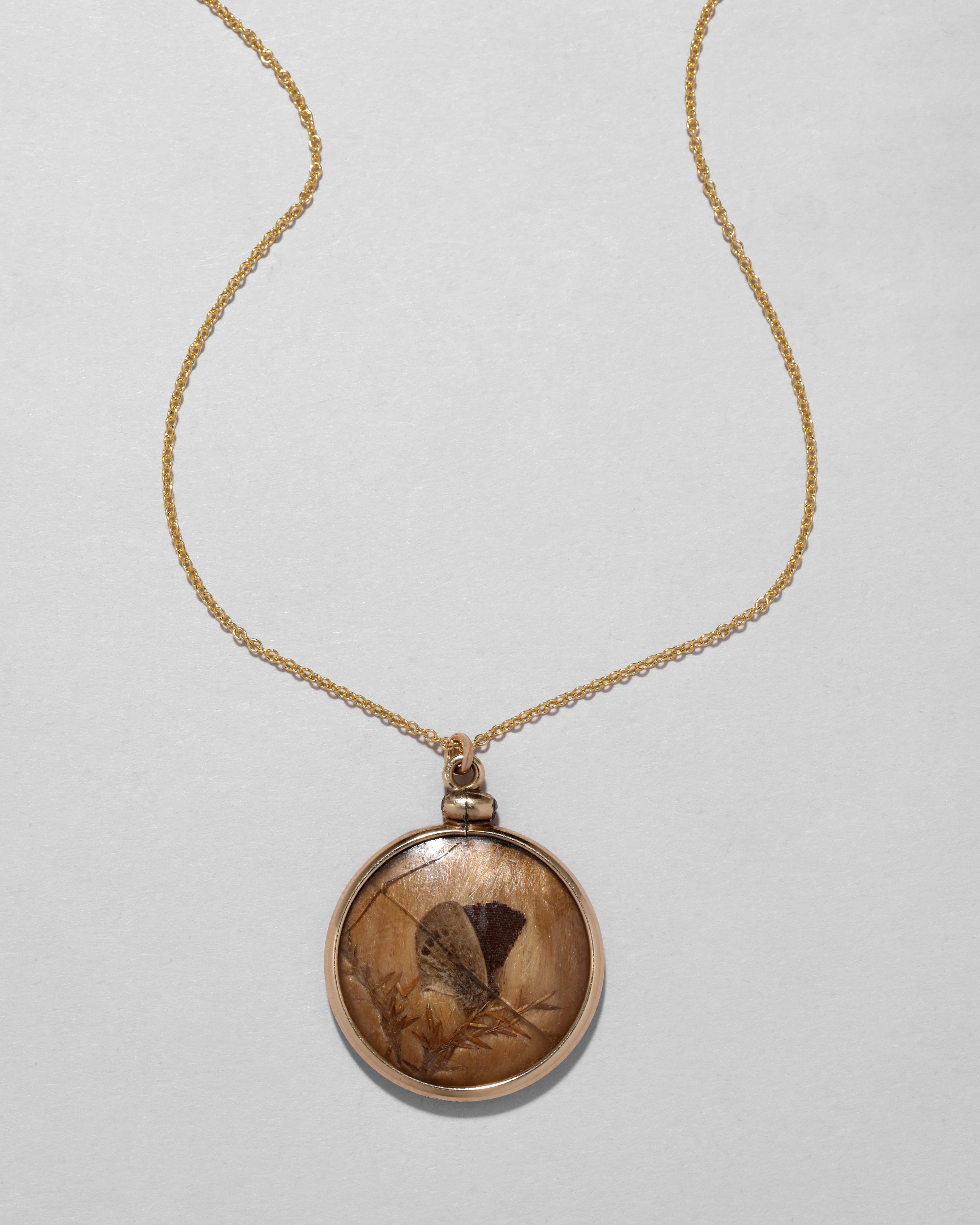 From the Victorian era, a small butterfly is encased on this gorgeous 14k gold fill pendant creating a fantastical landscape scene. Due to age there is a small crack on the pendant casing, in line with over a century of wear.
