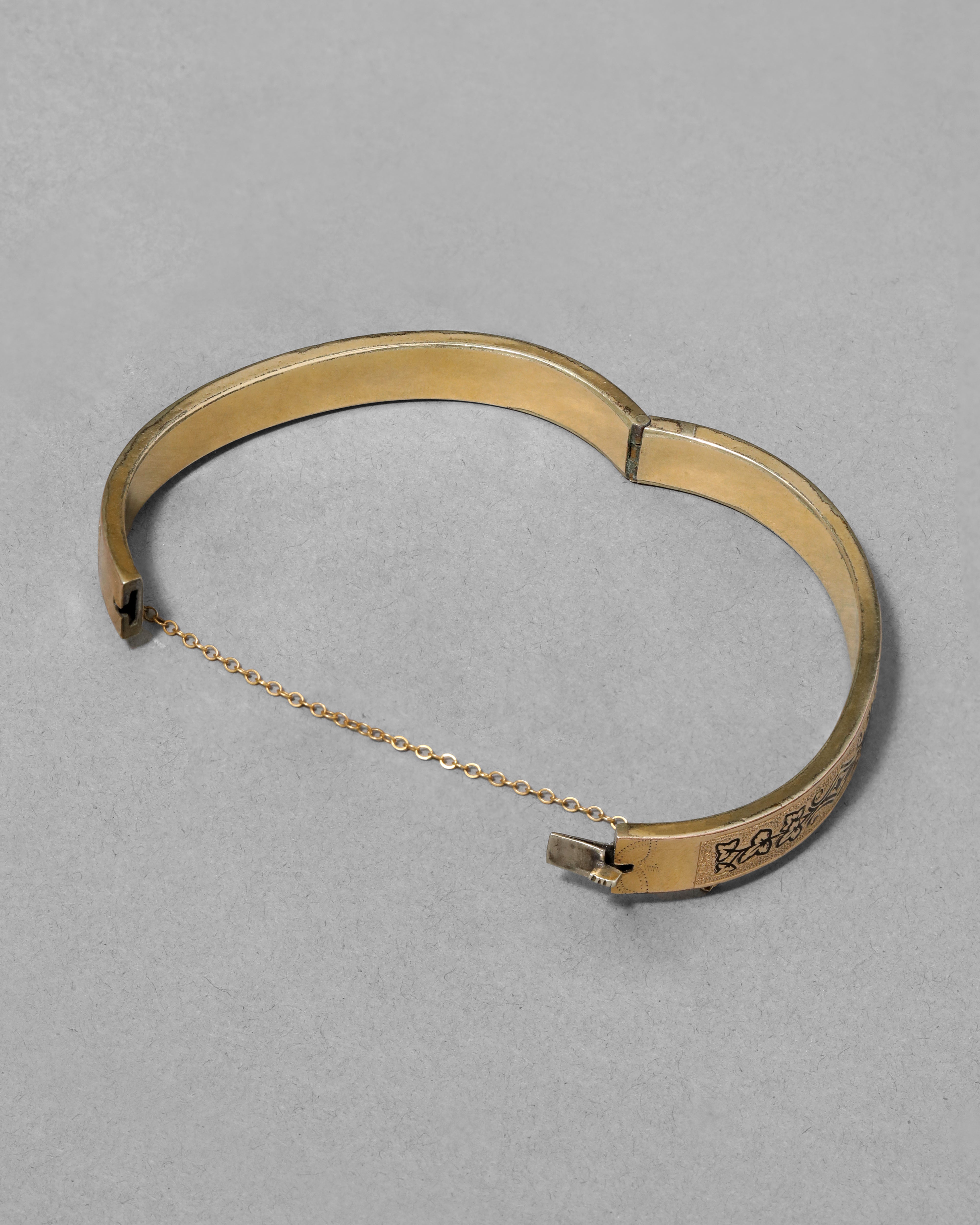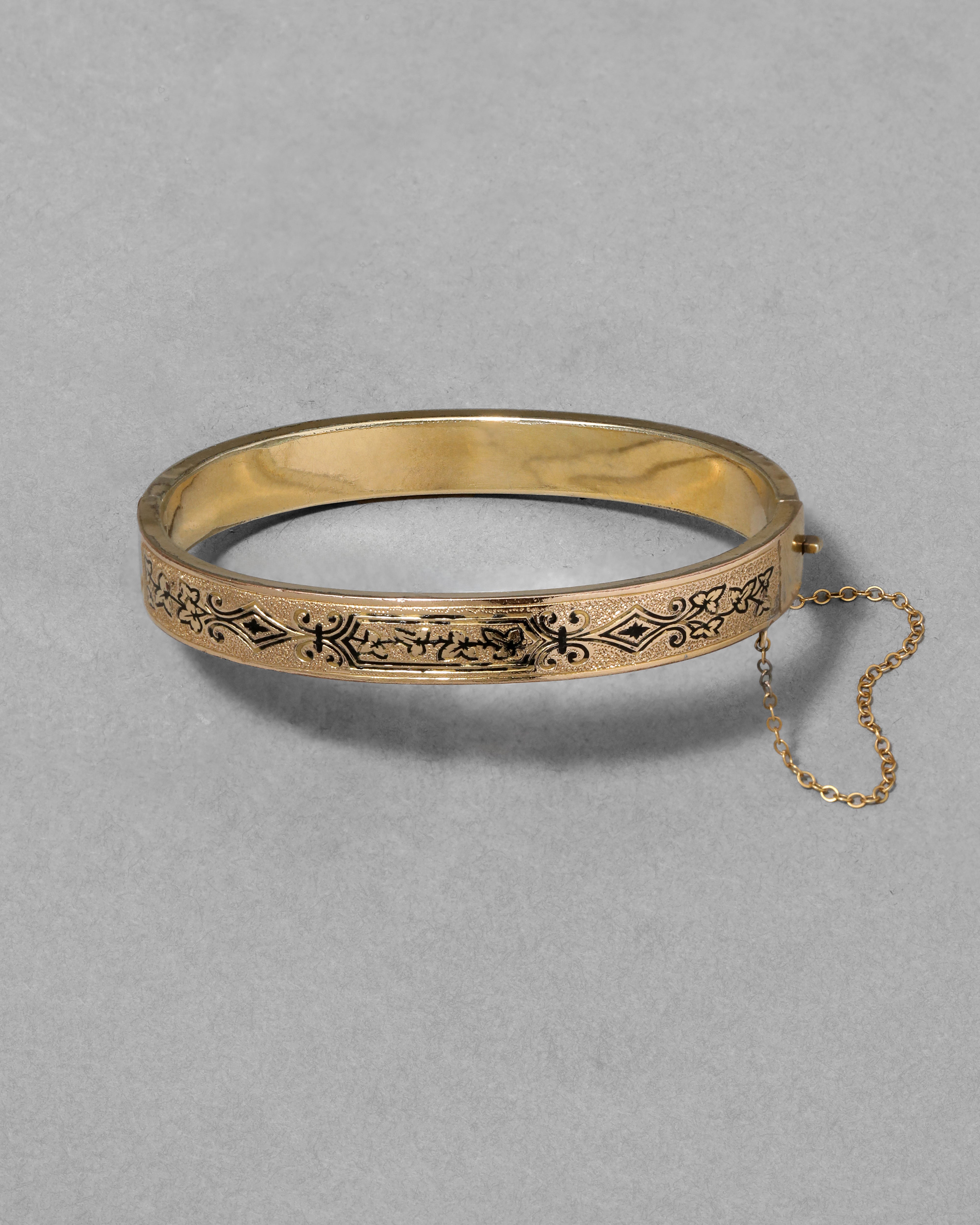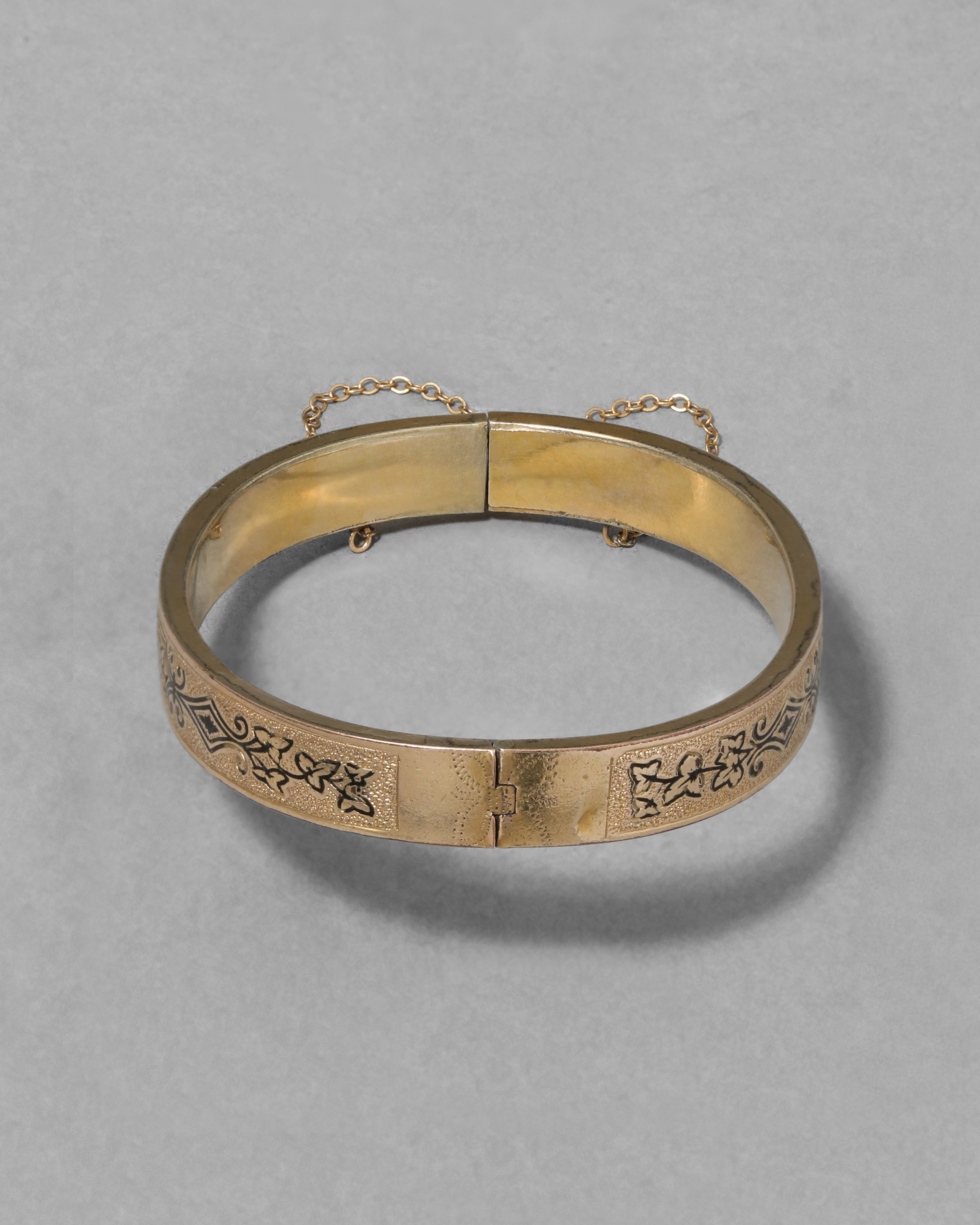 14k gold fill hinged bracelet from the Victorian era, hand-etched with a beautiful taille d'épargne enamel foliage motif, on a reflective textured background.