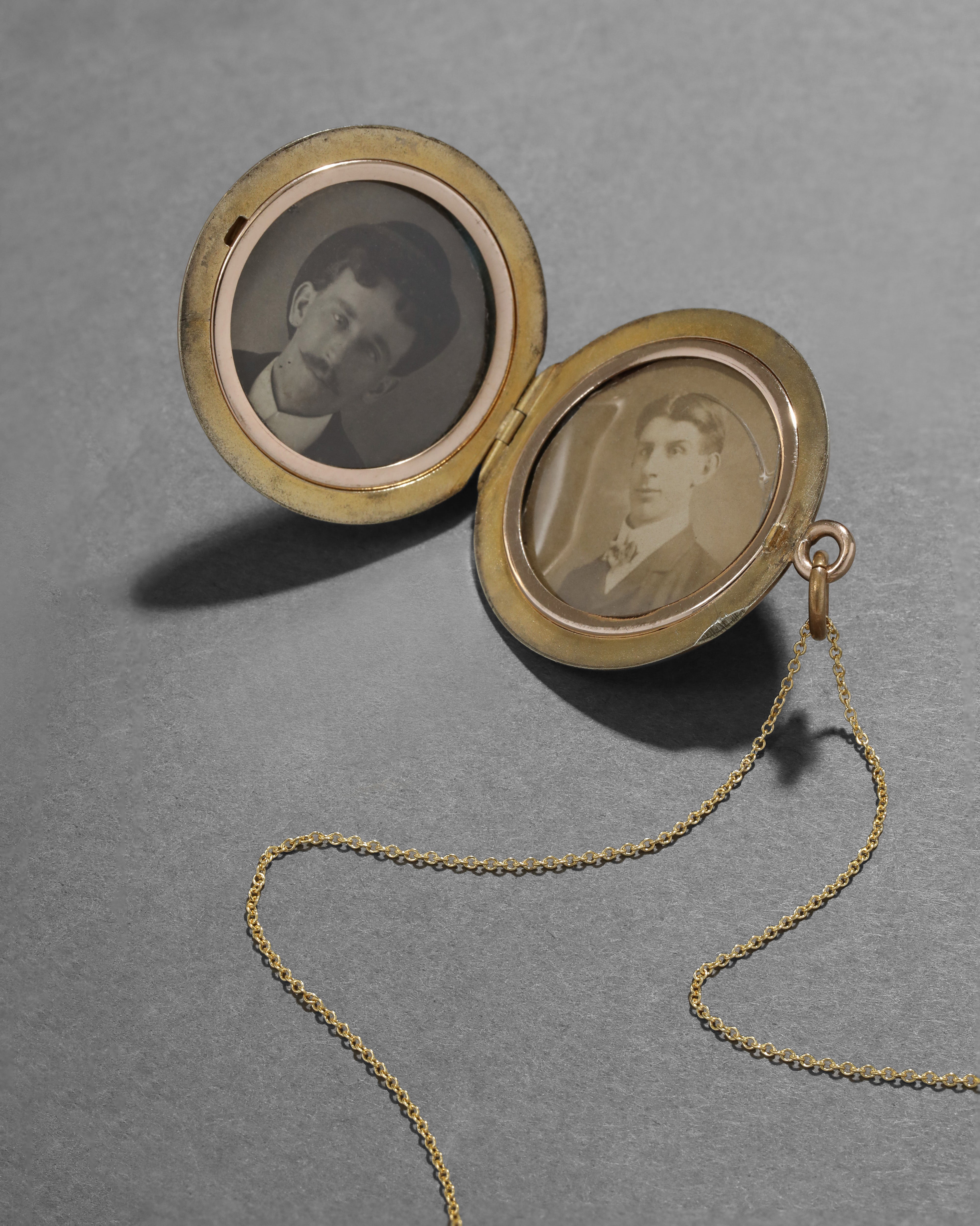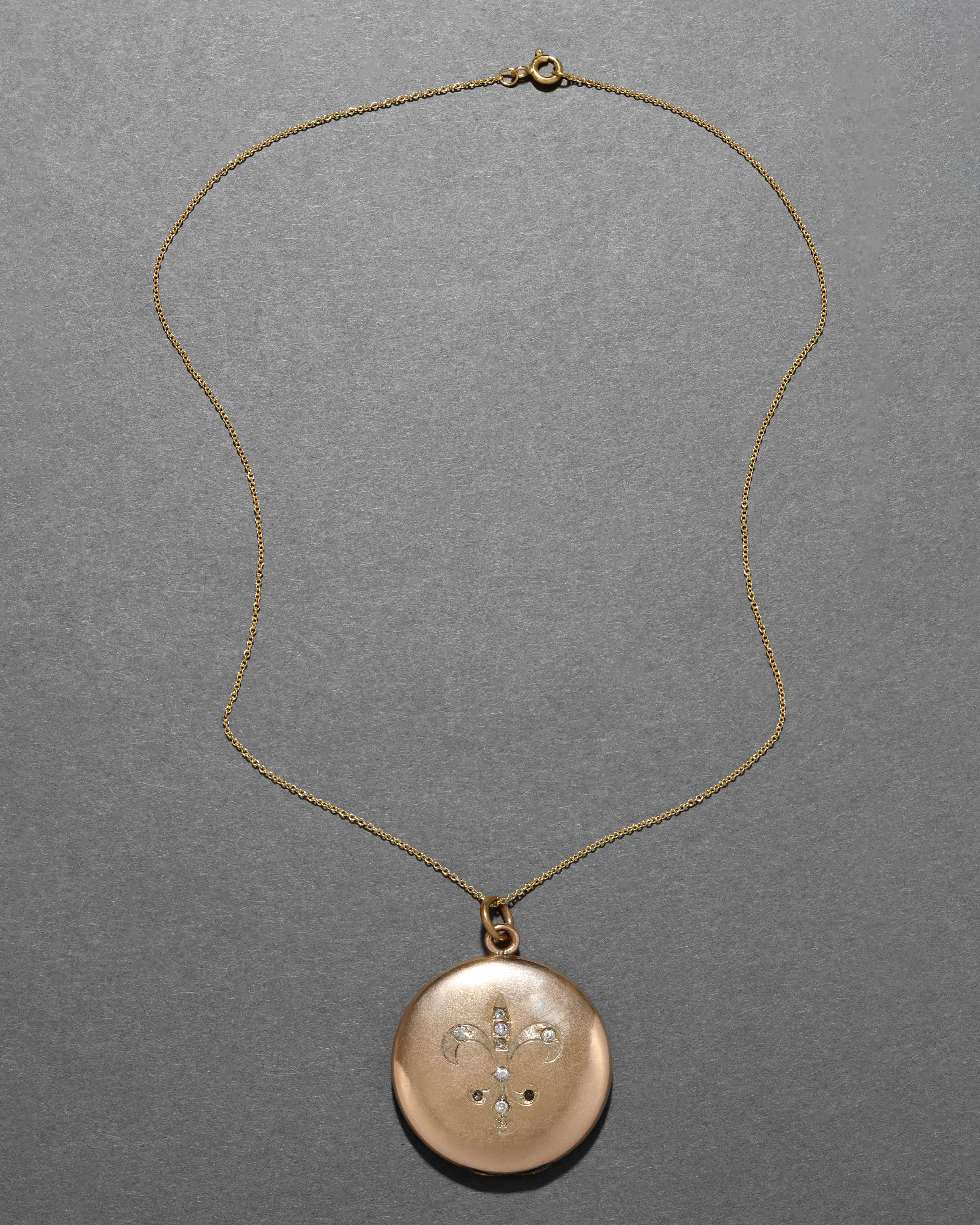From the Victorian 1800s, this 14k gold fill locket has a crystal accented Fleur de Lis hand-etched onto the face of its brushed silhouette. Fleur de Lis were commonly worn to symbolize purity, virtue, and power in the Victorian era.