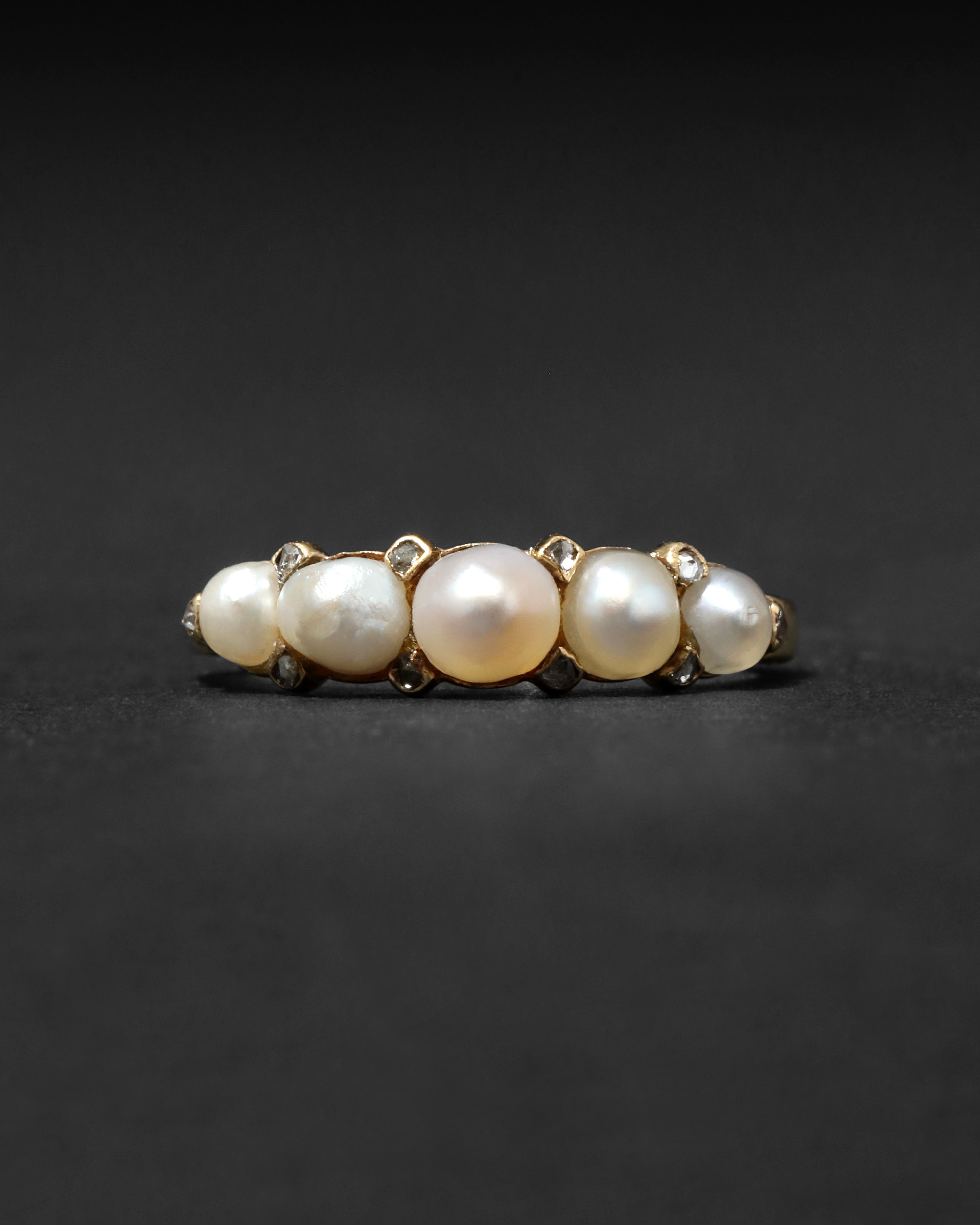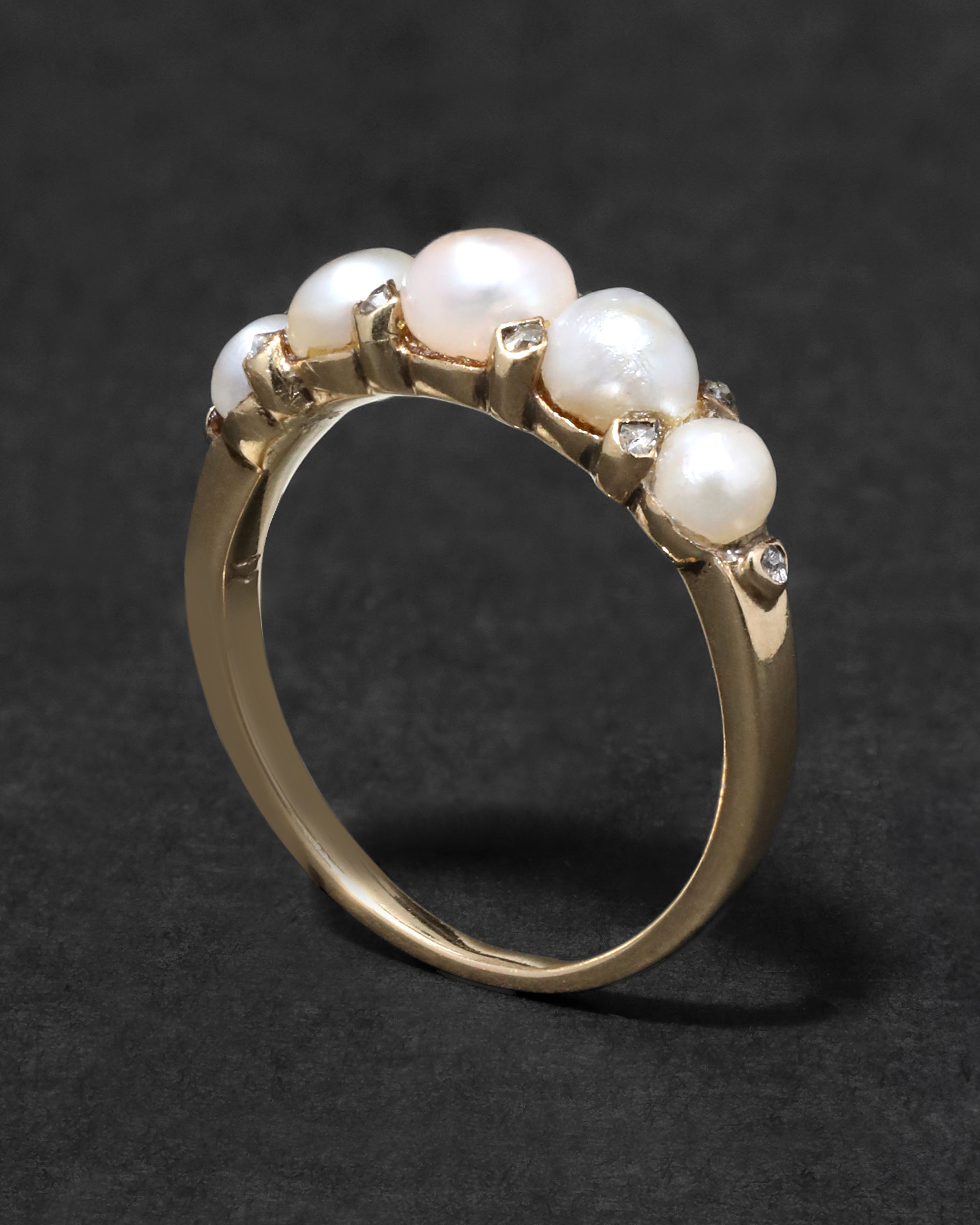 Gorgeous natural pearls, in unique diamond accented prong settings, create a graduating line atop this opulent 14k gold ring from the Victorian 1800s.