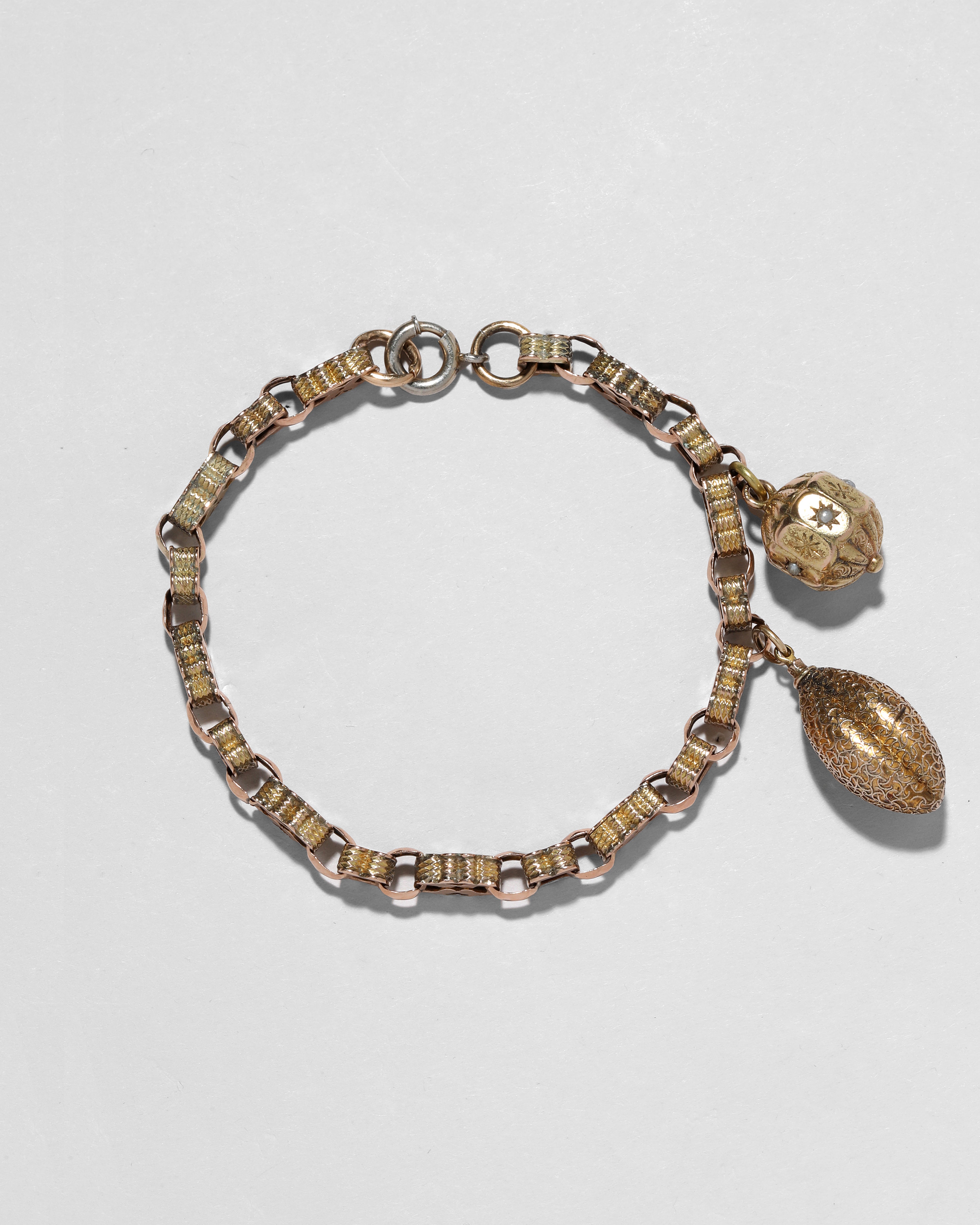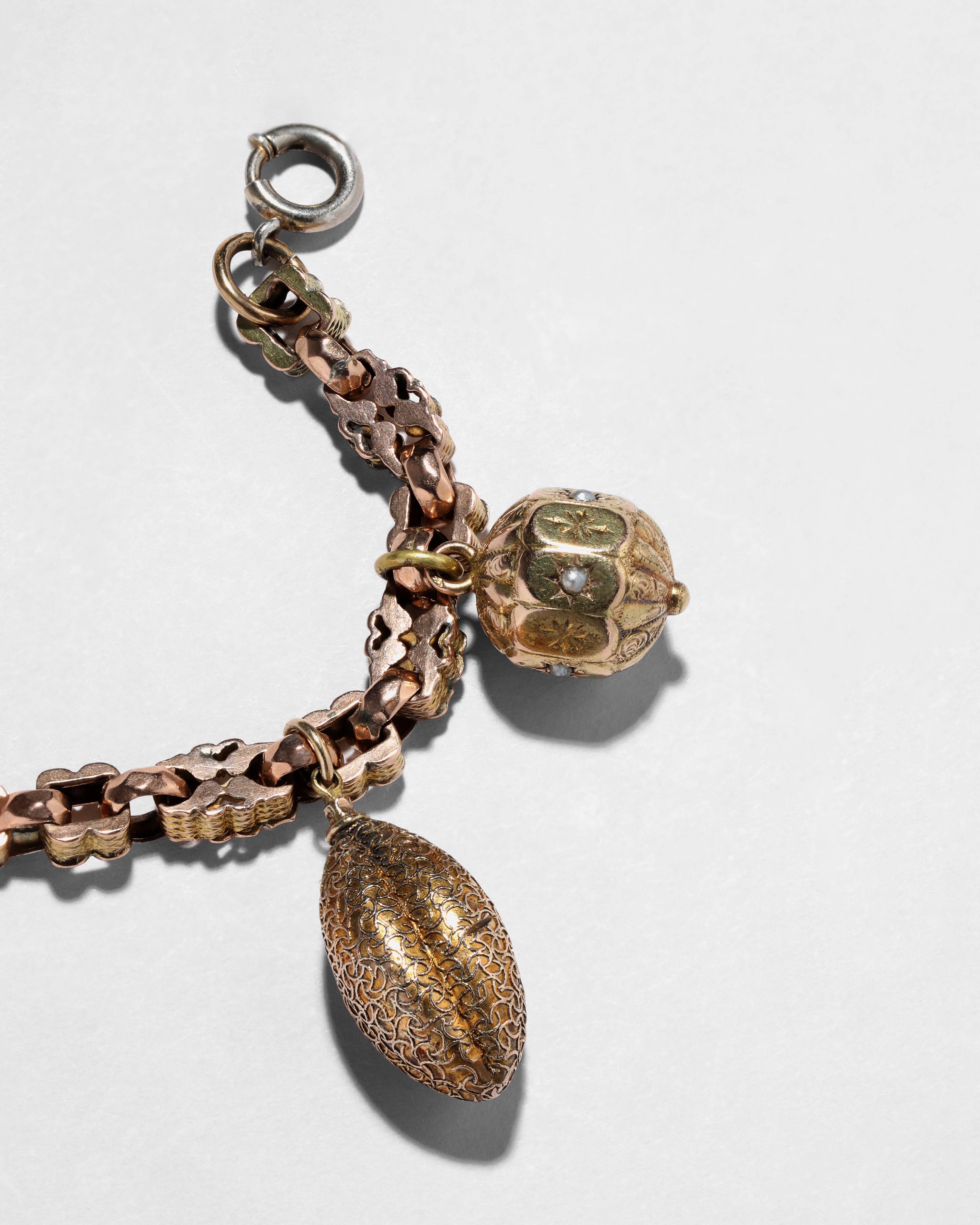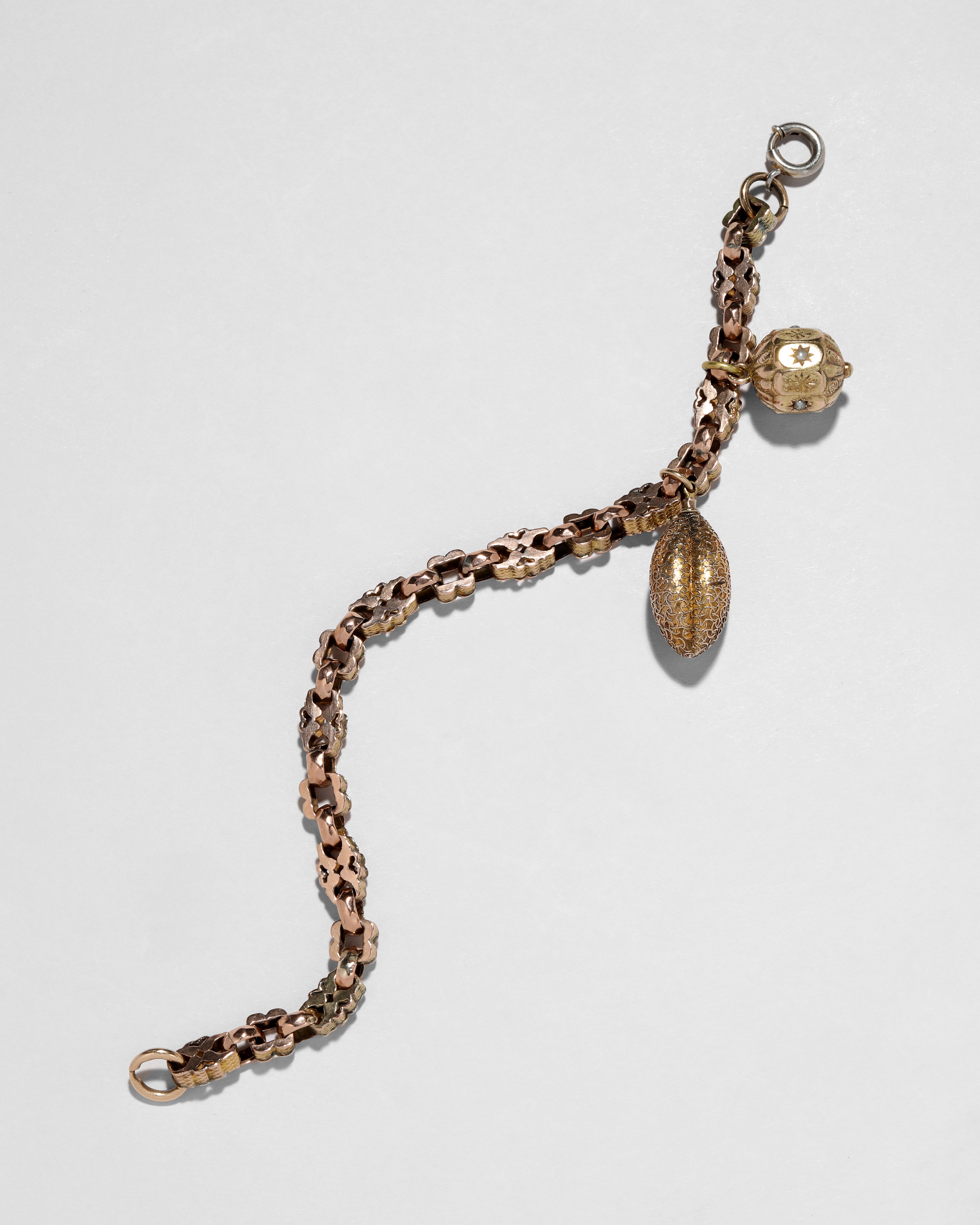 This meticulously detailed handmade 14k gold fill charm bracelet from the Victorian 1880s has intricate Etruscan motif metalwork, across a silhouette of charms and custom designed links.