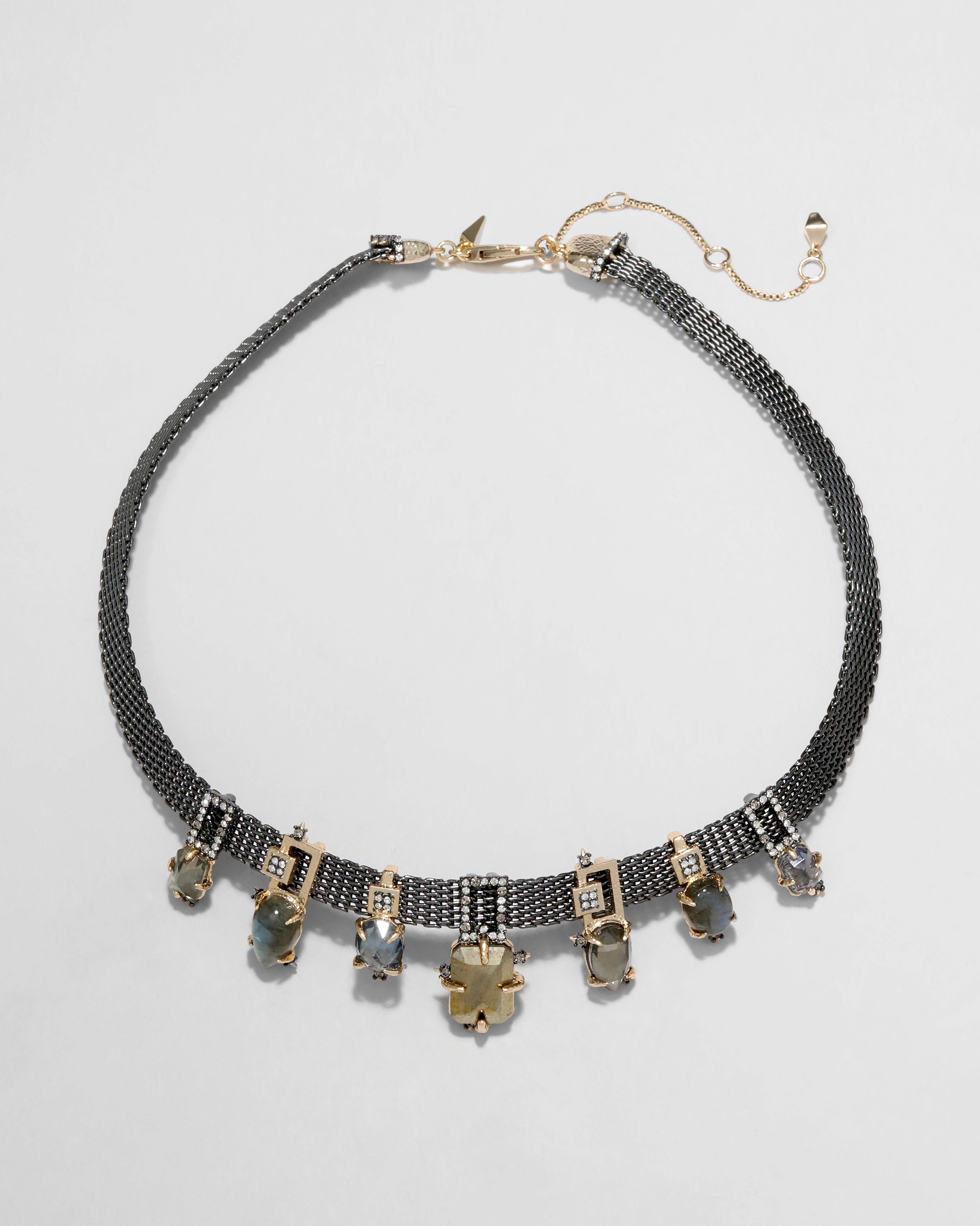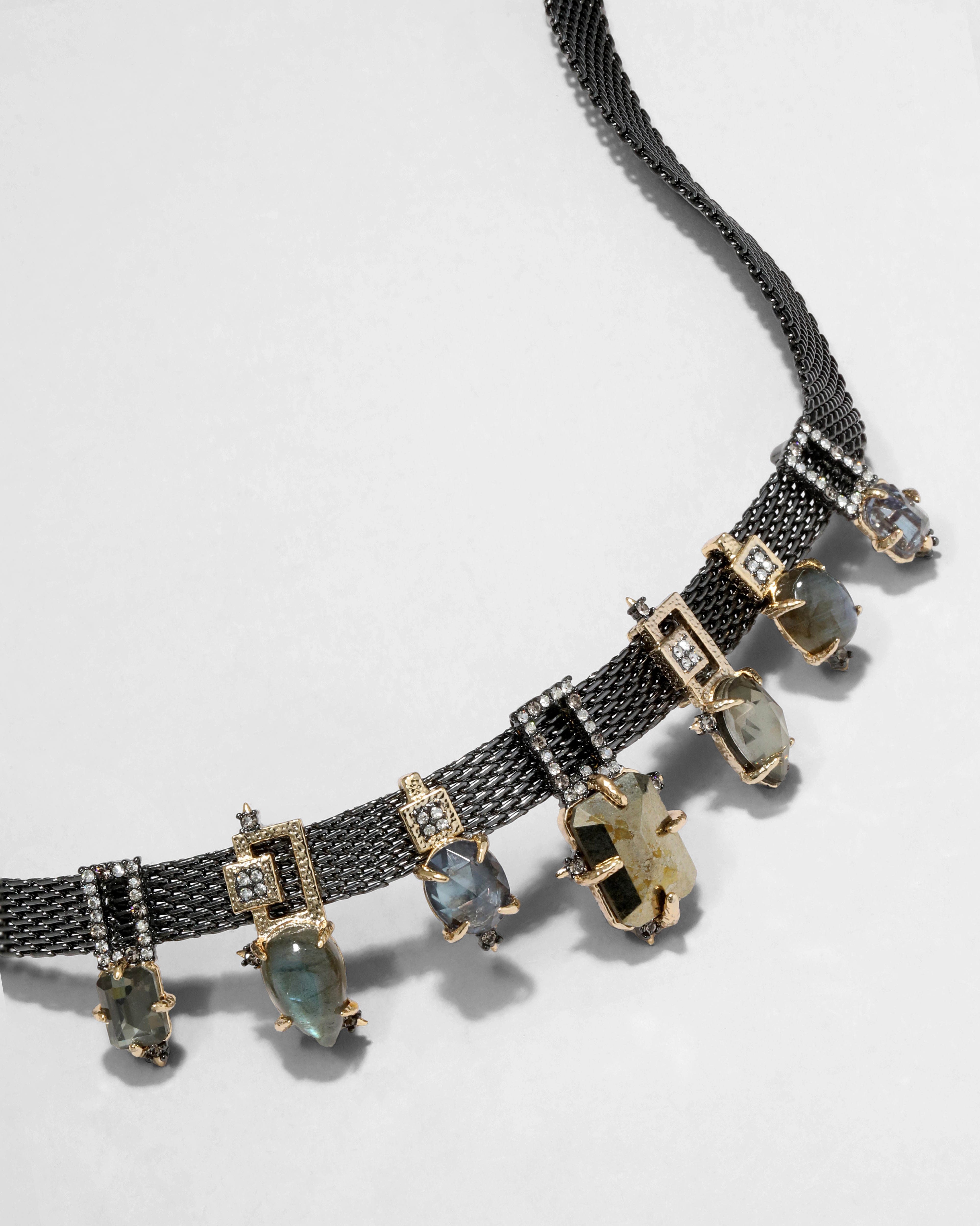 - 10k gold tone plated brass, ruthenium plated brass, pyrite, pyrite doublet, labradorite, synthetic blue corundum, crystal