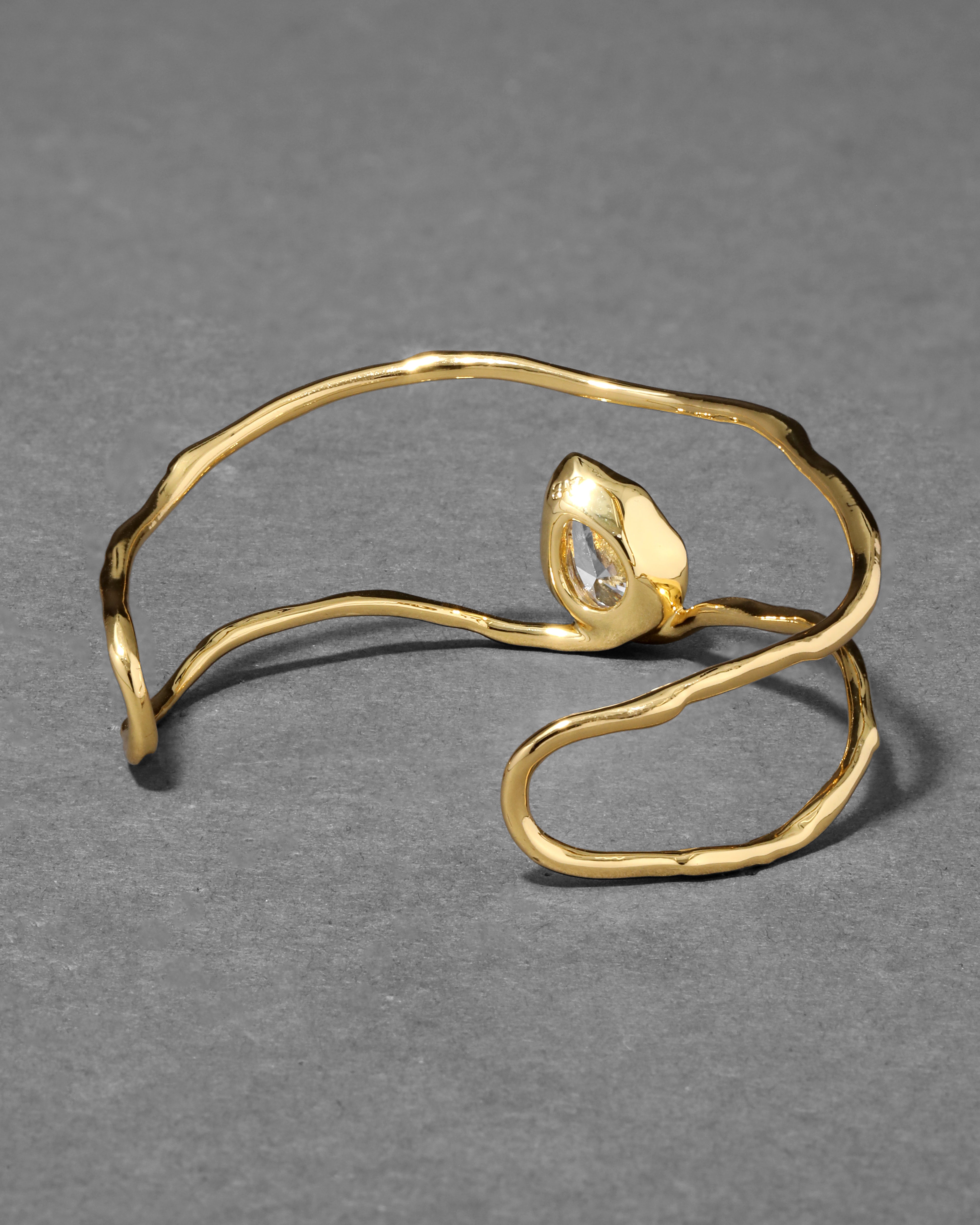 With a timeless yet modern silhouette, this minimalist 14k gold plated cuff bracelet features organic, open metalwork that wraps to form the setting for a single, bright pear cut CZ crystal.