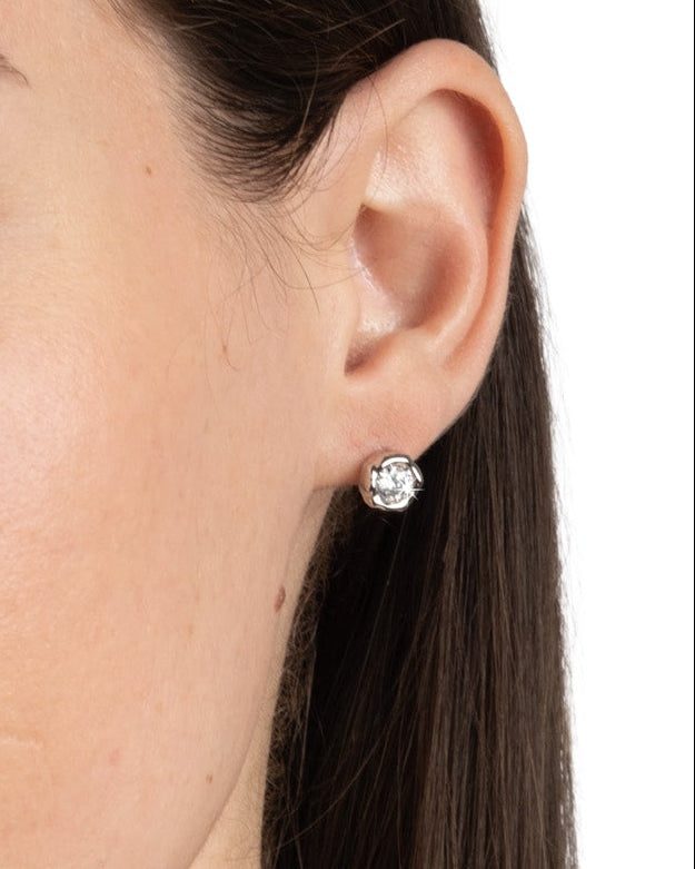 Liquid silver tone plated circle surround faceted white CZ. Sold as a pair.