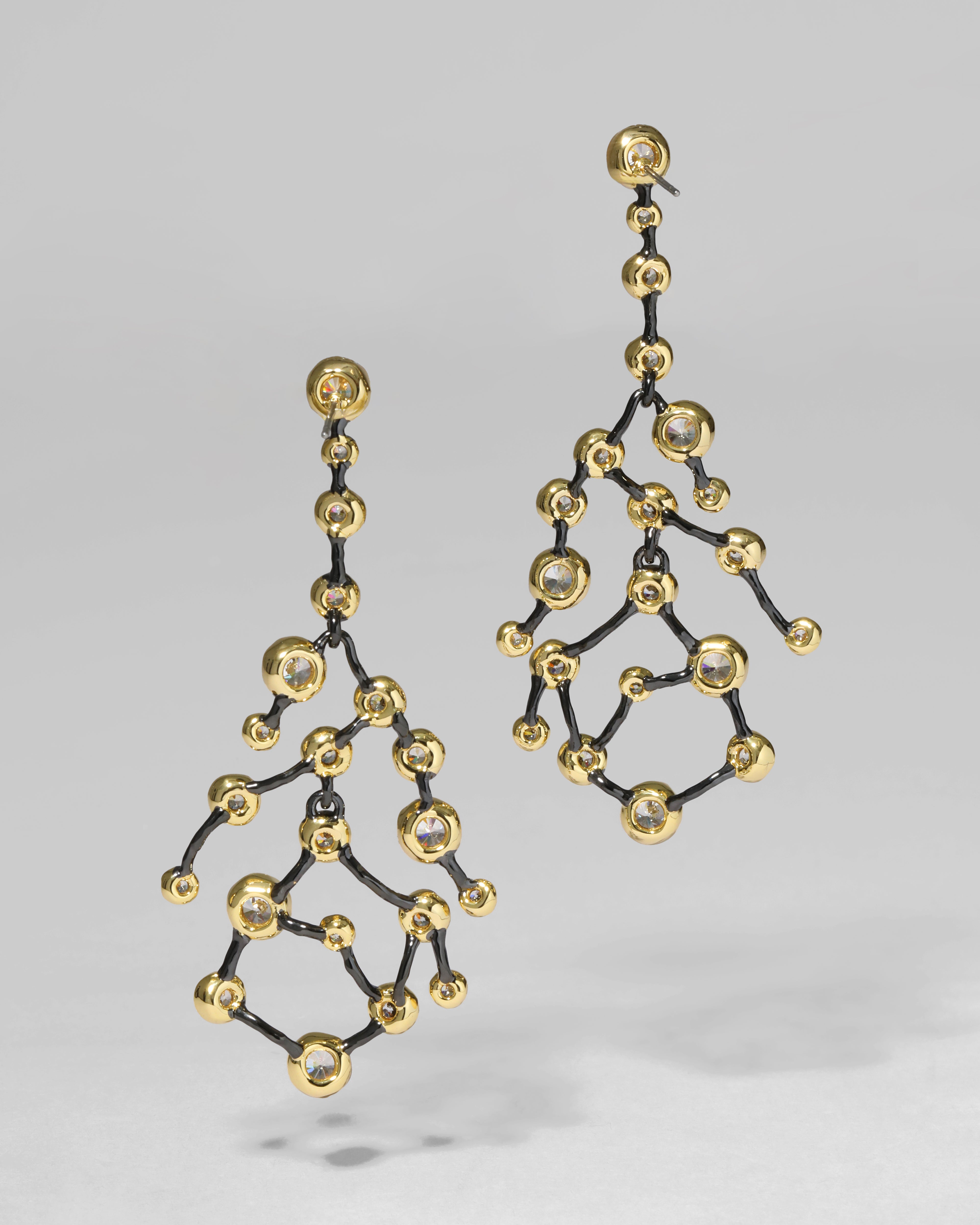 Glistening CZ crystals, in 14k gold plated bezel settings, are connected with molten gunmetal plated metalwork to form these celestial inspired drop earrings that catch light at every turn.