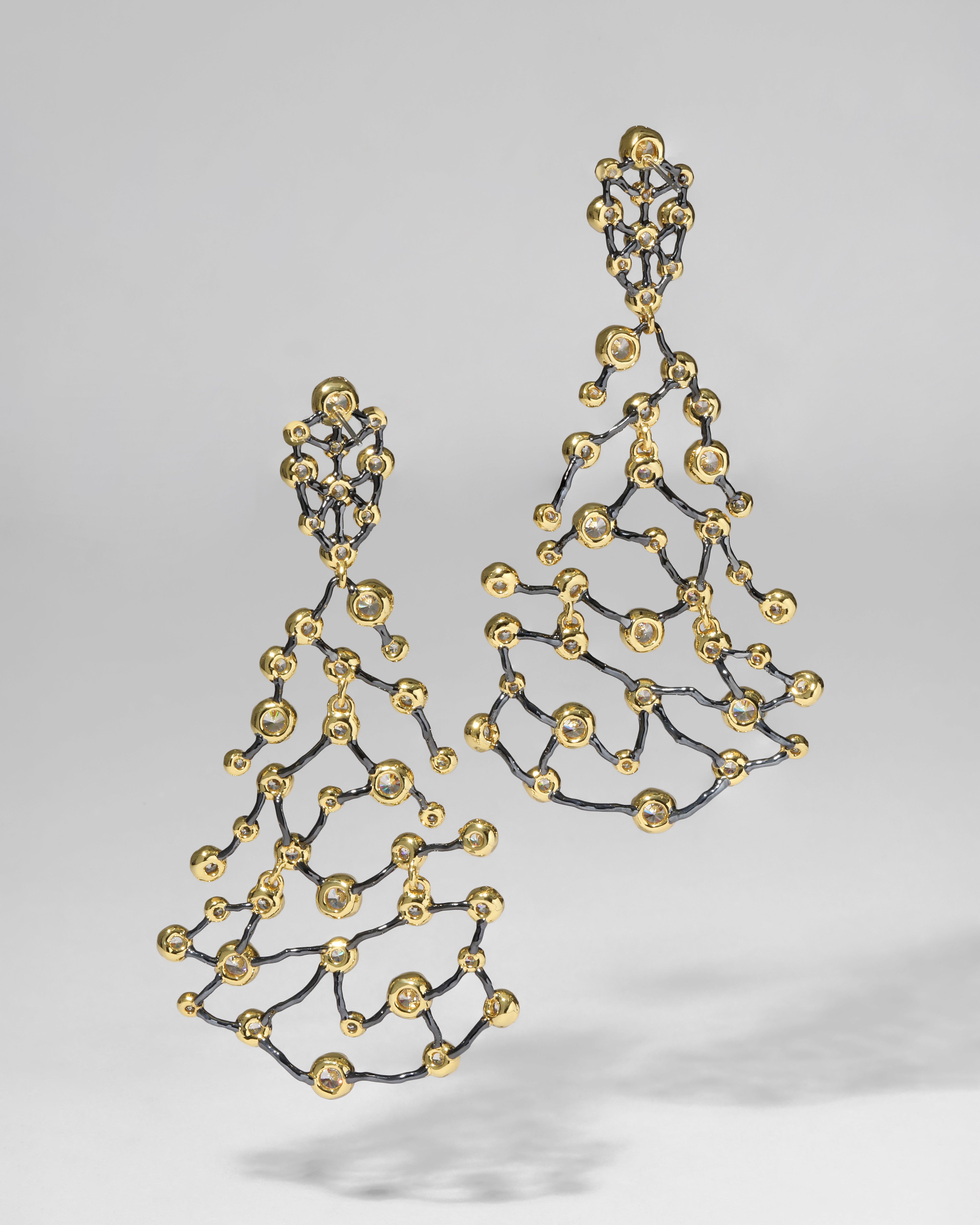 Inspired by celestial formations, these oversized gunmetal plated post earrings feature a constellation of open metalwork, accented with brilliant CZ crystals in contrasting 14k gold plated settings.