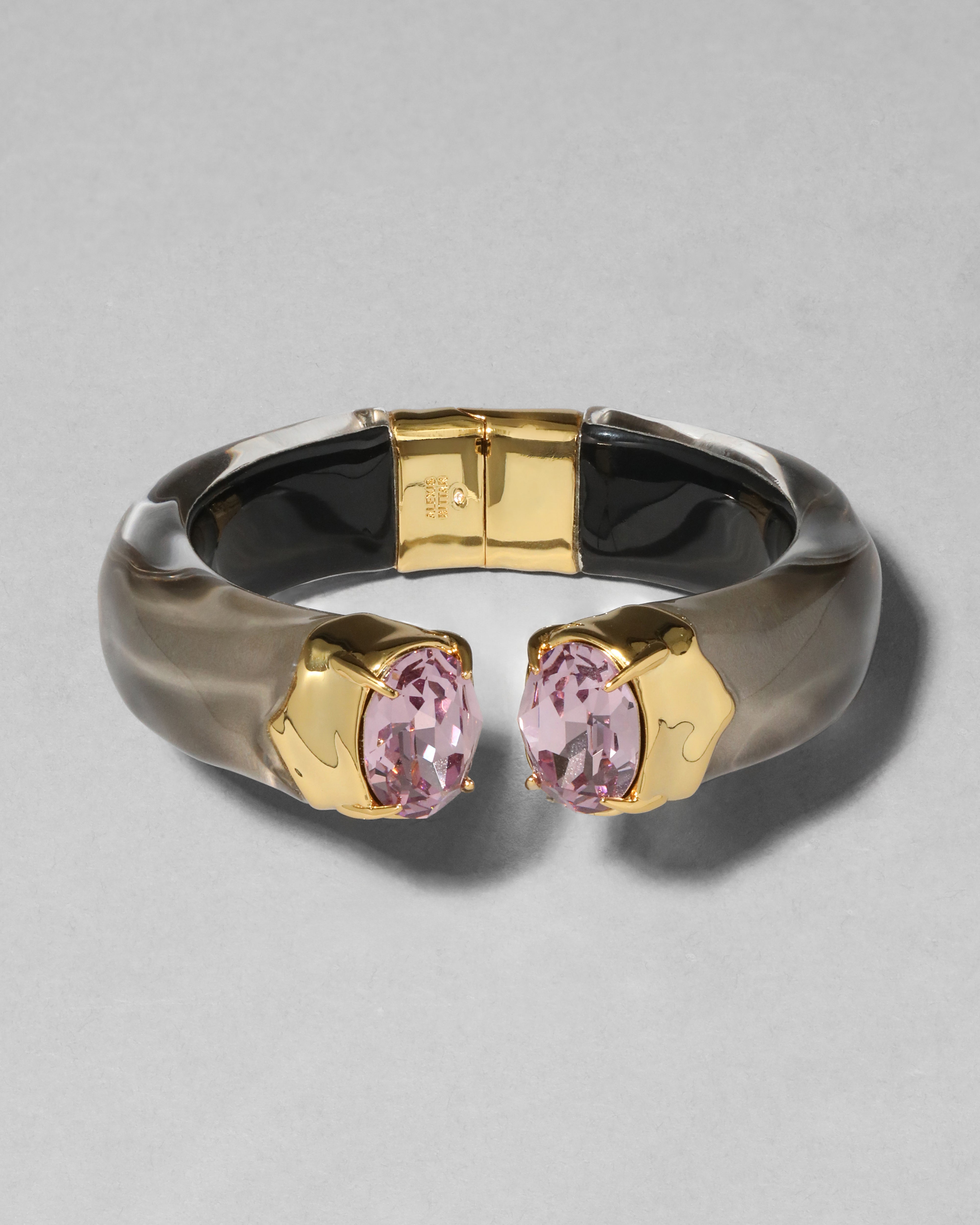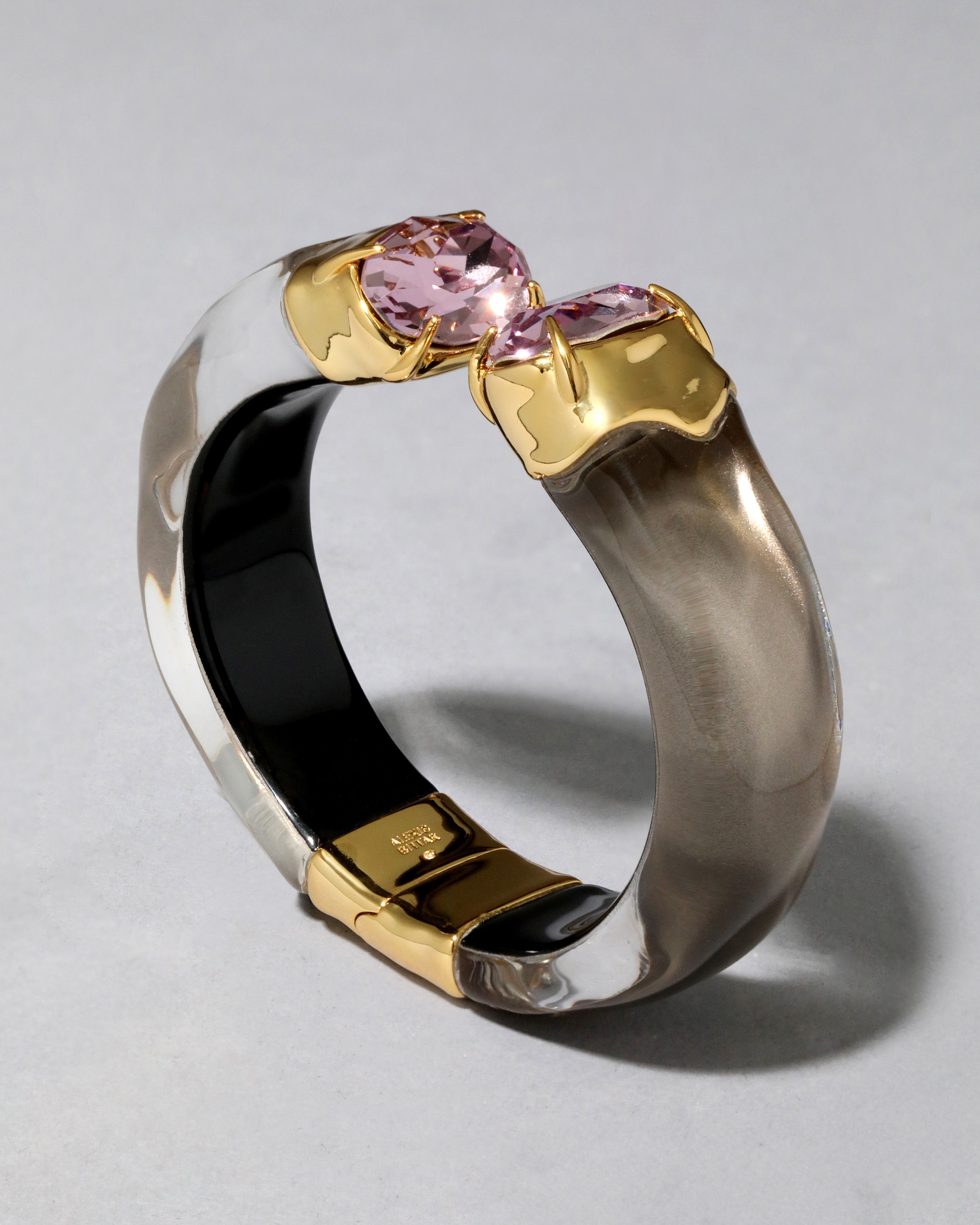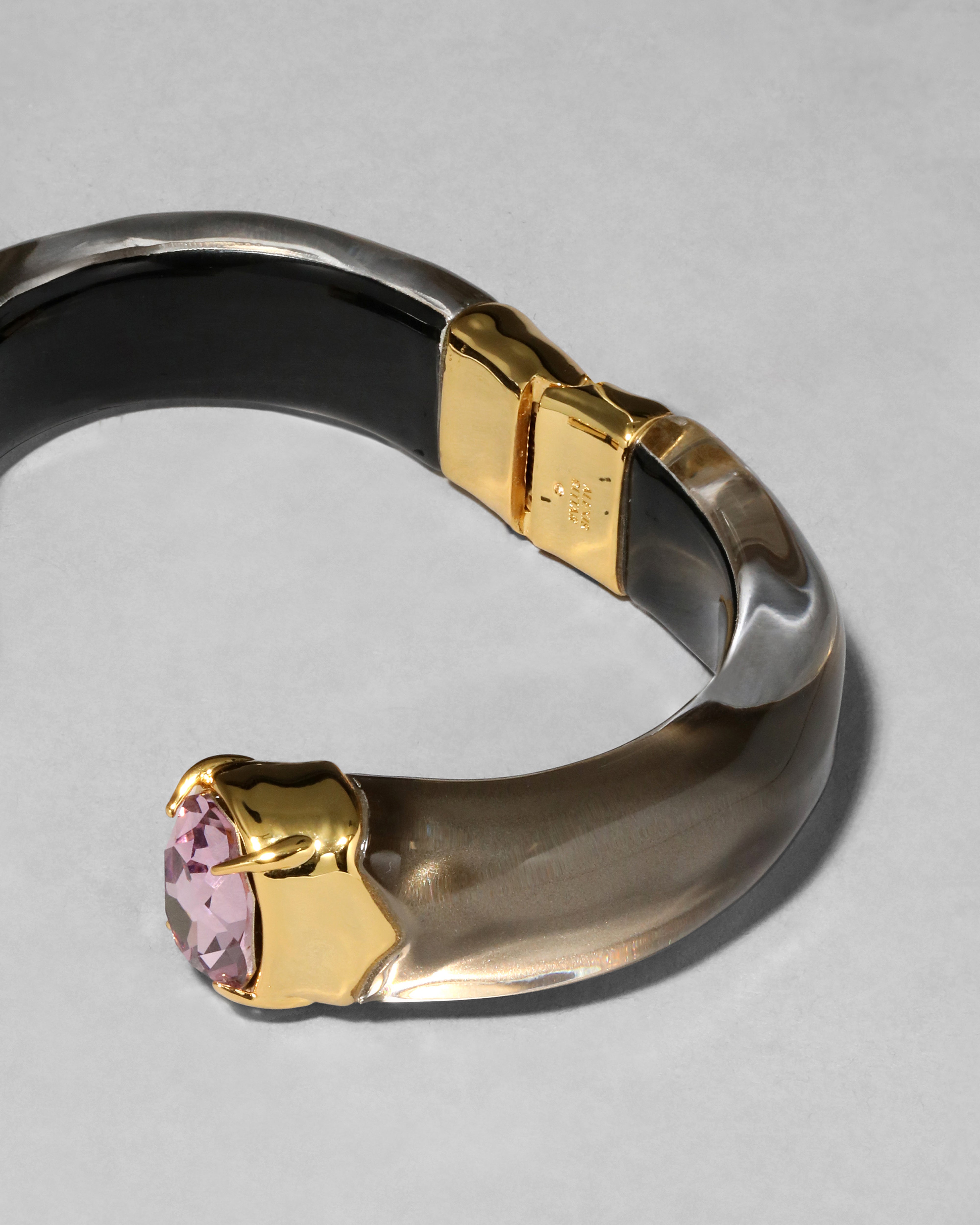 This hand-sculpted Lucite hinged bracelet is hand-polished and painted in a sandy dune inspired hue and finished with dazzling oversized custom-cut bonbon crystals set in molten 14k gold plated metal end caps. Giving an 80's sporty meets glam vibe.