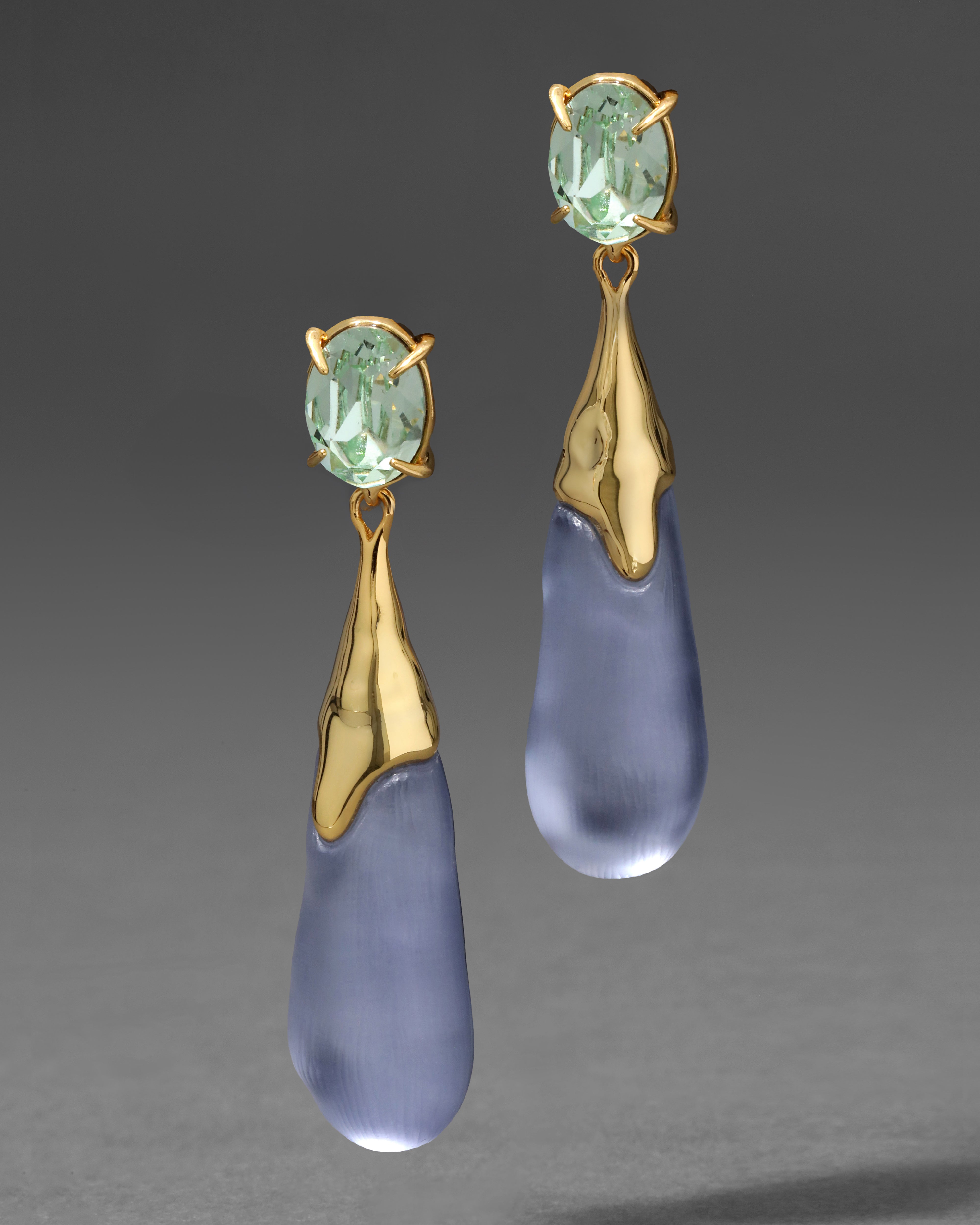 Glowing hand-sculpted Lucite teardrops swing from these 14k gold plated post earrings. Hand-painted in a luminous steel blue shade and accented with a richly hued claw set crystal. Oozing 1980s decadent glamour, with a modern twist.