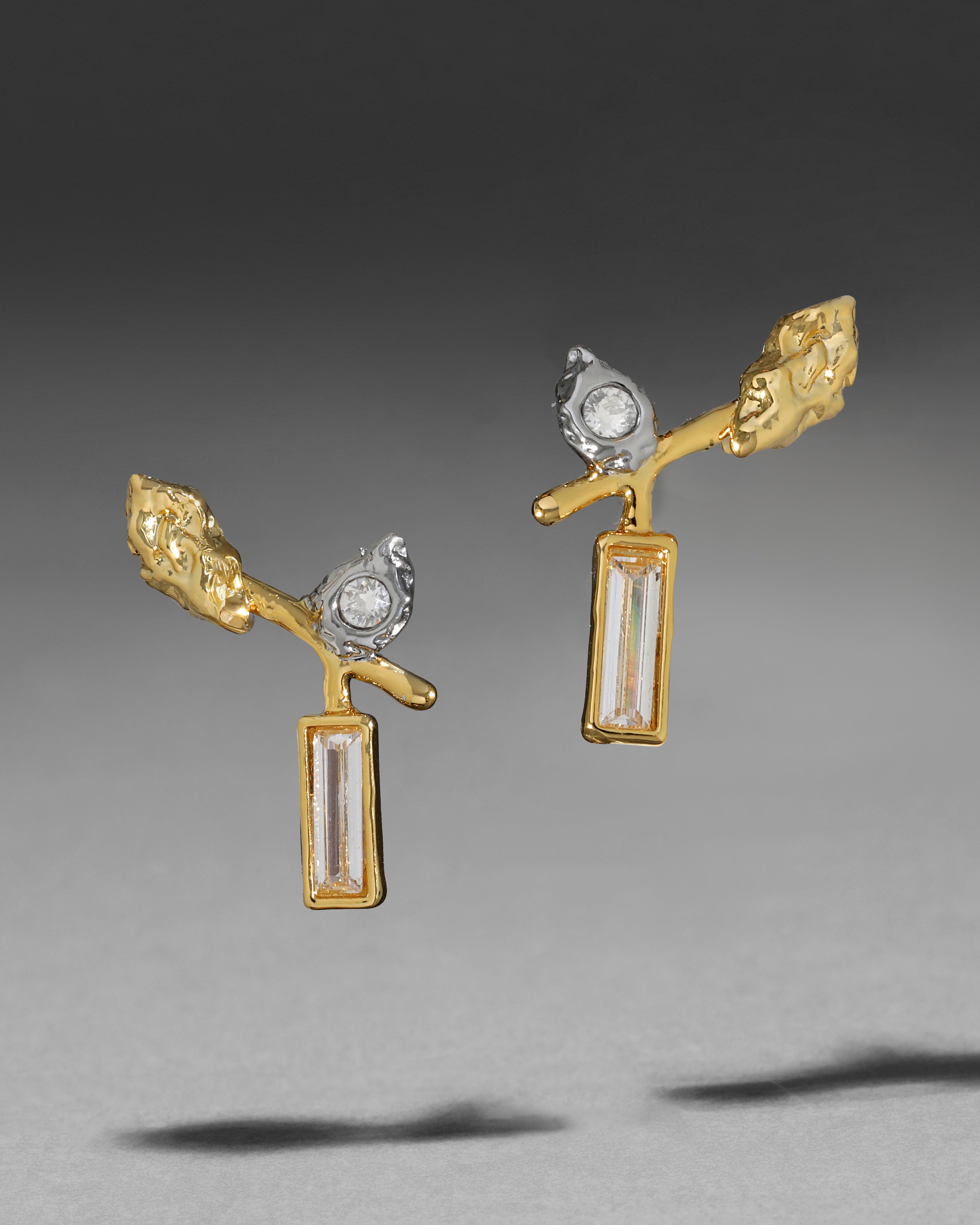 14k gold plated and silver textured nuggets with a sleek crystal baguette arch up the ear on this modern ear climber style earring.