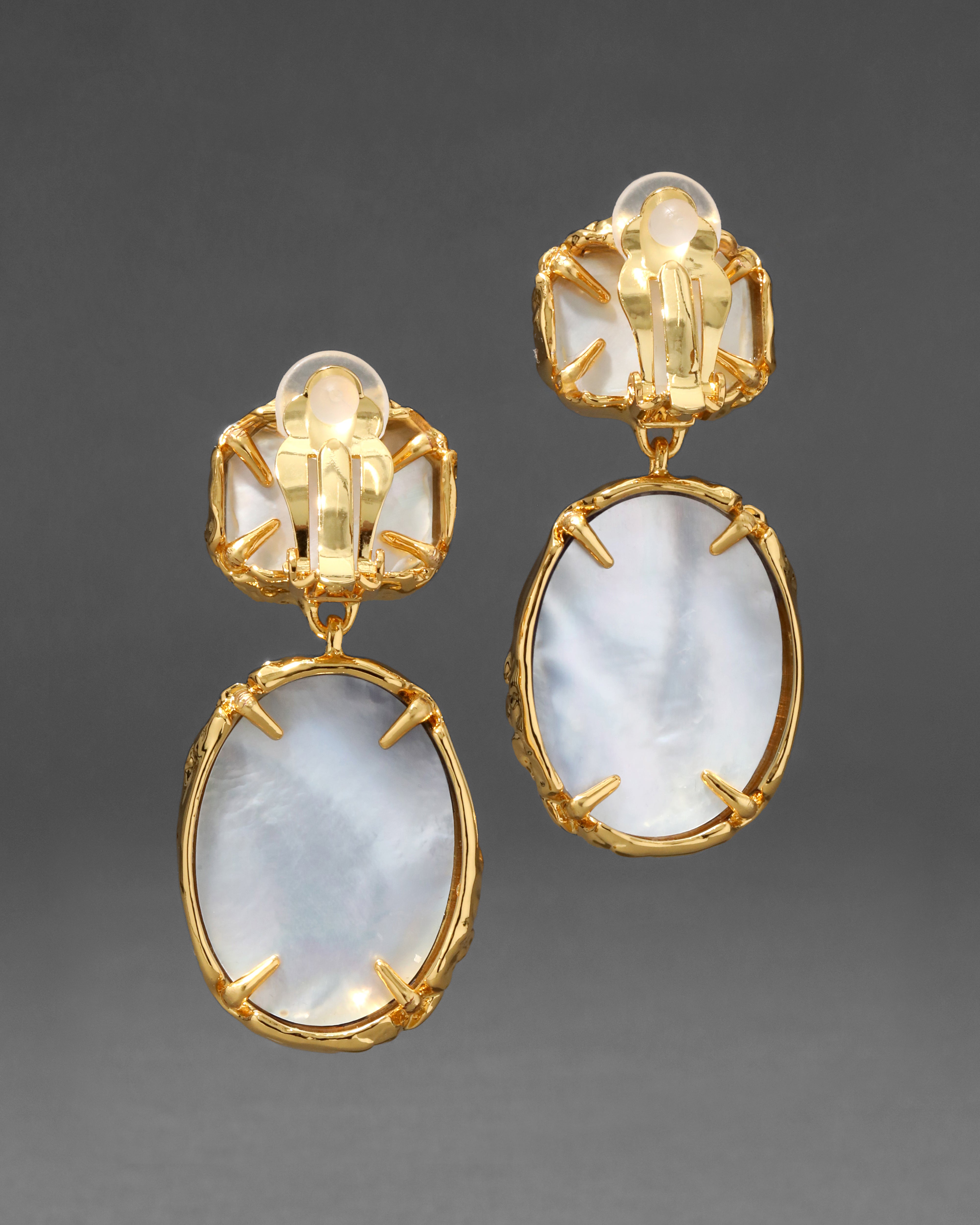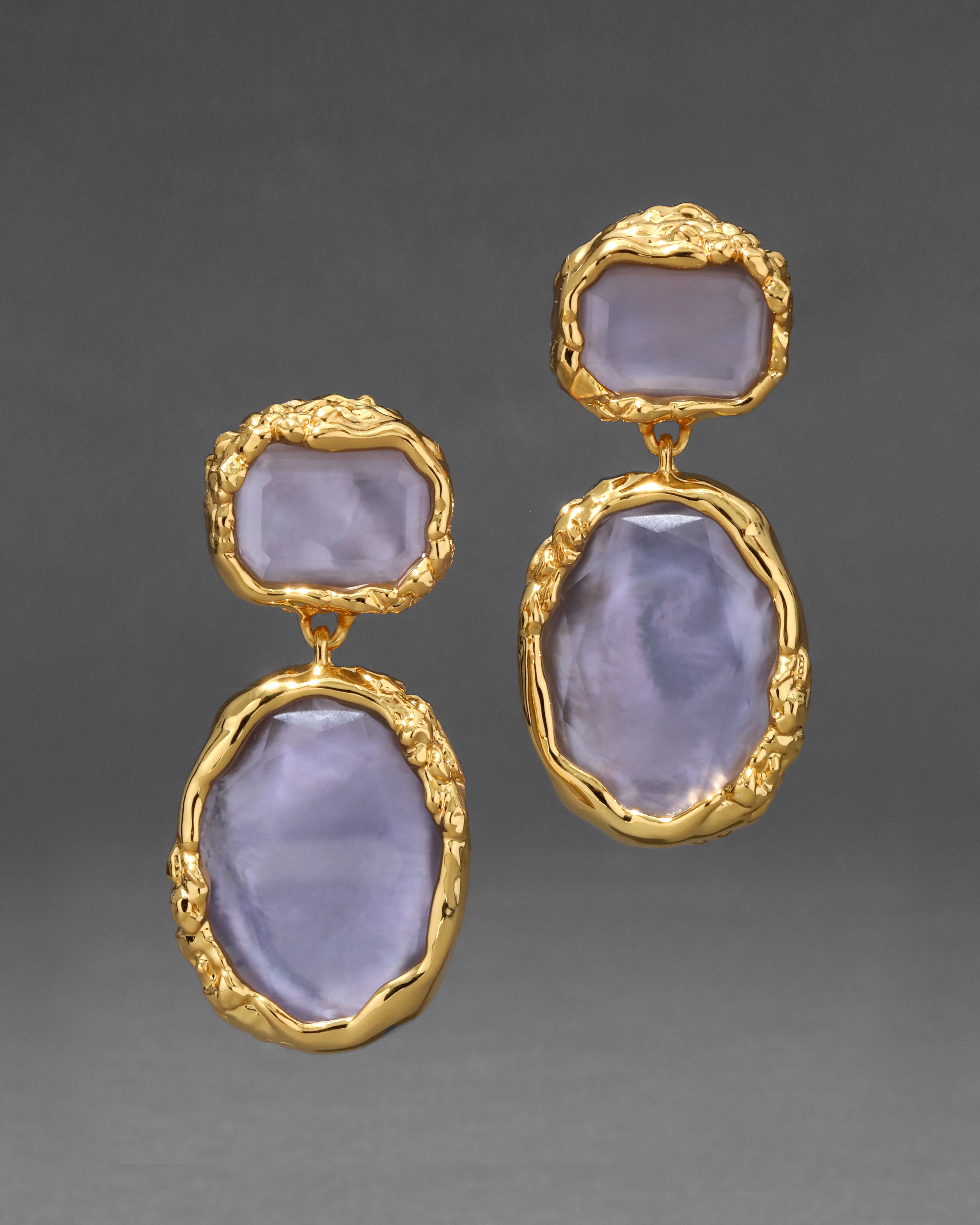 Luminous iolite mother of pearl doublets are set in custom designed textured bezel settings on these ravishing 14k gold plated drop clip earrings, with a glamorous 70s inspired silhouette.