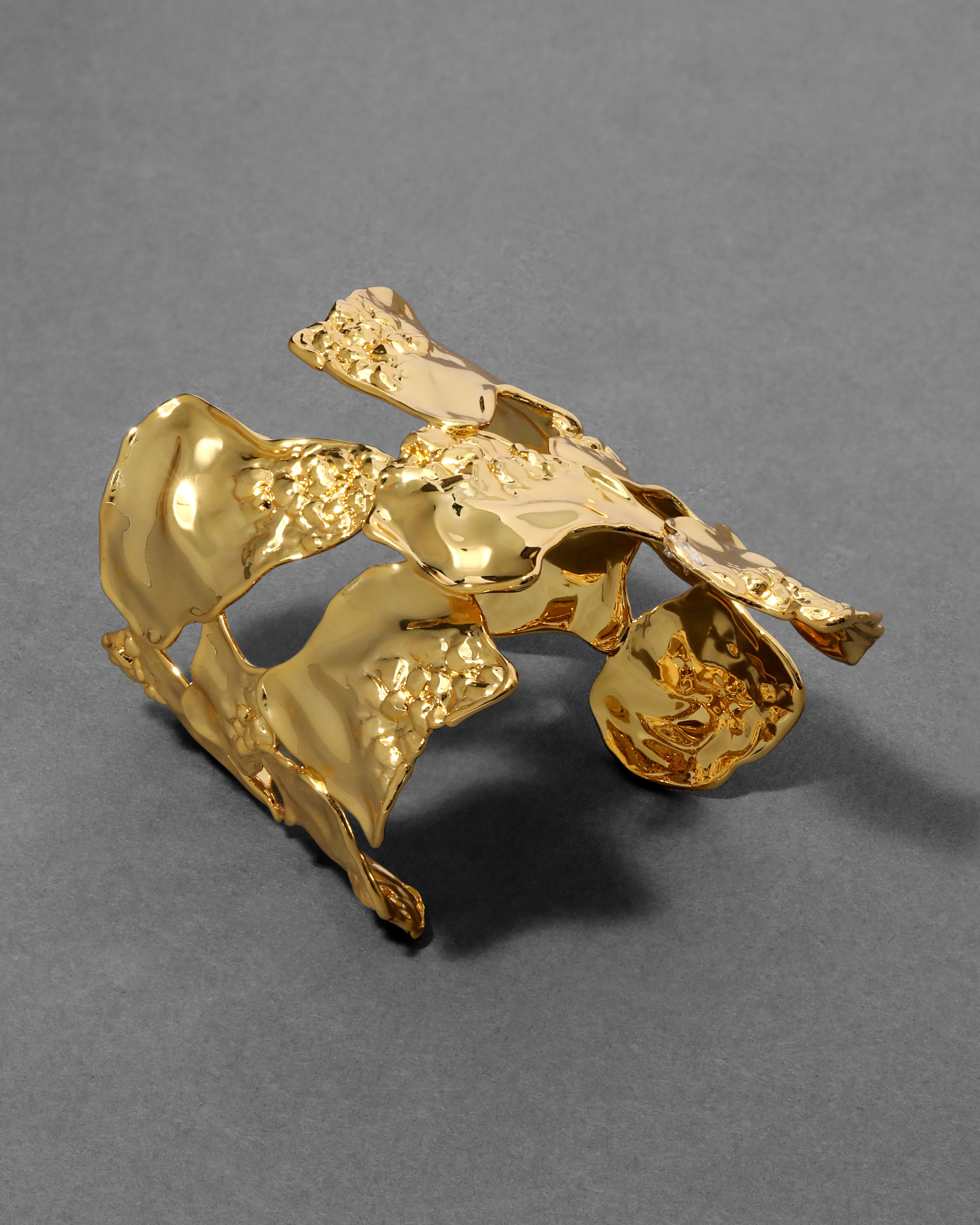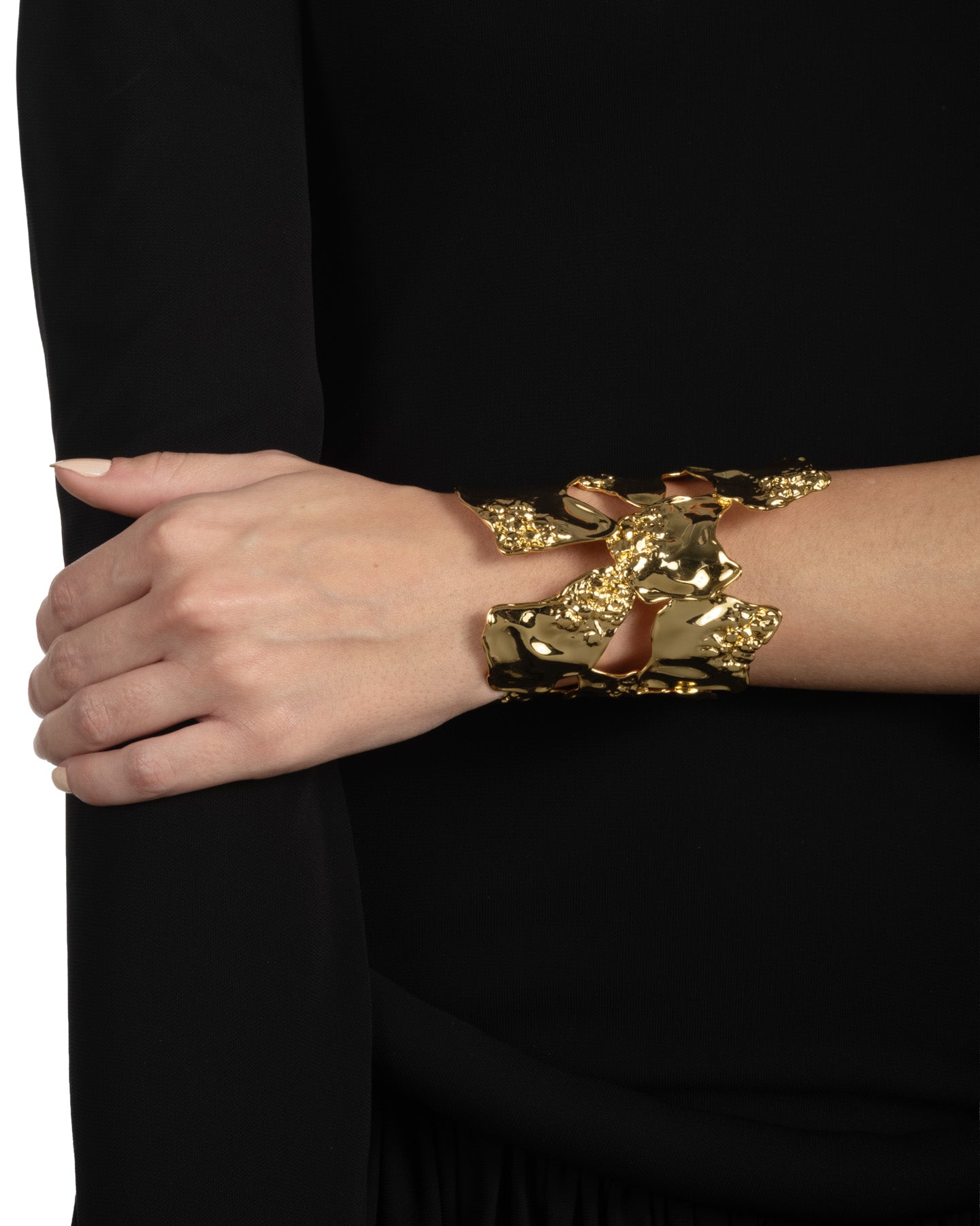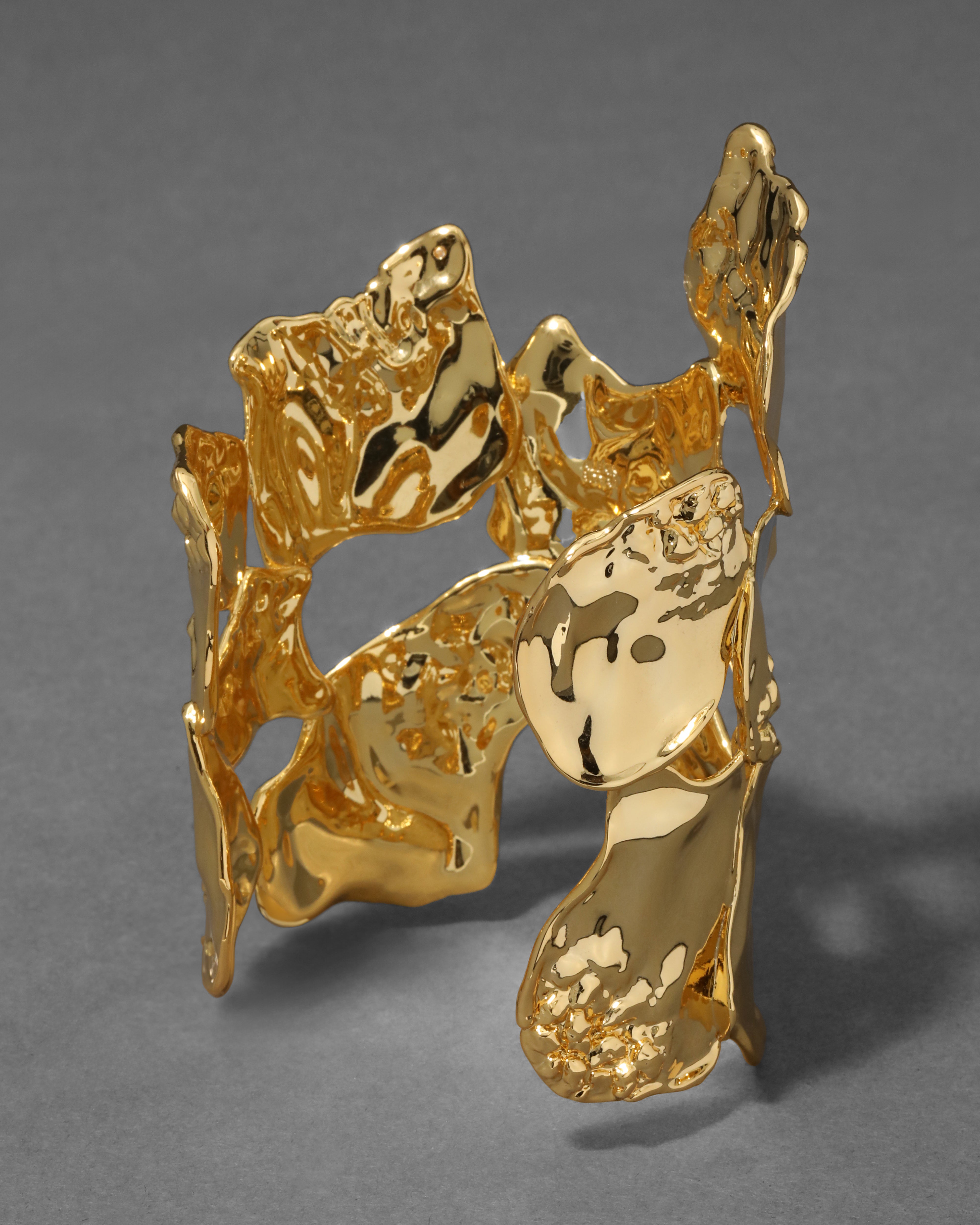 This Brutalist inspired 14k gold plated cuff bracelet features a patchwork of highly textured metalwork, for a bold silhouette that plays with negative space and scale.