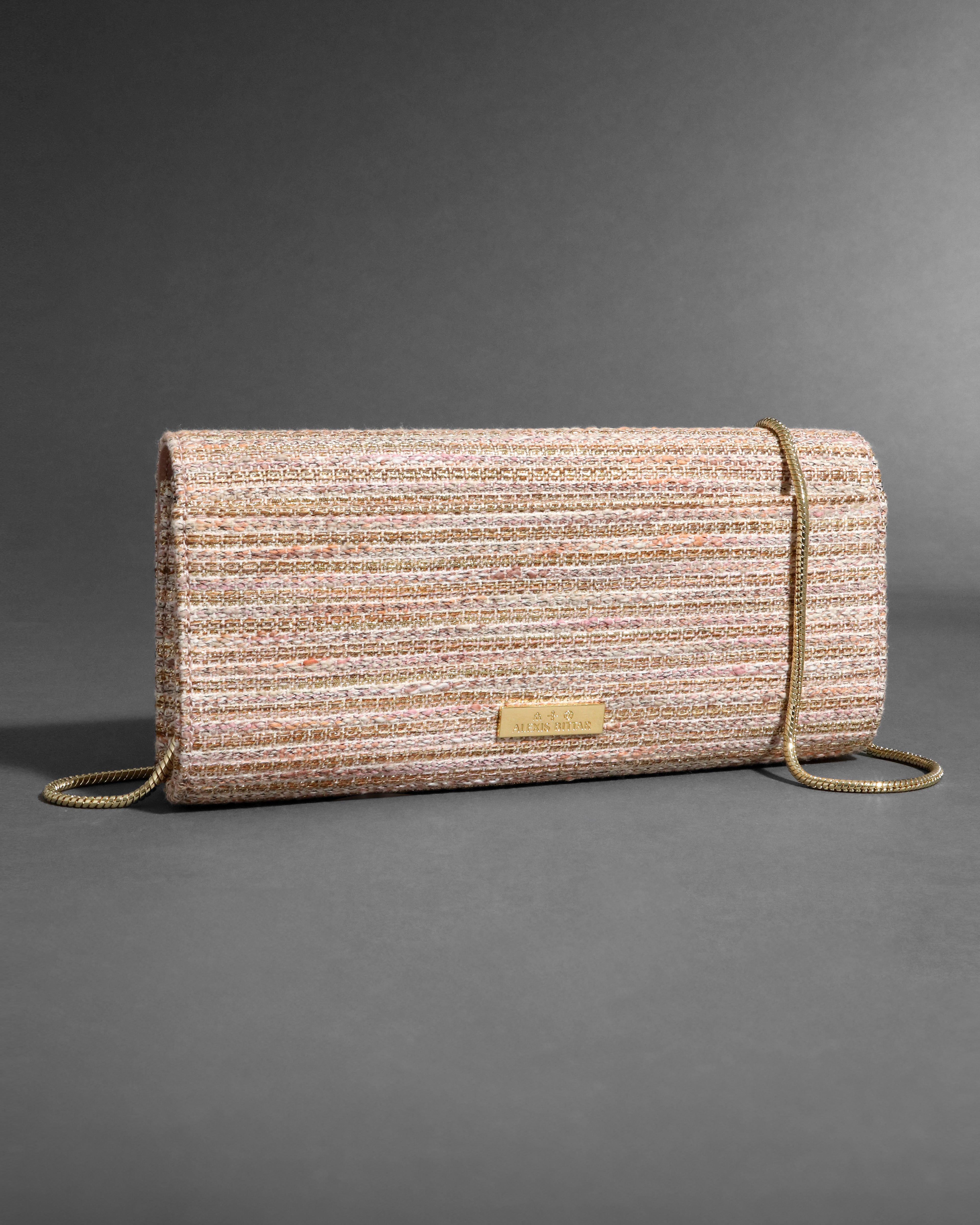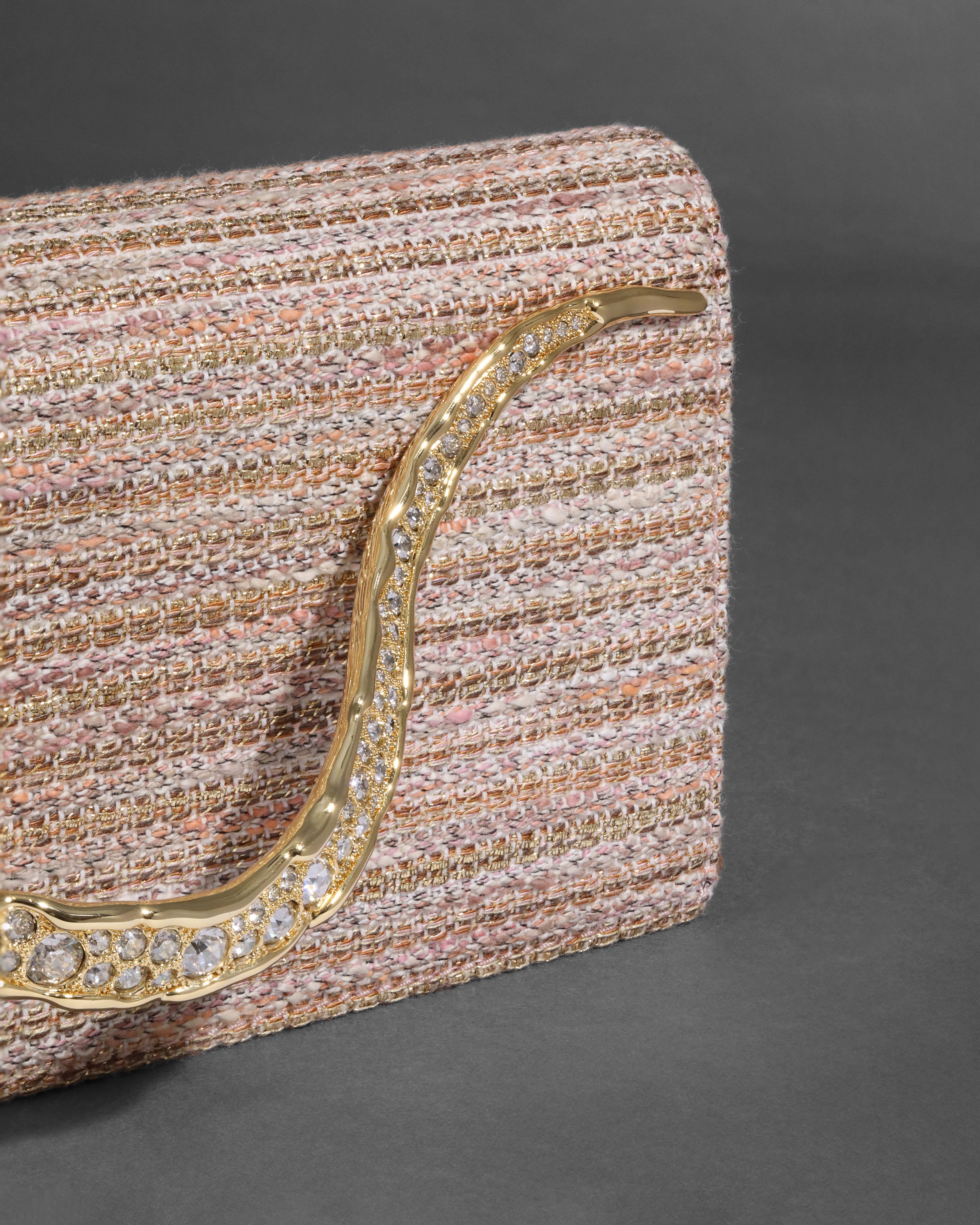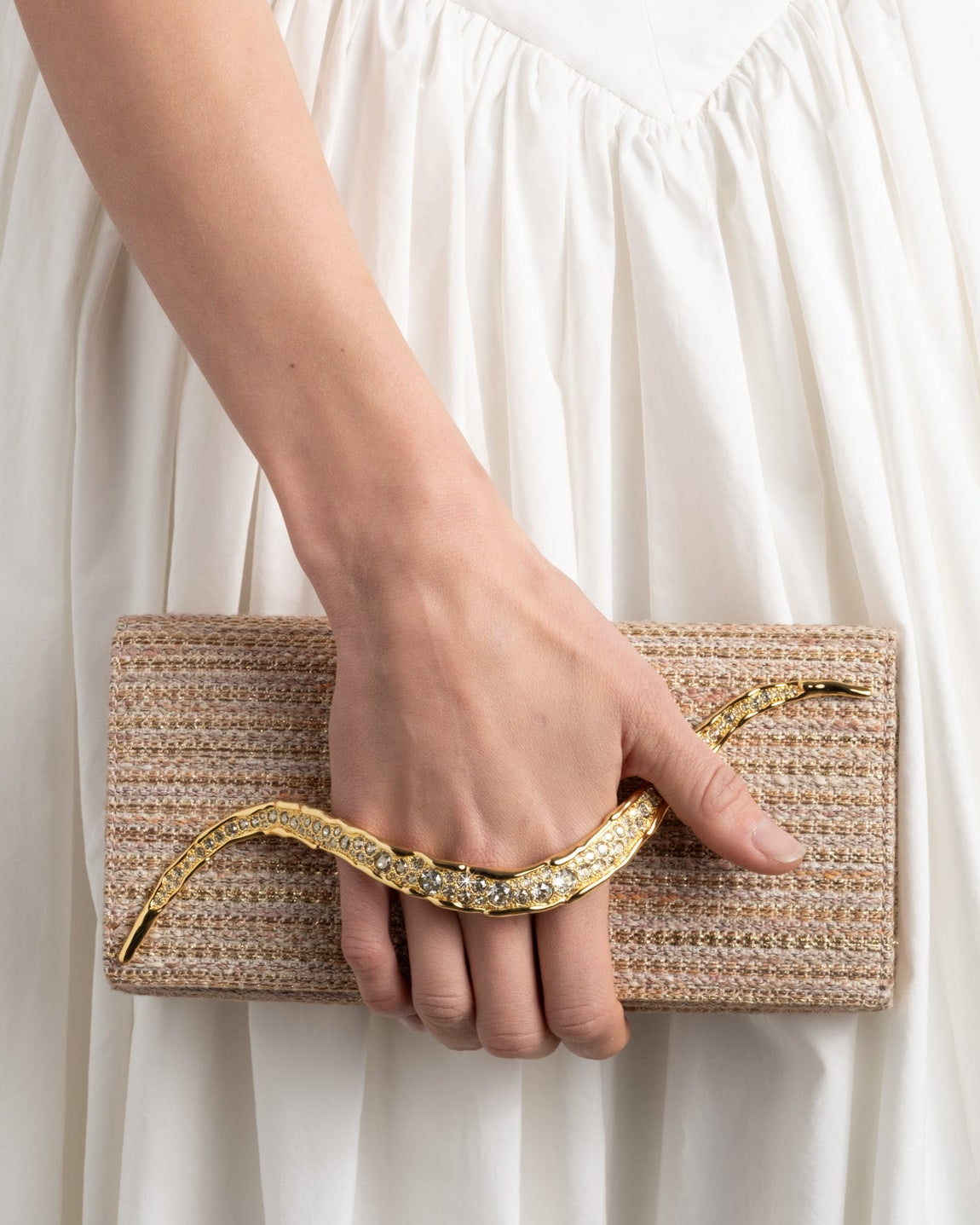 The Crystal Curve Clutch has sinuous 14k gold plated crystal pavé hardware that cascades across the front and is perfectly crafted for your hand to glide through and hold. The structured blush pink silhouette is composed of timeless tweed fabric with a coordinating blush pink leather interior.