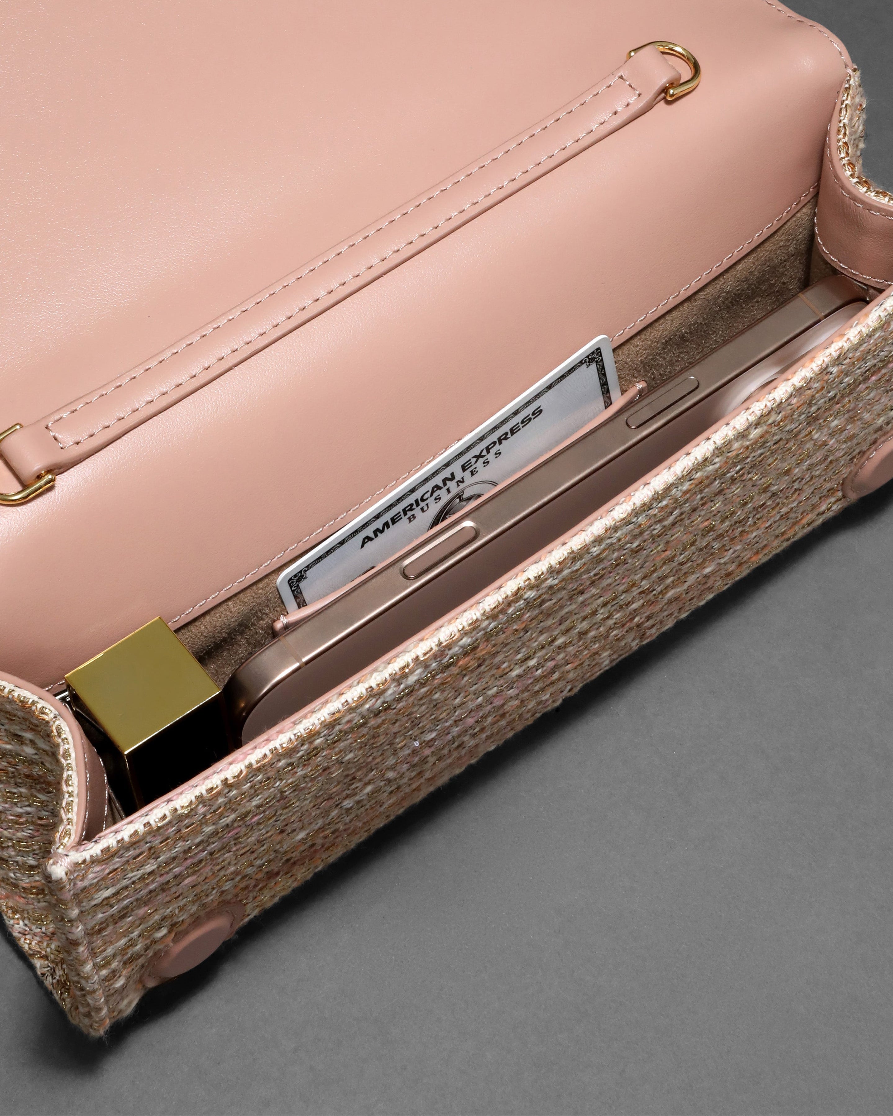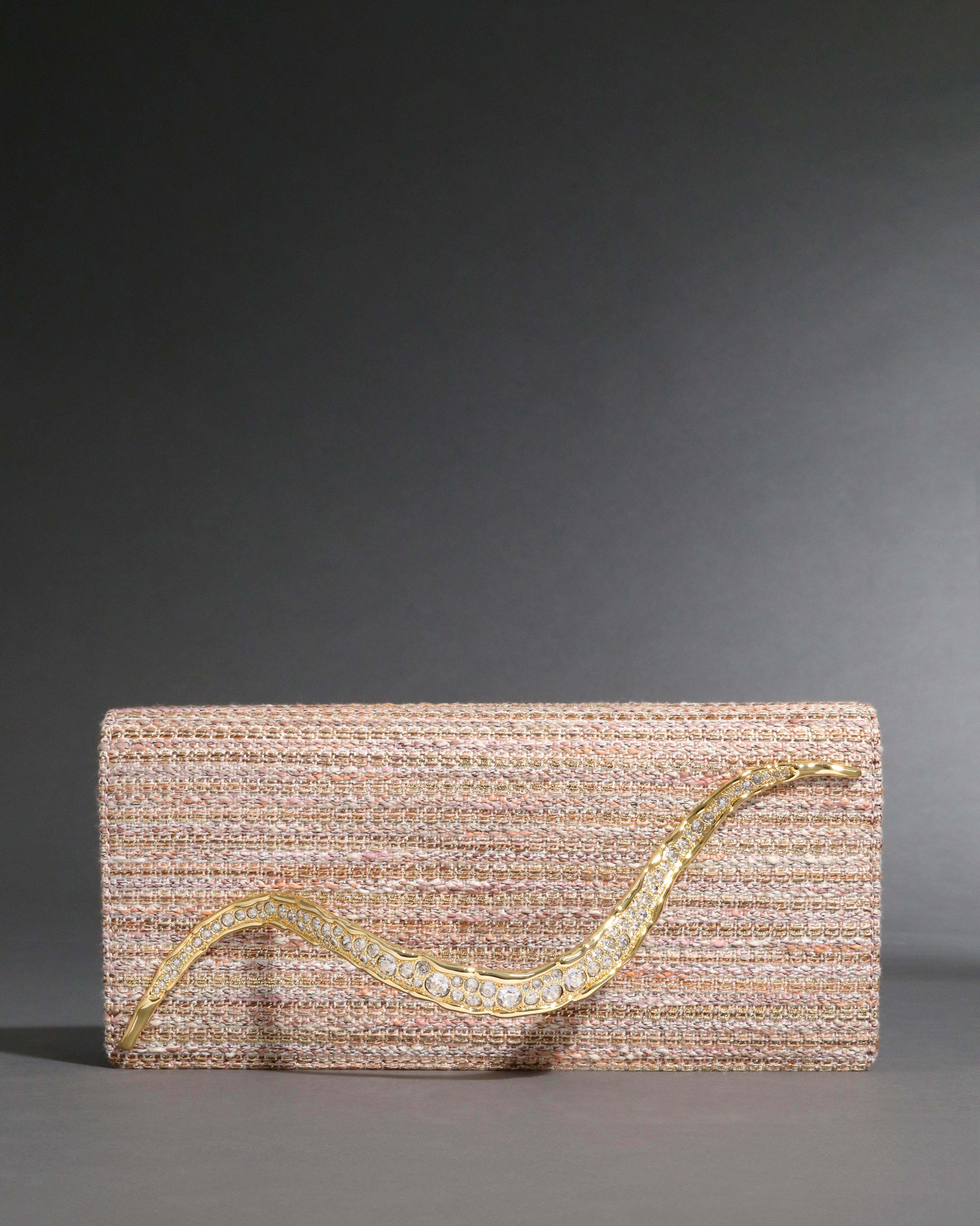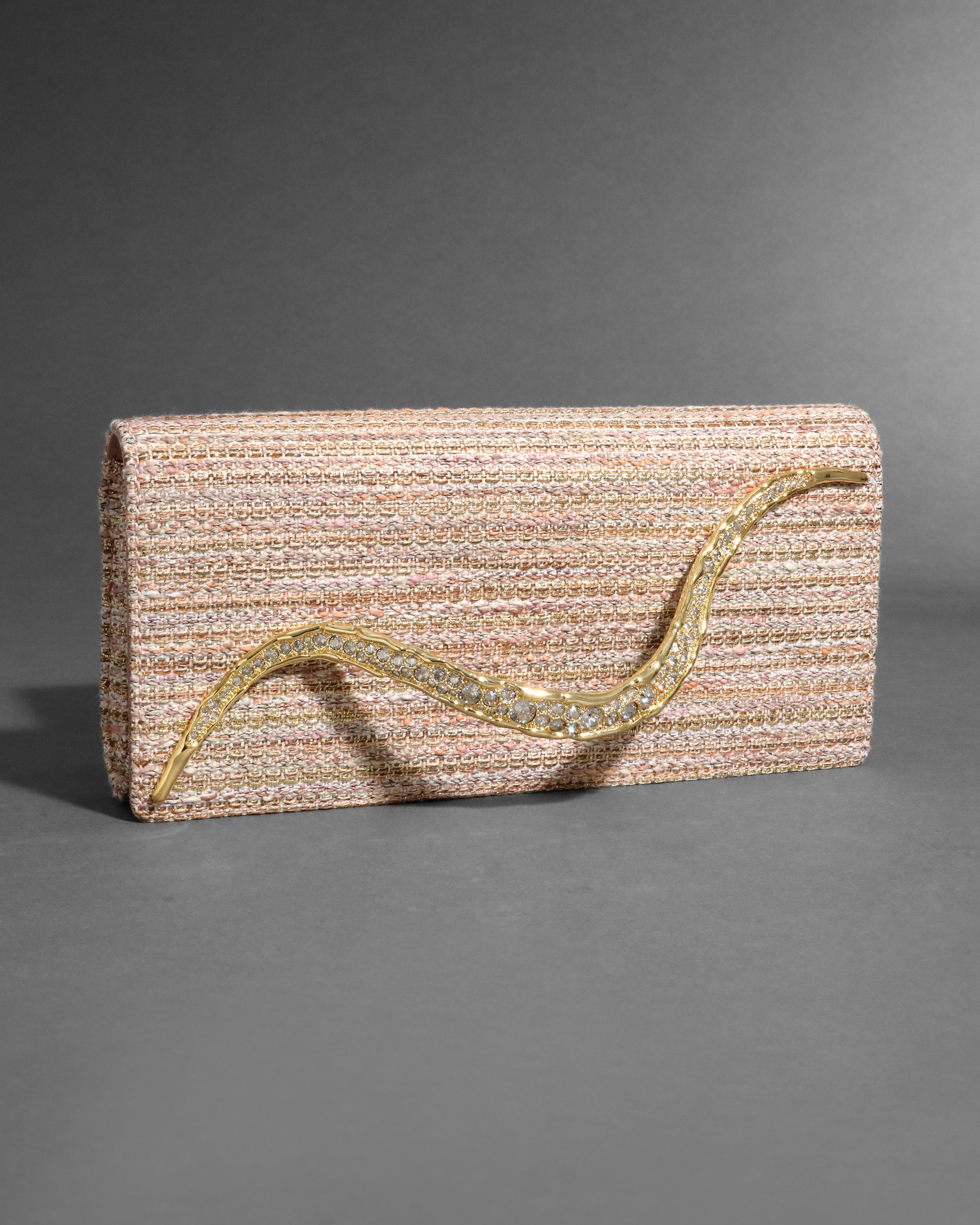 The Crystal Curve Clutch has sinuous 14k gold plated crystal pavé hardware that cascades across the front and is perfectly crafted for your hand to glide through and hold. The structured blush pink silhouette is composed of timeless tweed fabric with a coordinating blush pink leather interior.