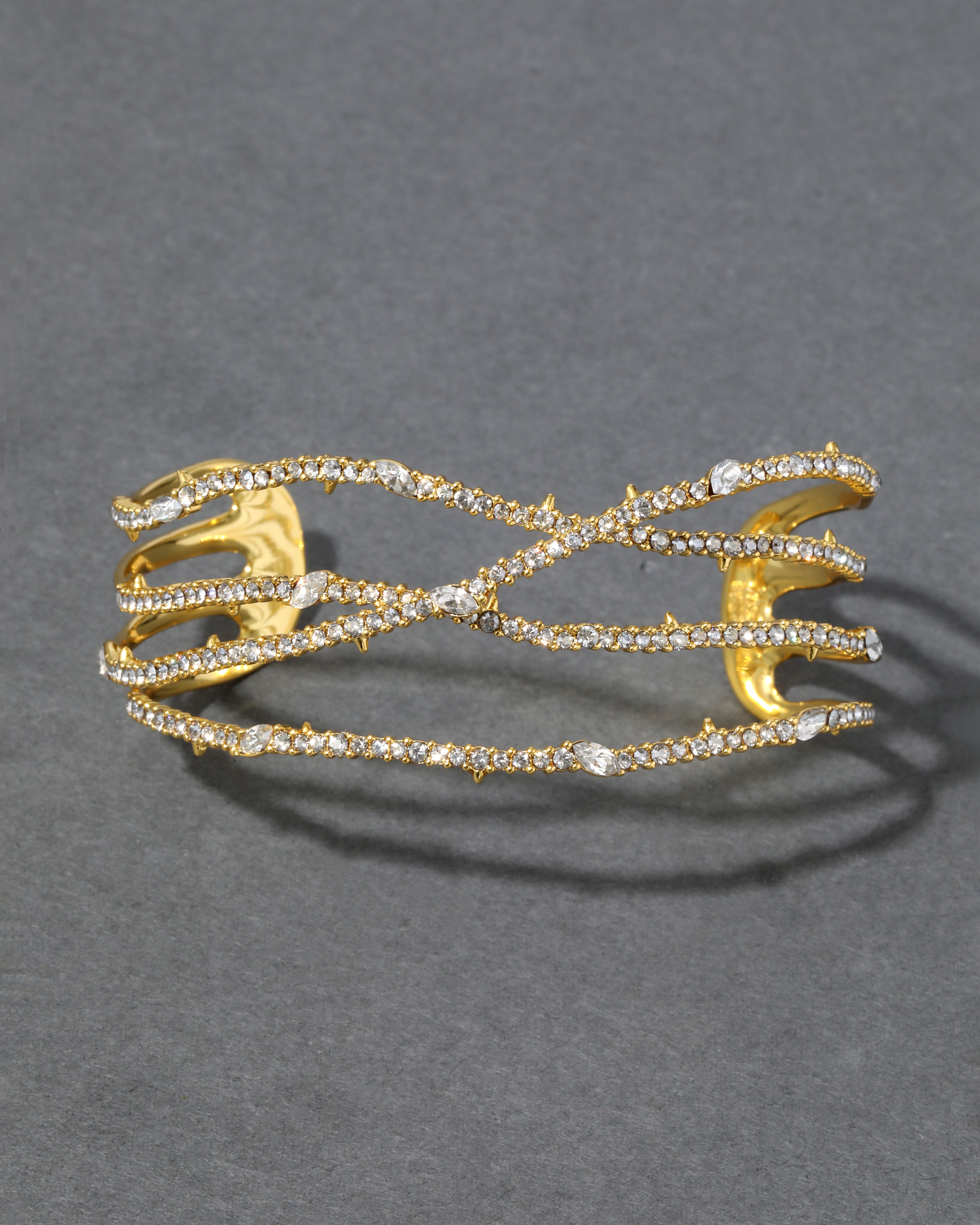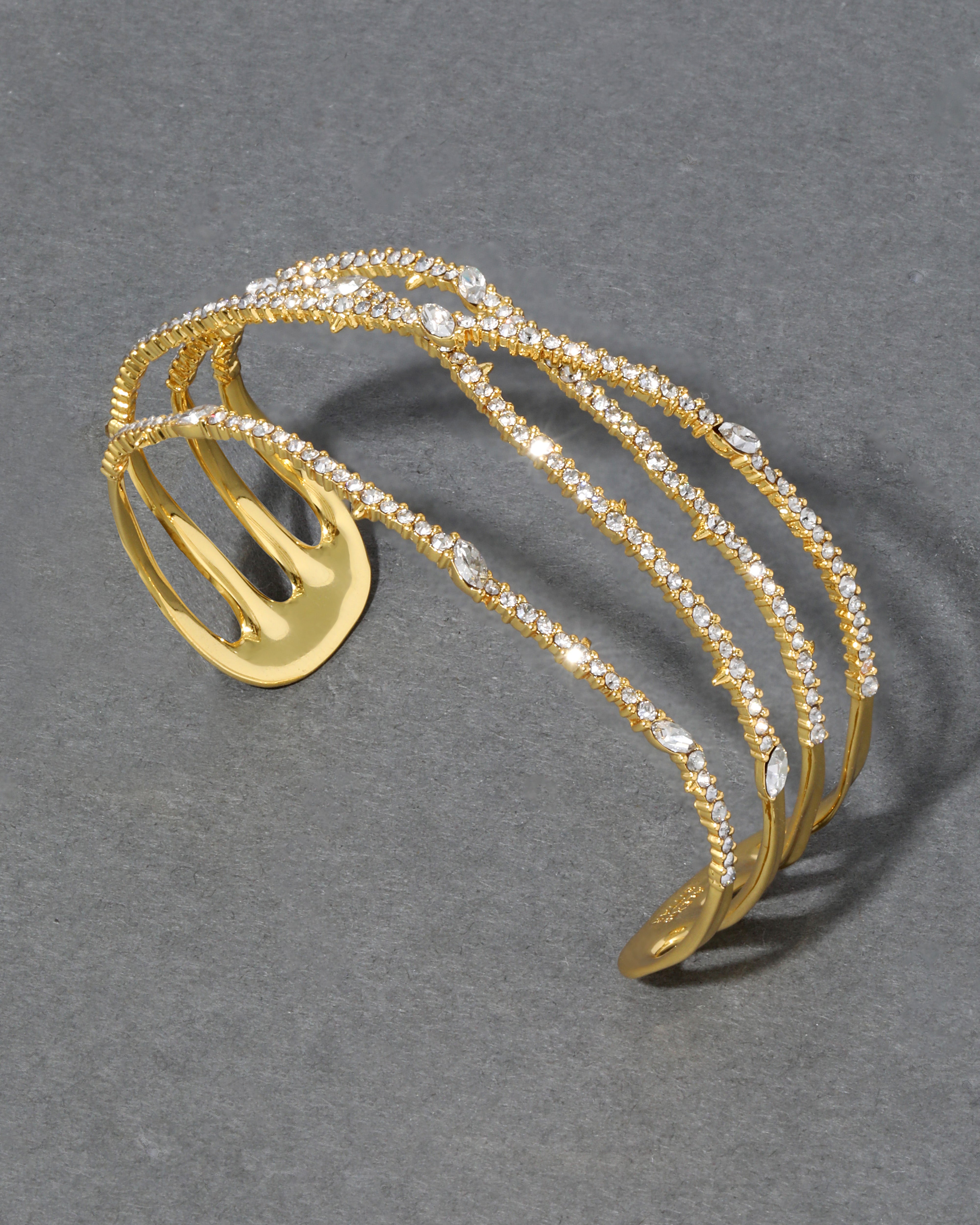 This cuff bracelet features delicate orbiting metalwork set with glitter crystal pave.