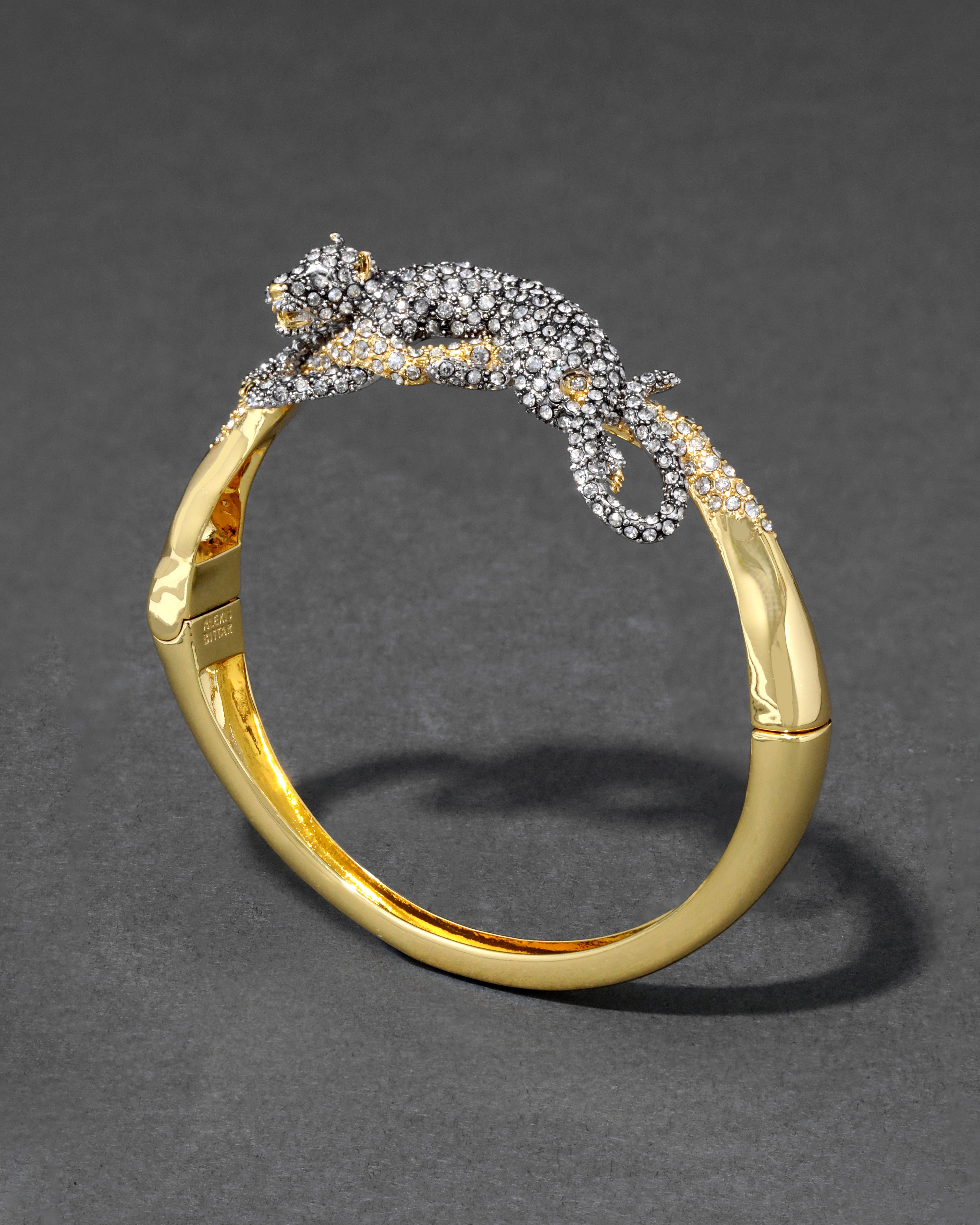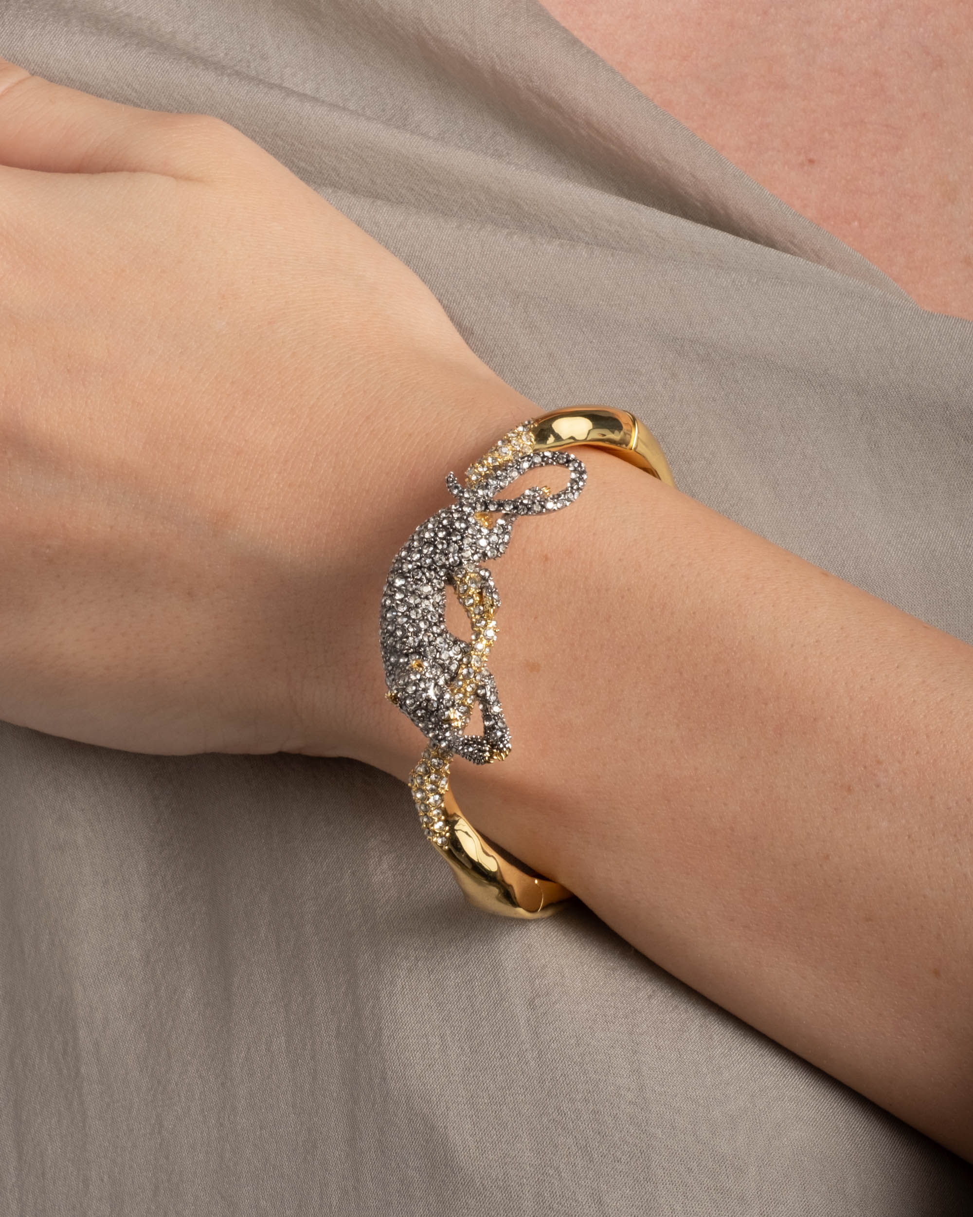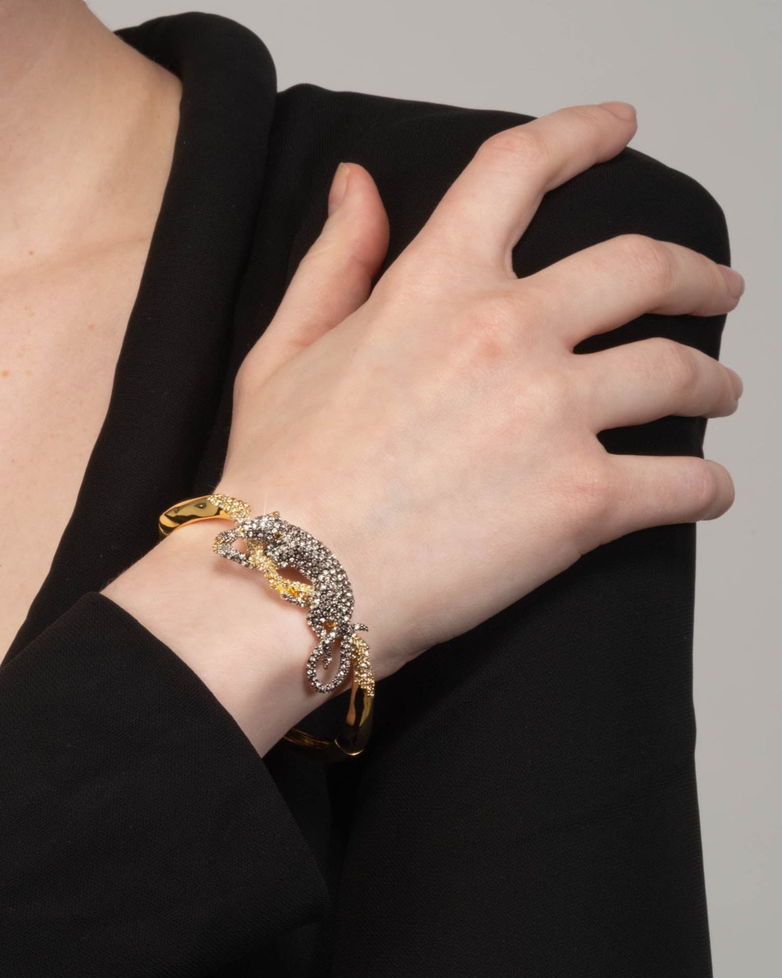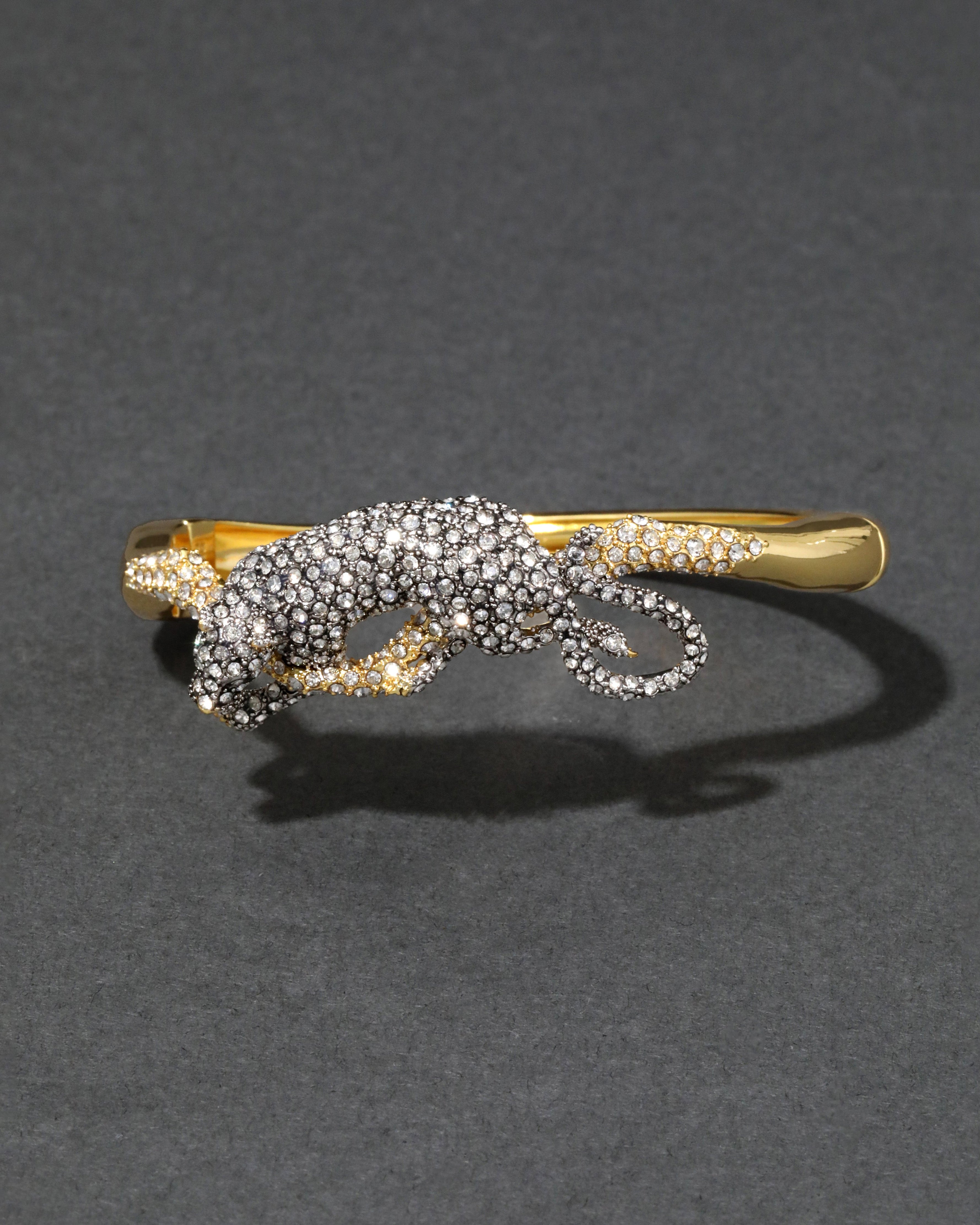Encrusted in pave crystal details, a sculptural gunmetal tone plated panther sprawls onto a branch atop this stunning 14k gold plated hinged bracelet.