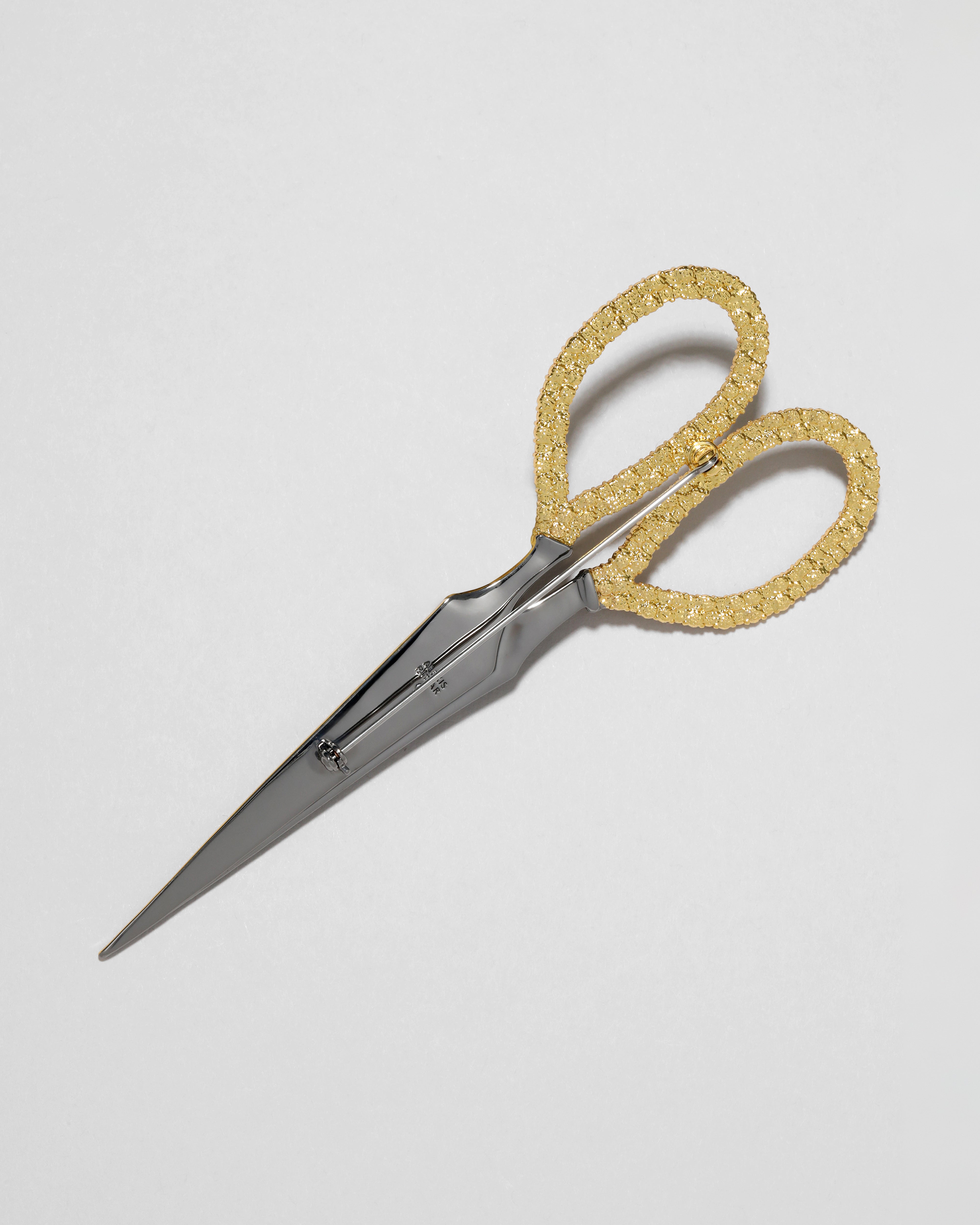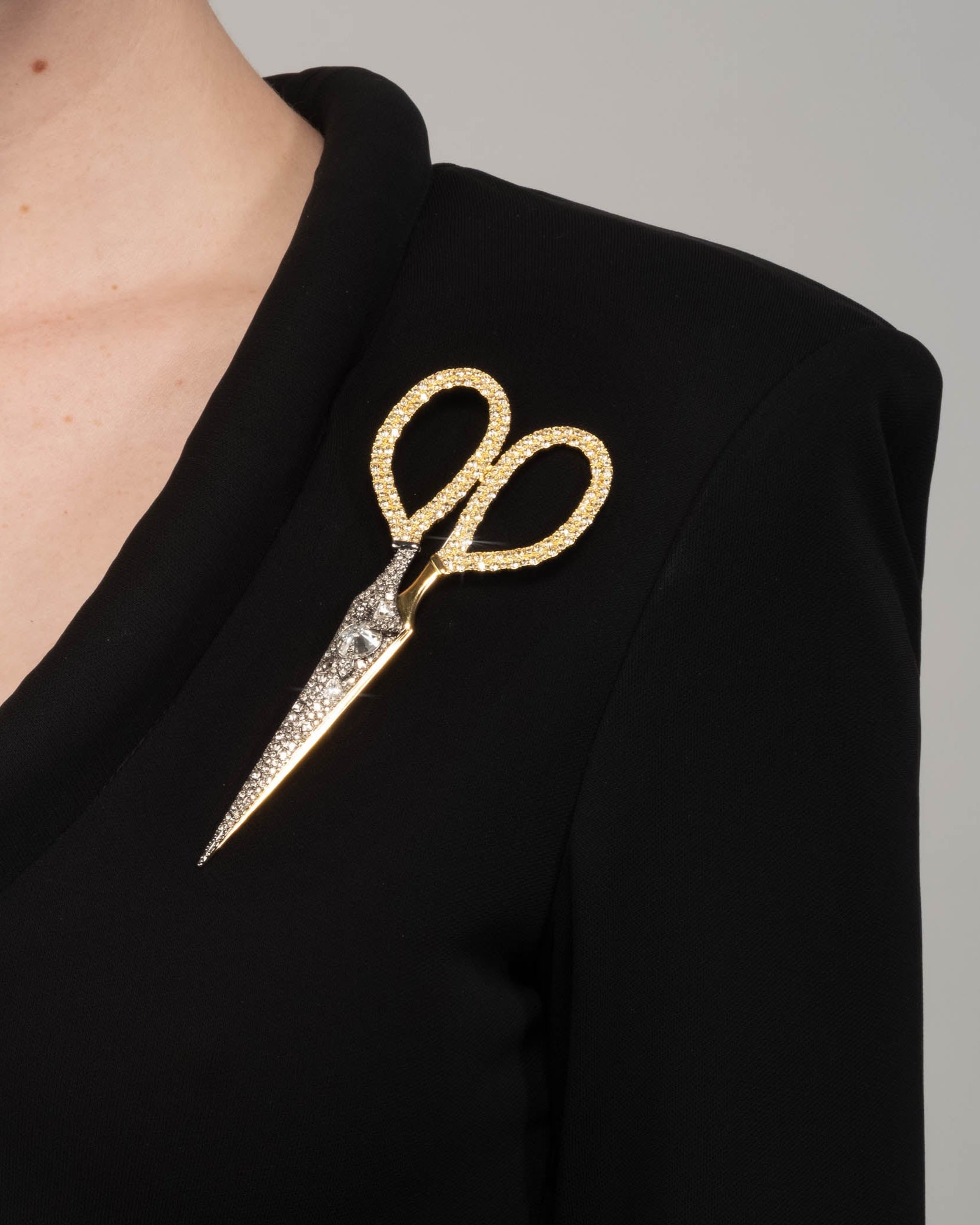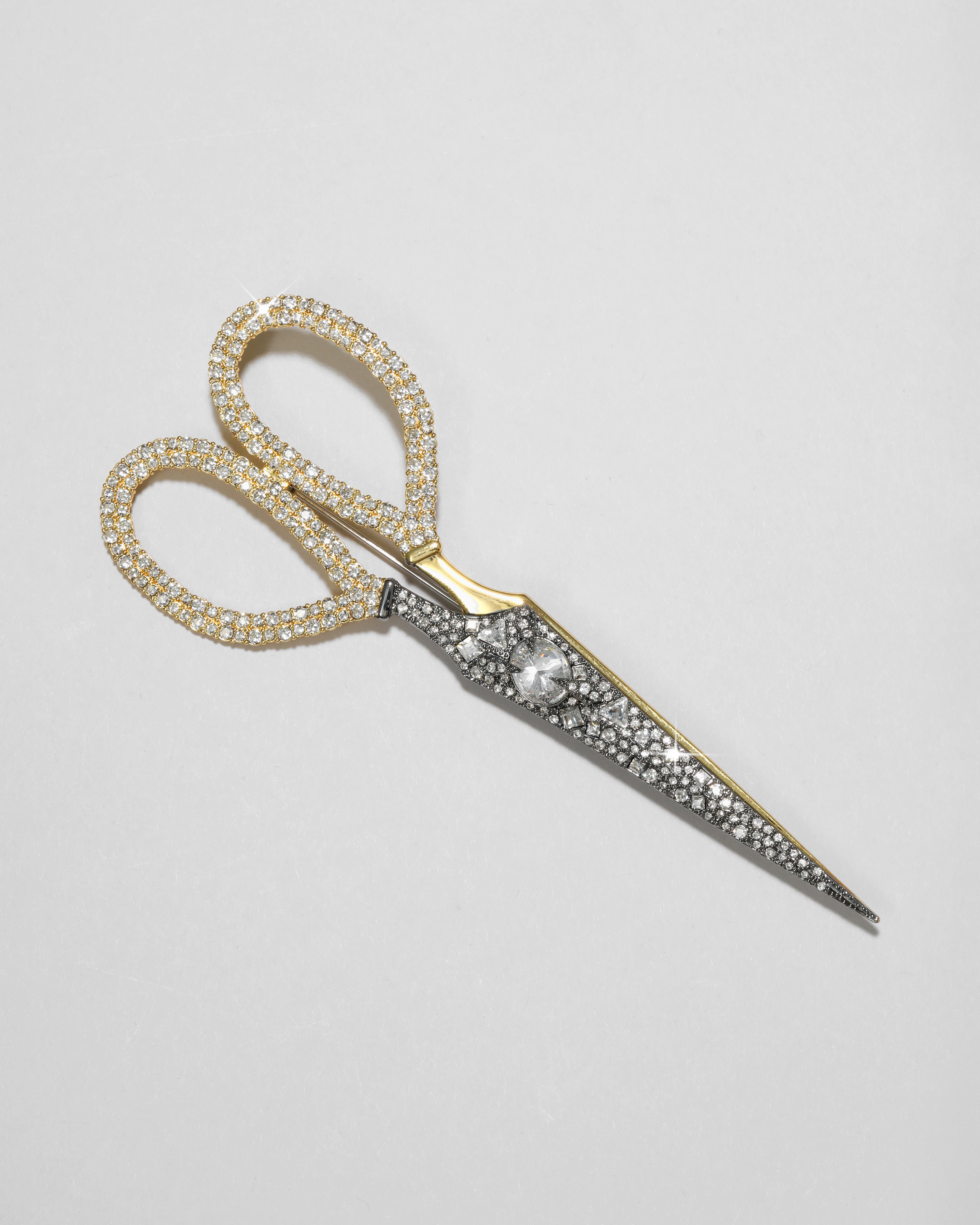 Originally from the Coveteur '17 collection, this two tone striking scissor pin features ornate silver tone and 14k gold tone plated metalwork. Dazzling with ornate crystal pavé that will be sure to make an opulent statement on any lapel.