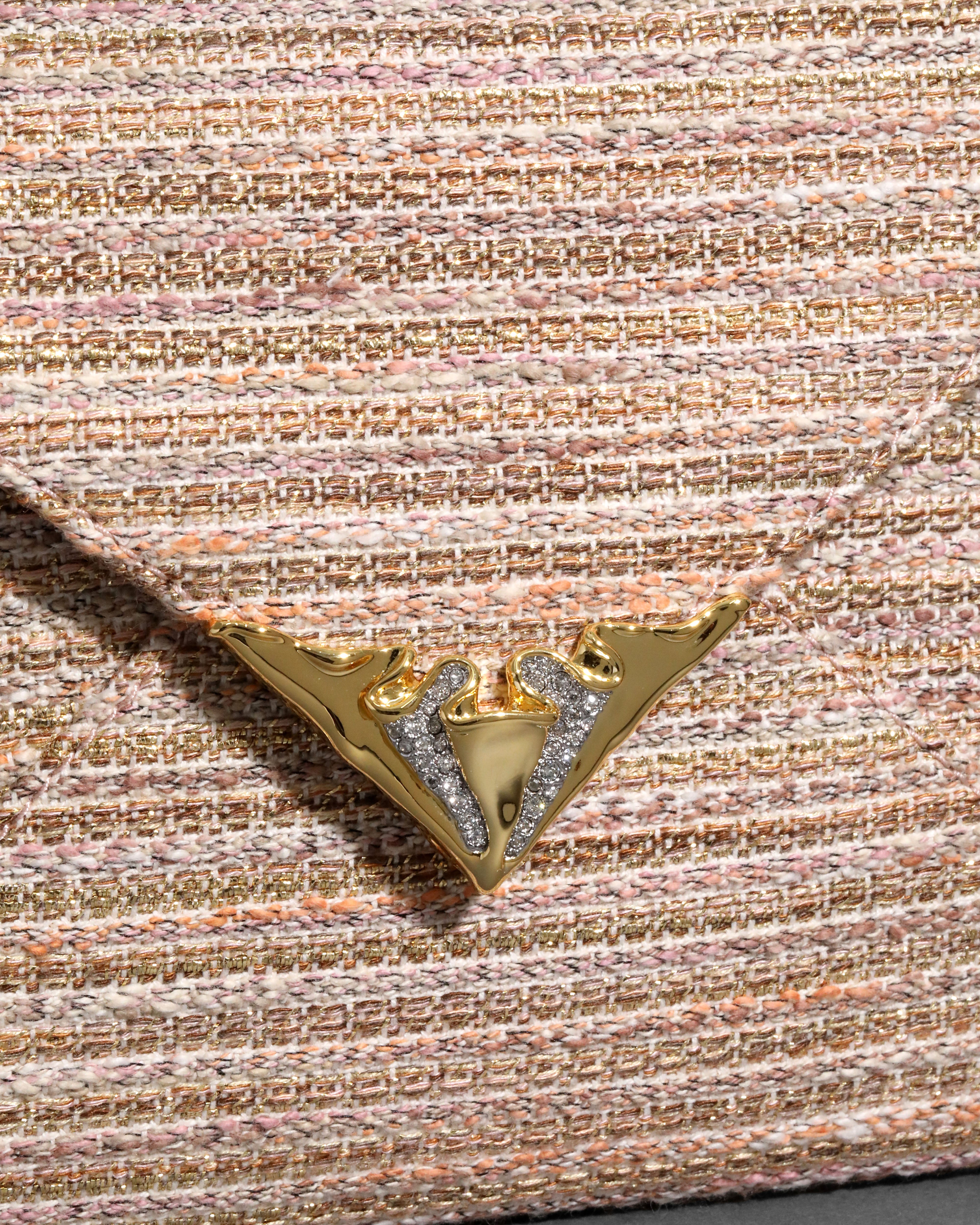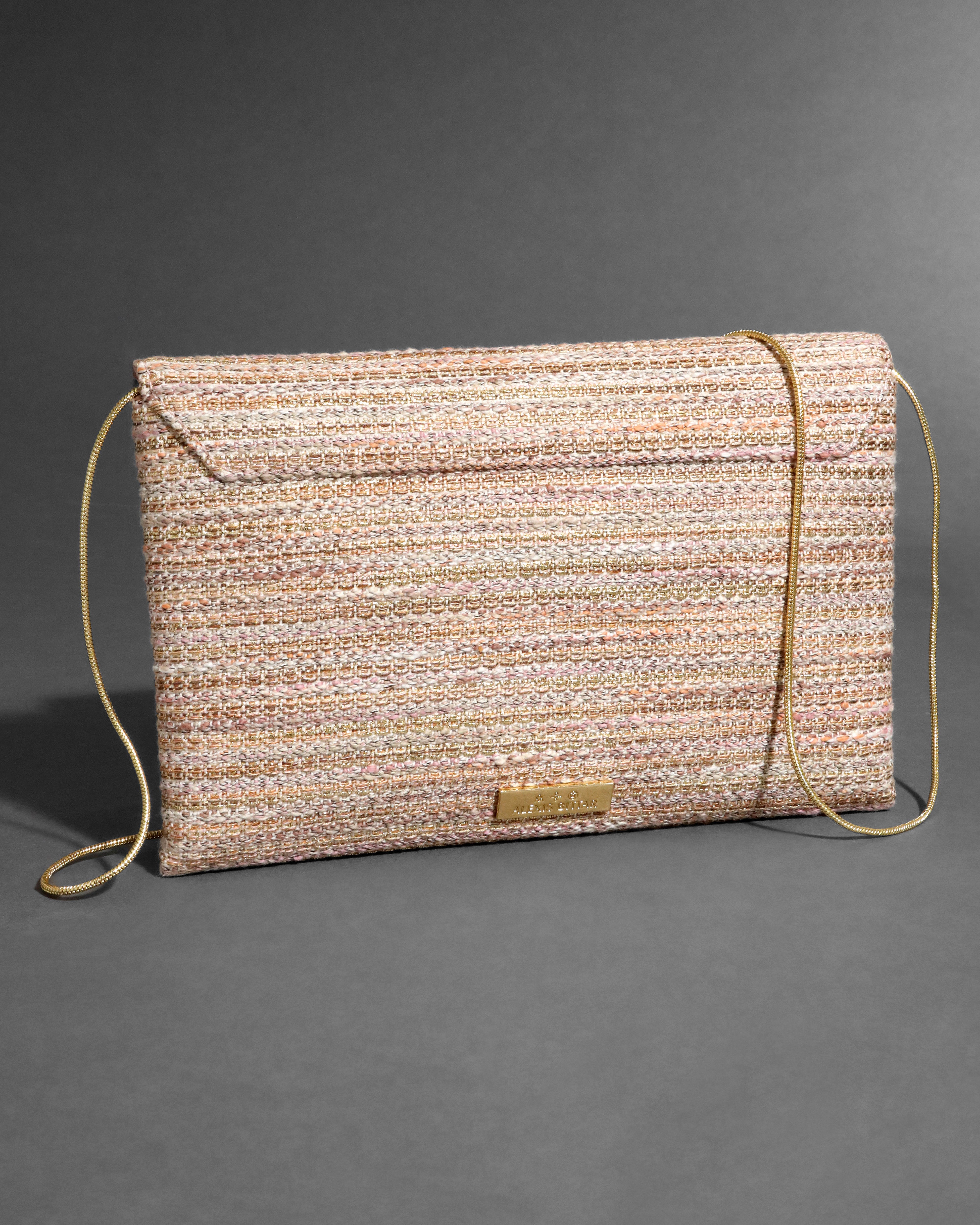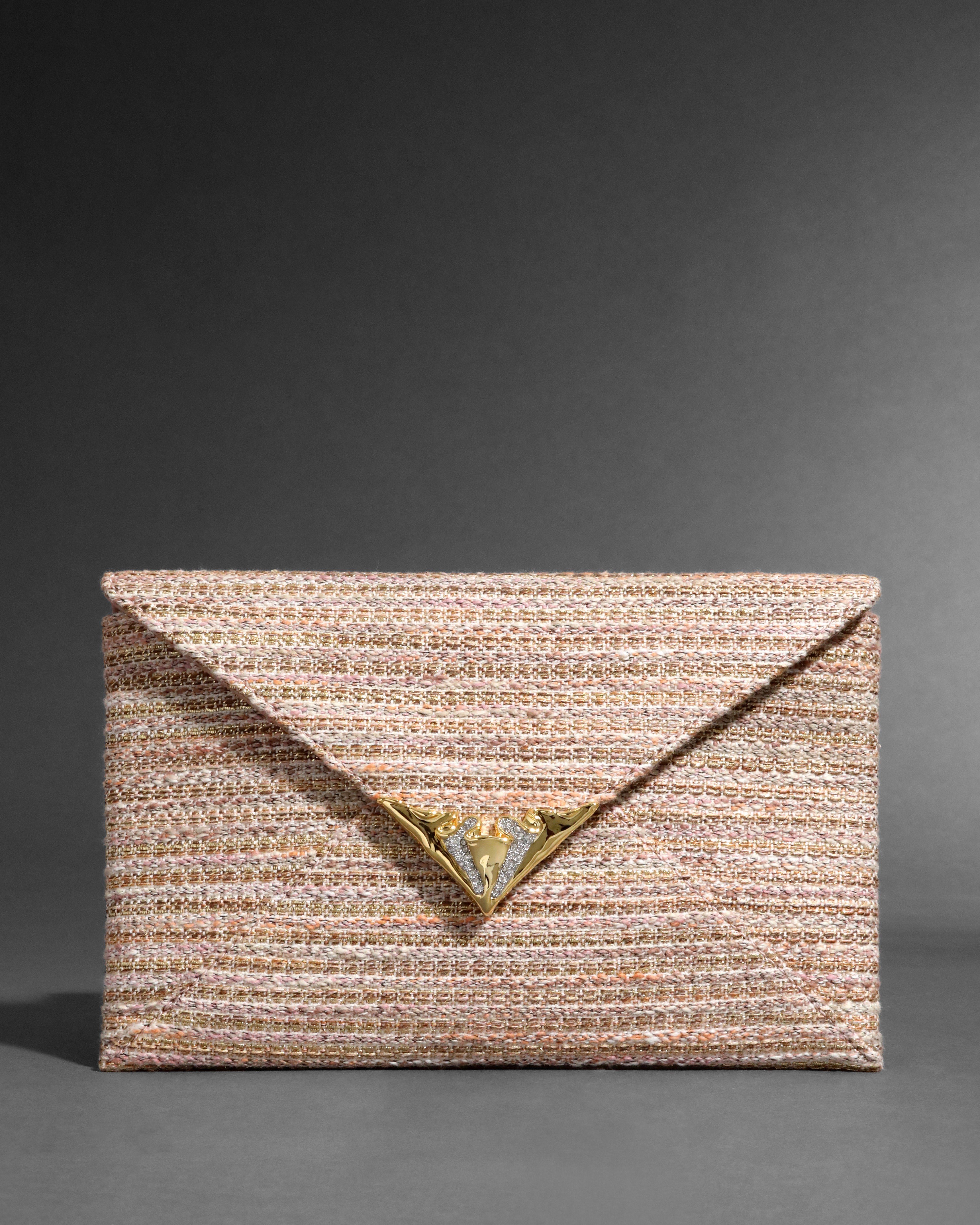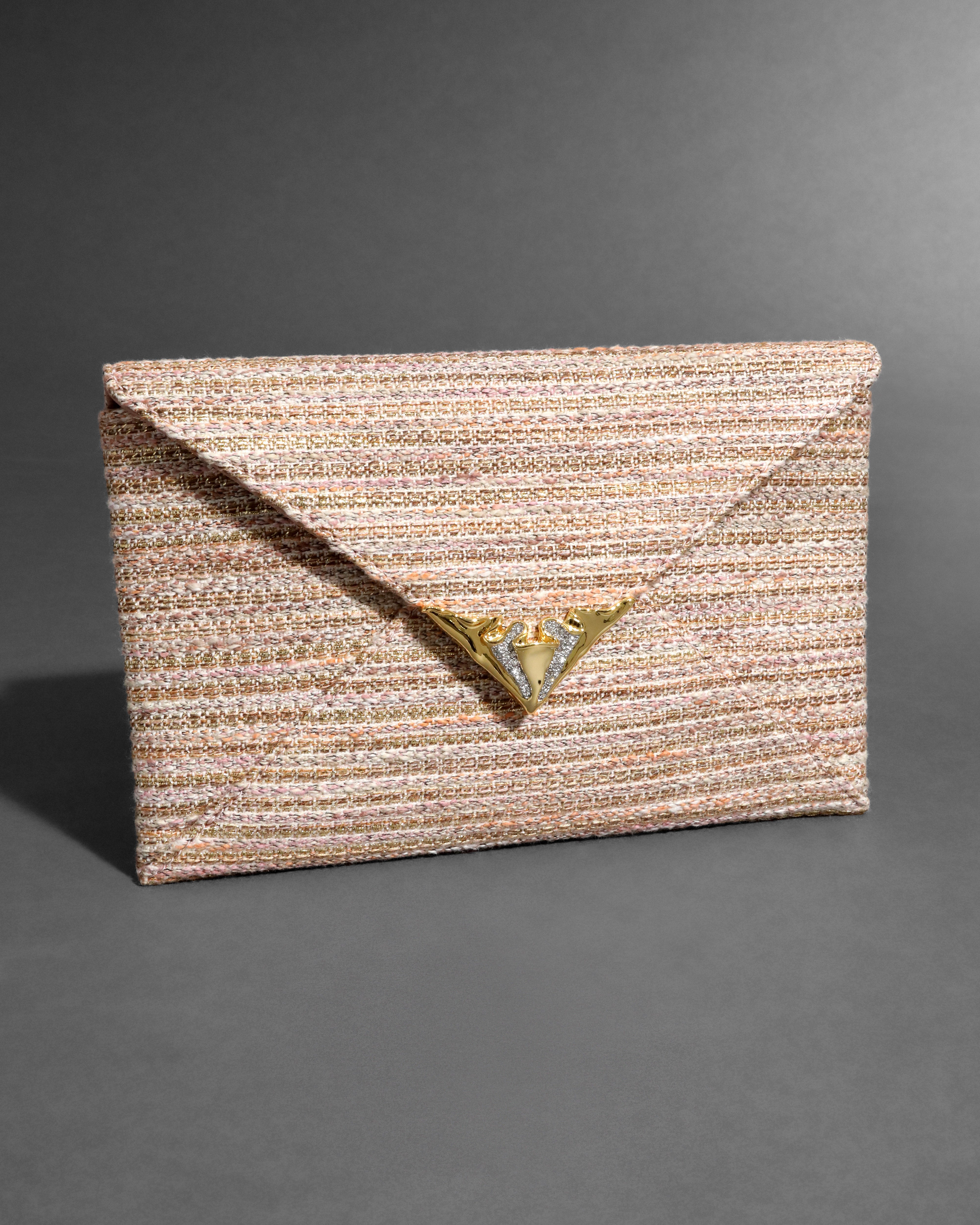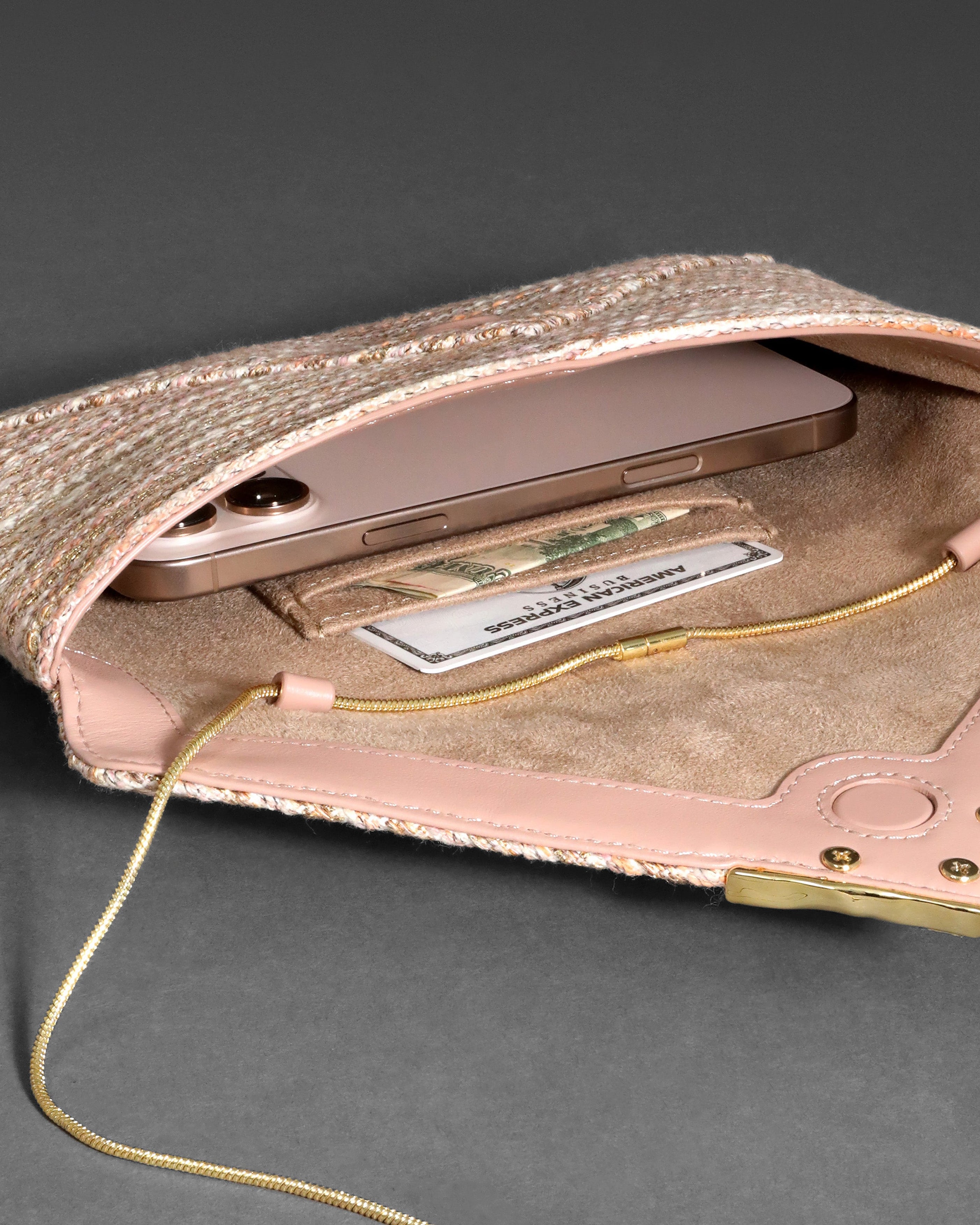 This sleek new addition to the Alexis Bittar handbag line has a classic envelope-style silhouette, in a timeless blush tweed with a coordinating blush pink leather interior. Capped with crystal pavé accented signature crumpled hardware at center flap. Can be carried as a clutch or over the shoulder, using the 14k gold plated snake chain strap.