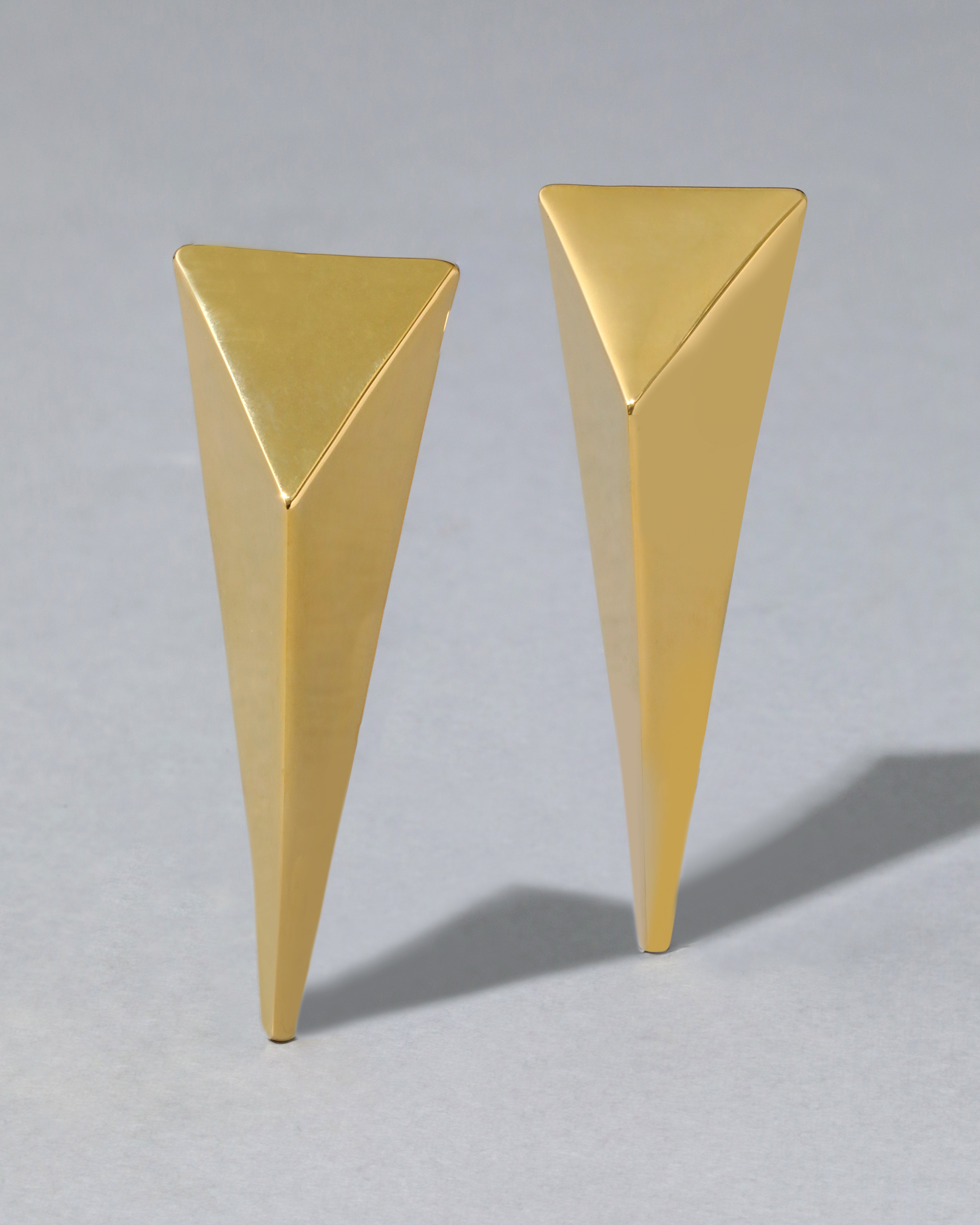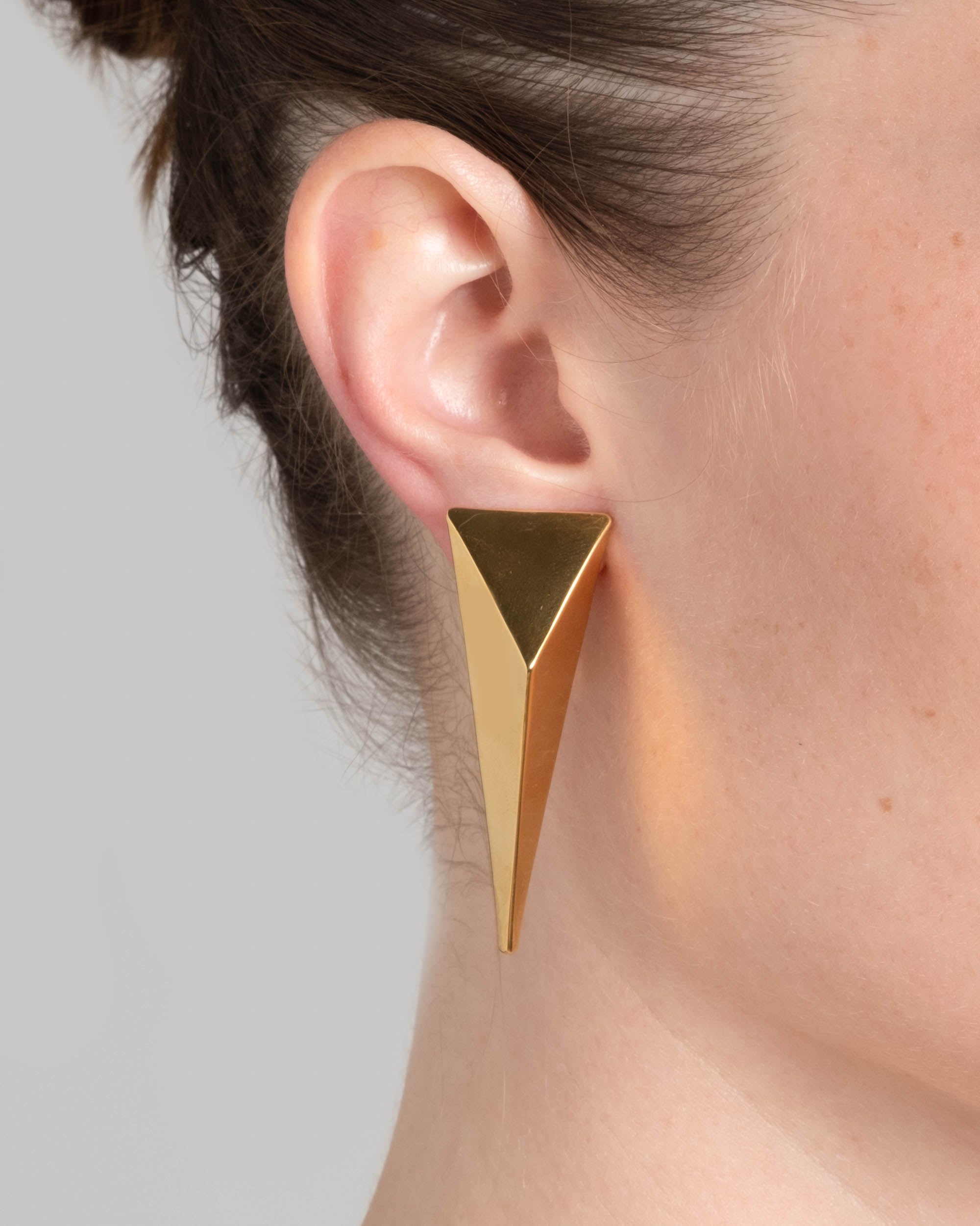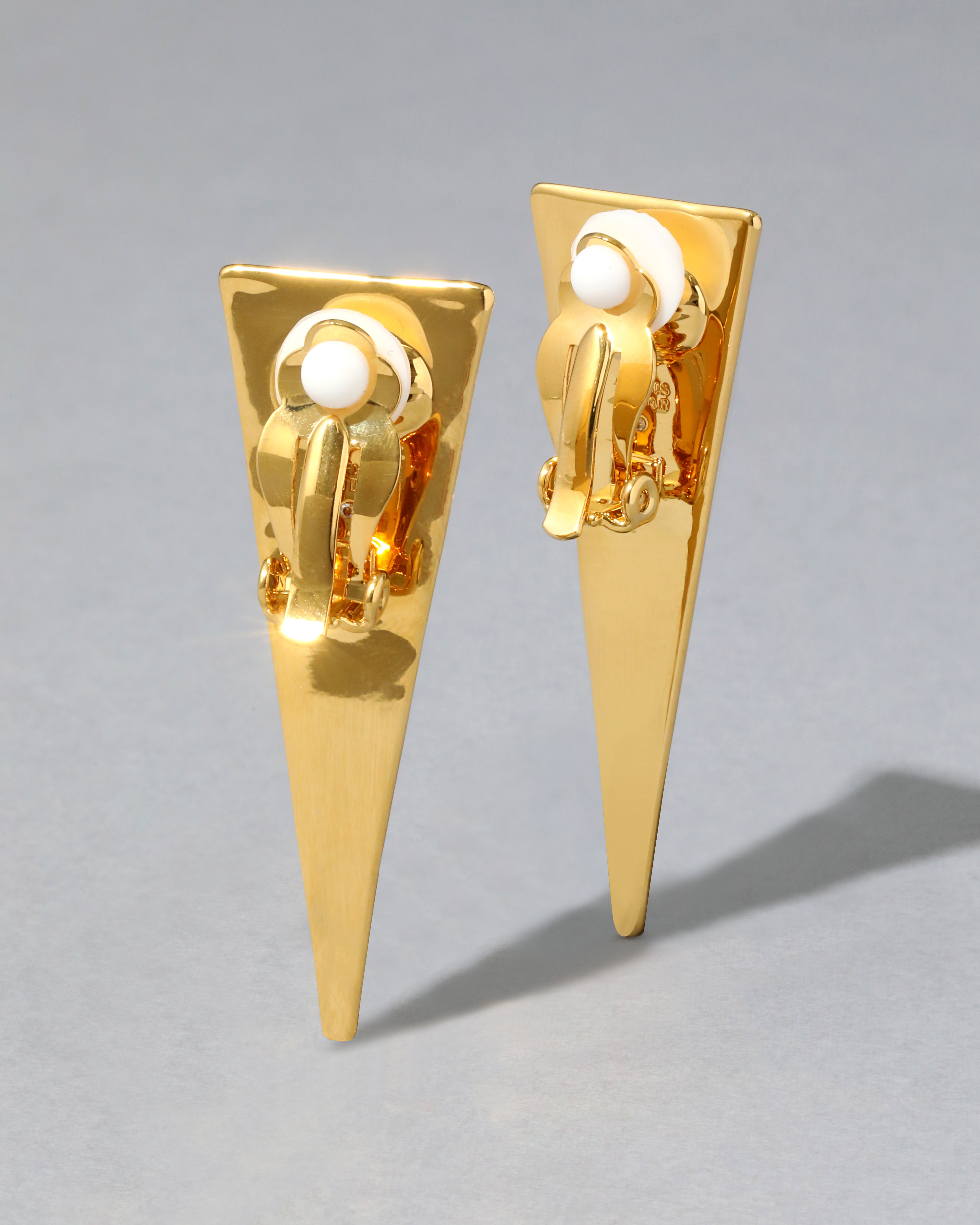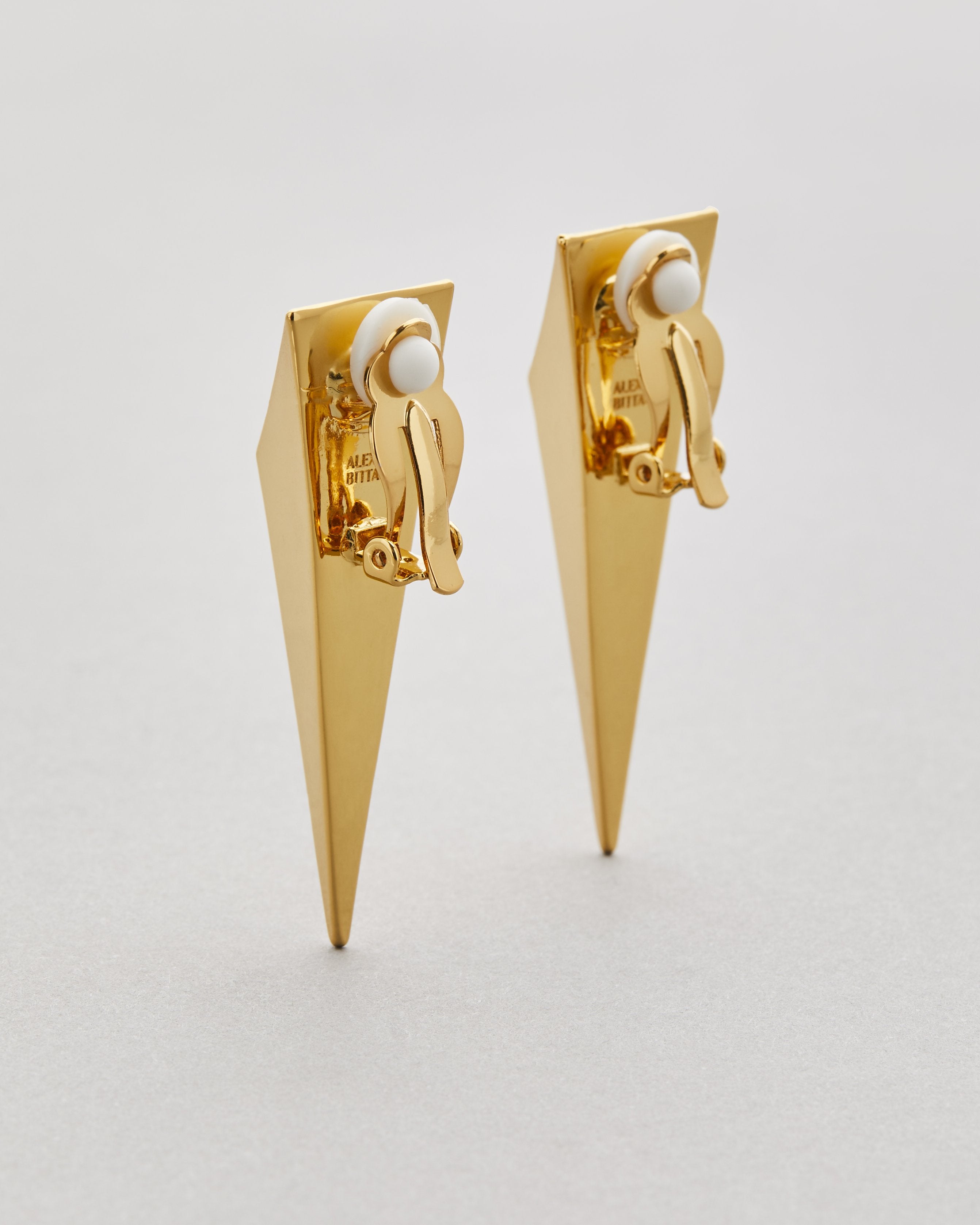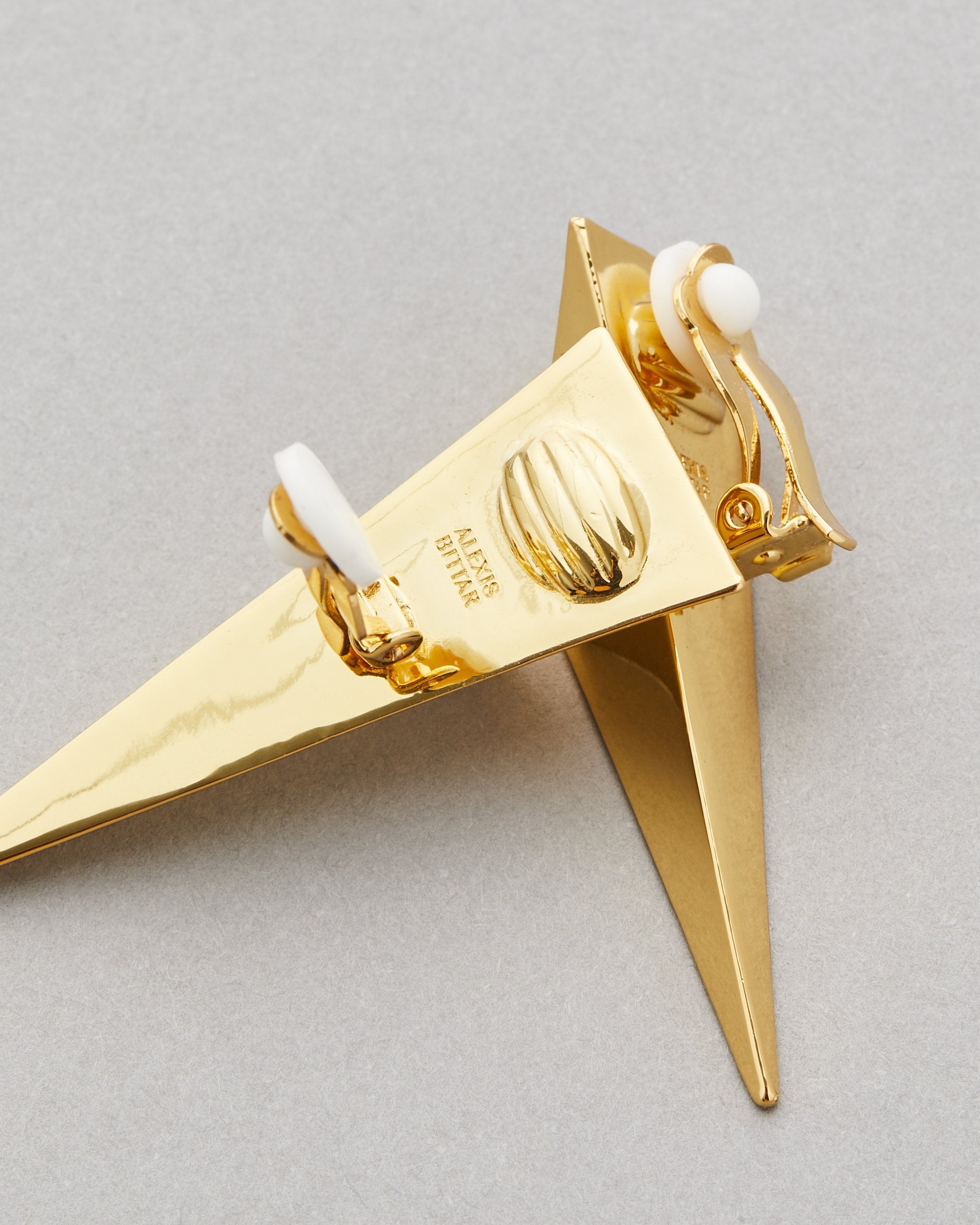 A classic Bittar silhouette, these dramatic 14k gold plated pyramid clip-on earrings have an elongated 3-dimensional form that reflects light from each gleaming angle for 1970s punk inspired glamour. Sold as a pair.