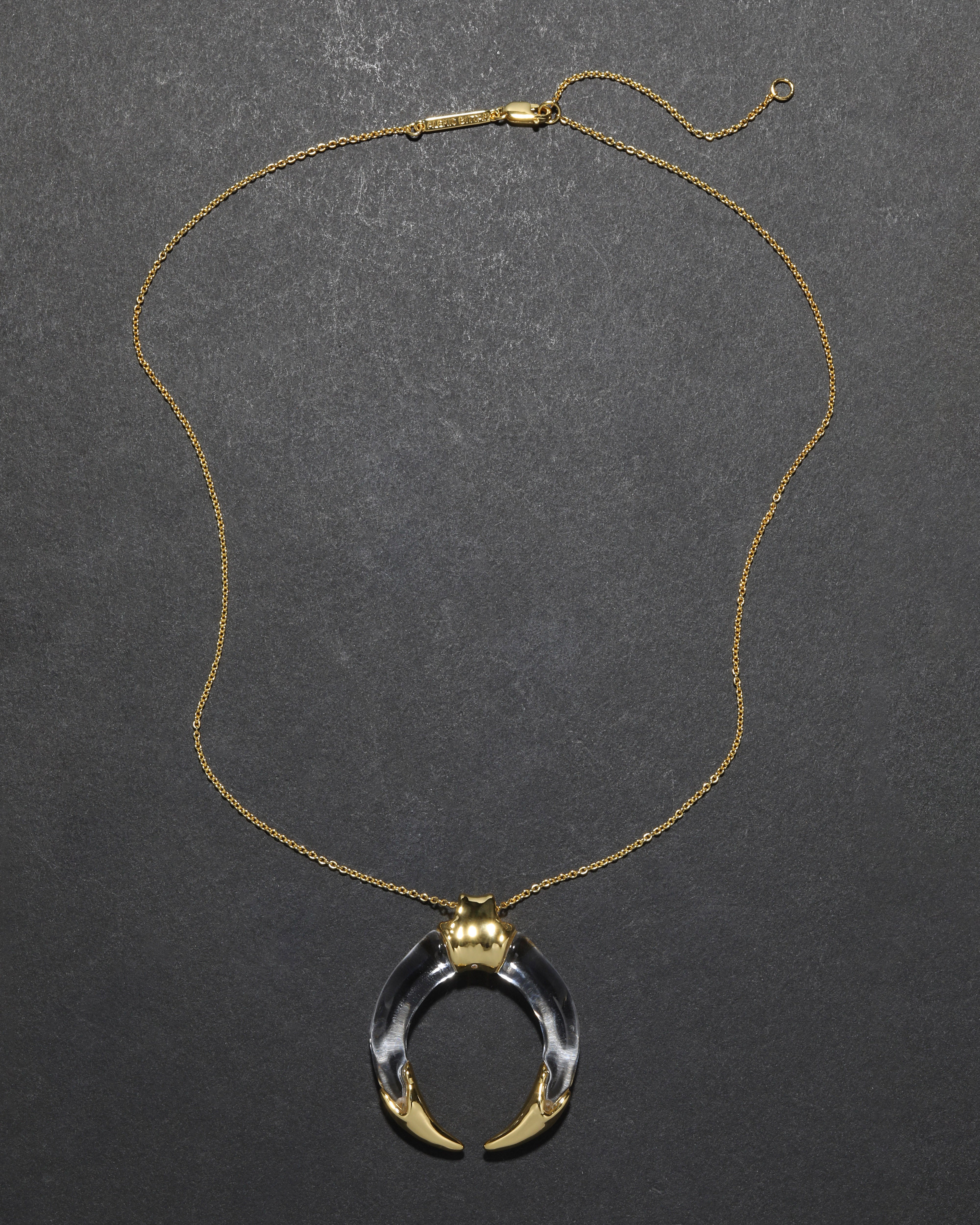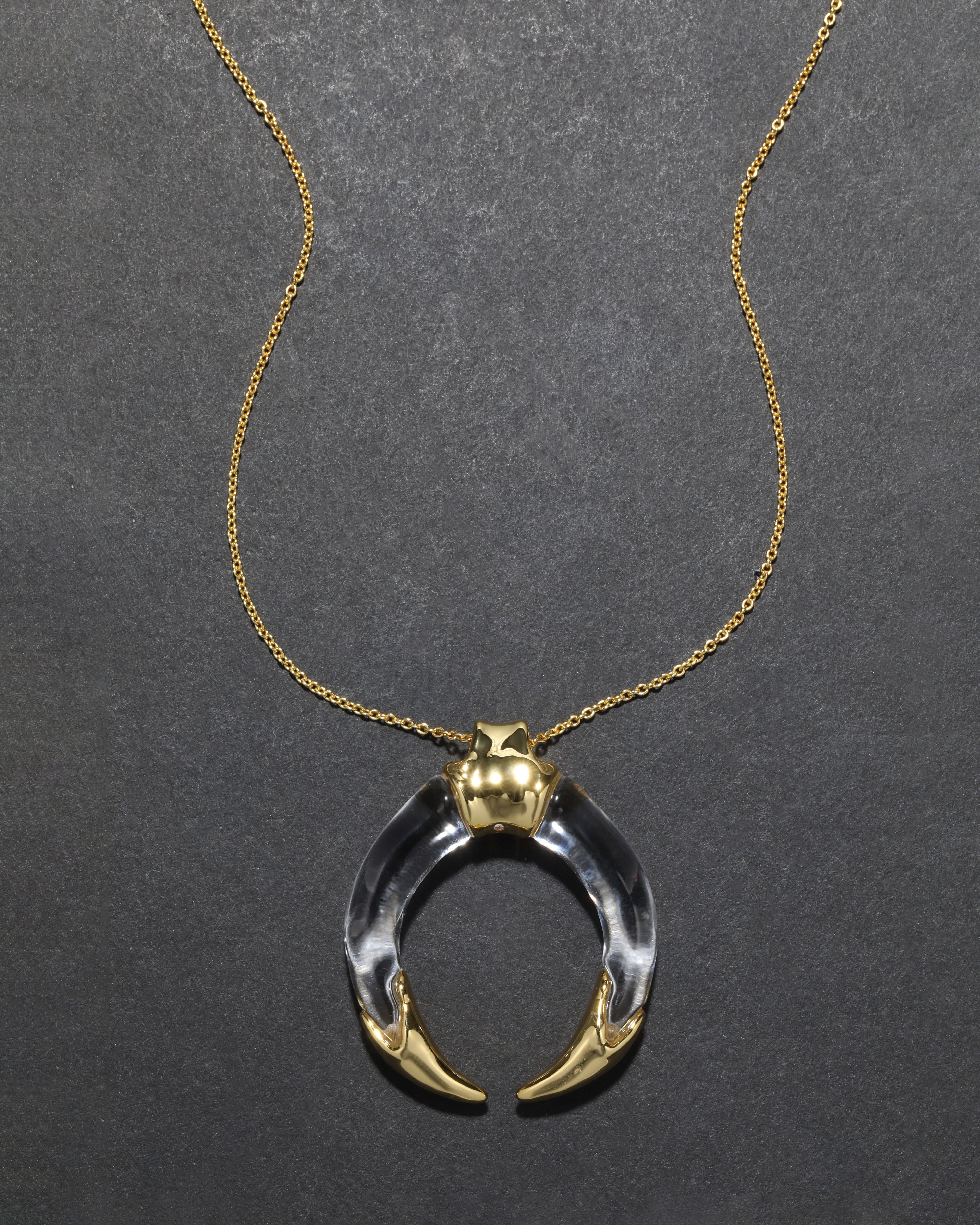 Hand-sculpted liquid clear Lucite forms a vintage inspired tusk on this long pendant necklace. Capped with molten 14k gold plated metalwork, it's perfect for layering or can be worn as a single statement. Tusk pendants were commonly worn as a talisman for strength & protection.
