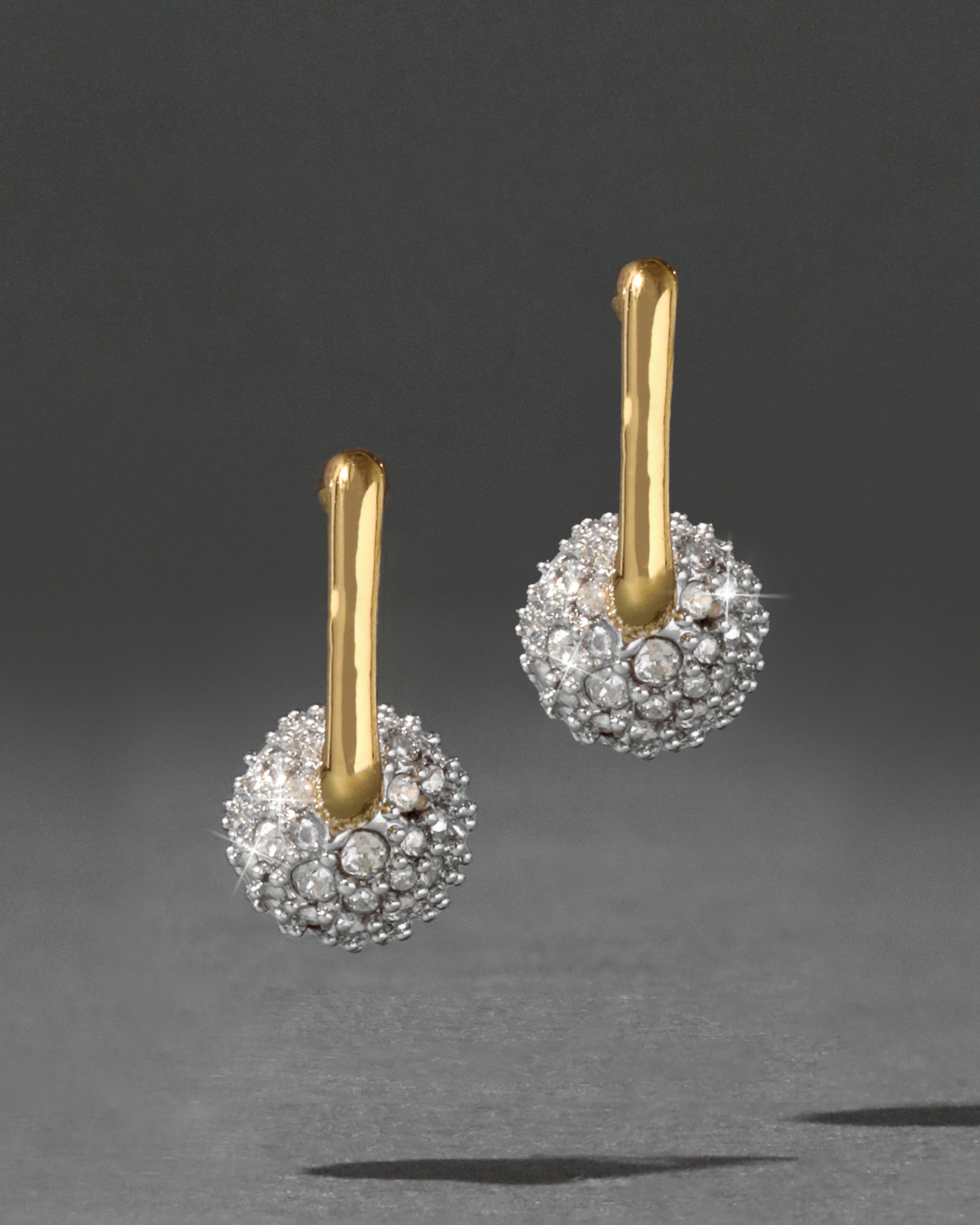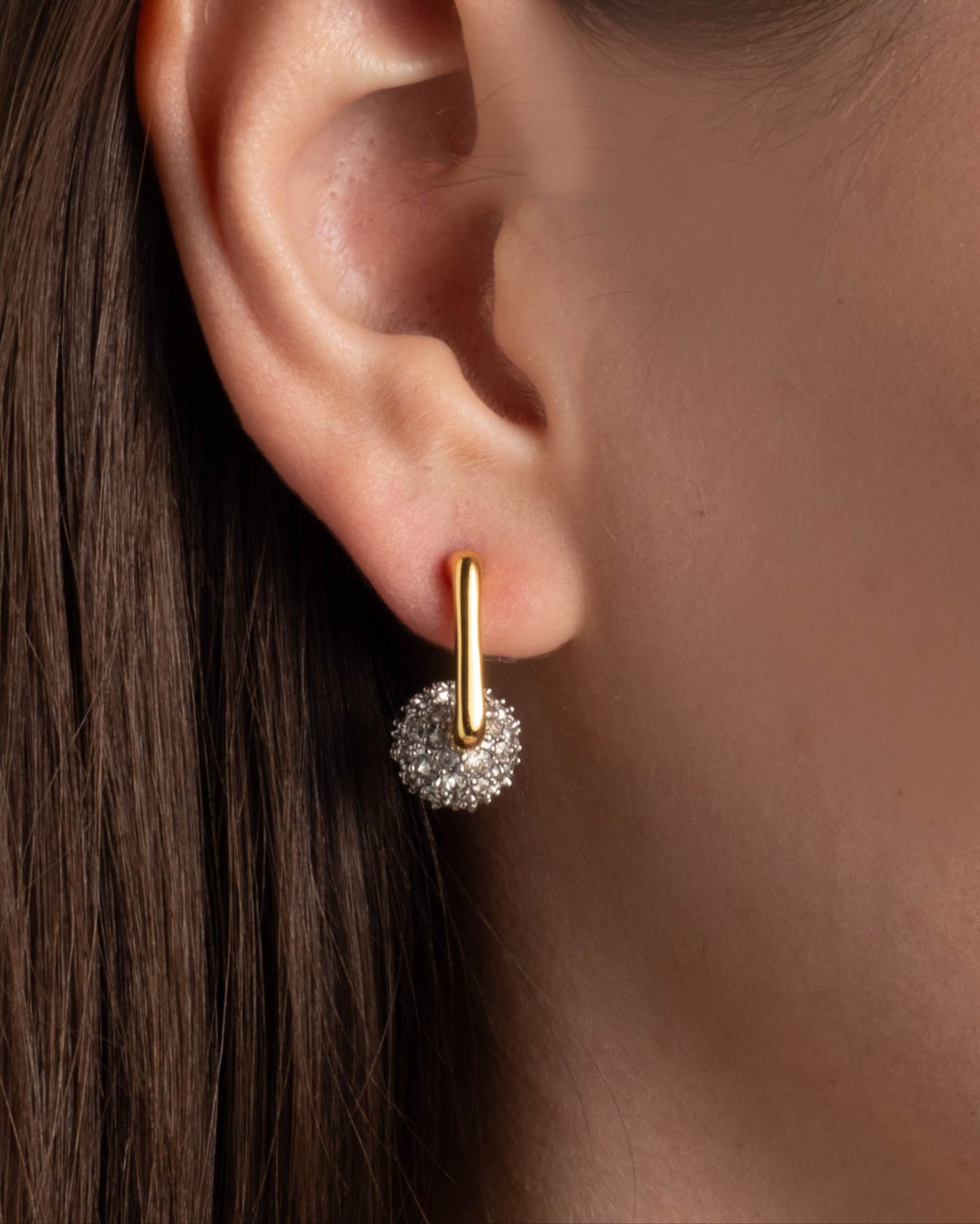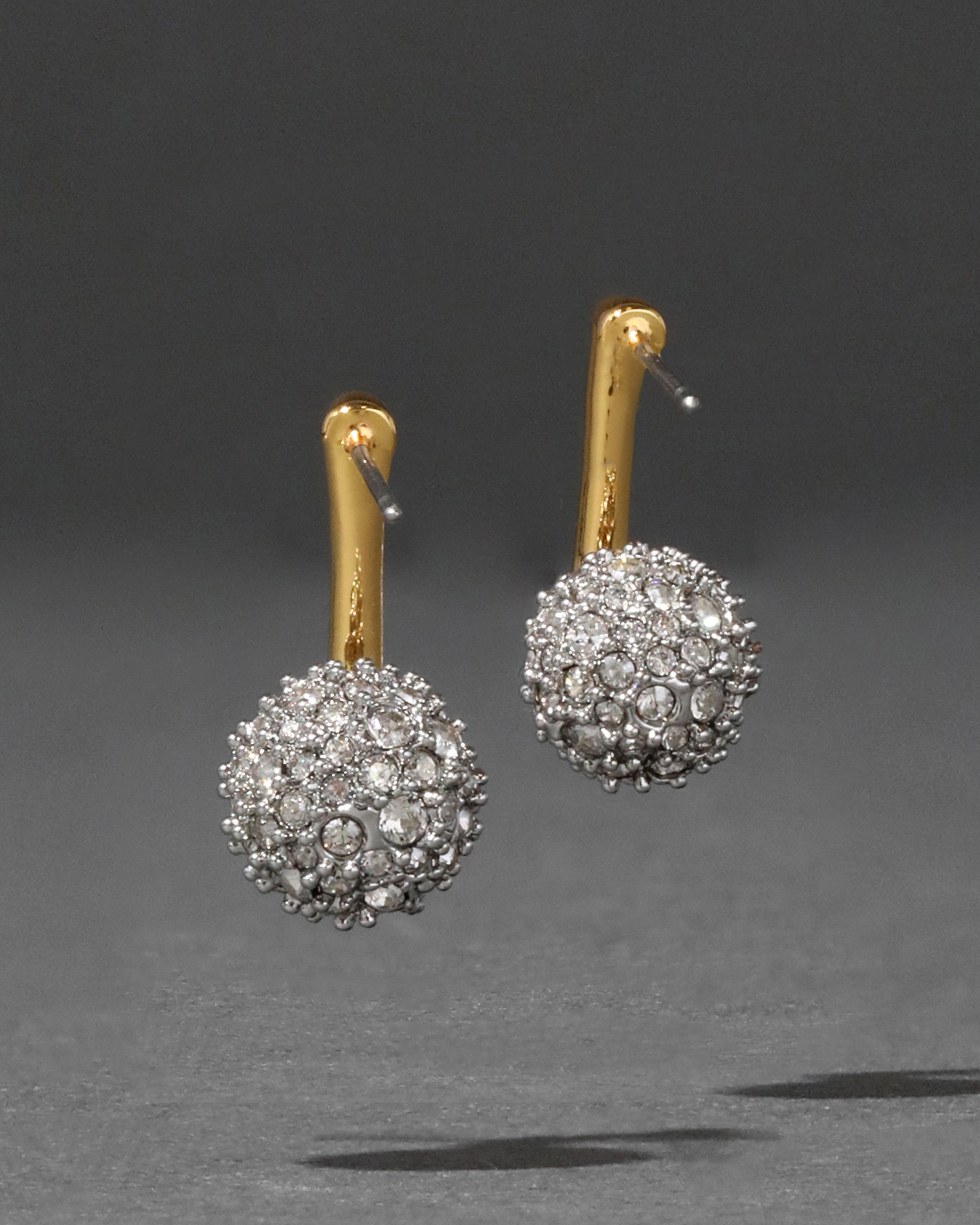 Pavé crystal encrusted silver tone plated orbs suspends and cuffs the ear on these 14k gold plated minimalist post earrings with a luxe dazzling flair. Sold as a pair.