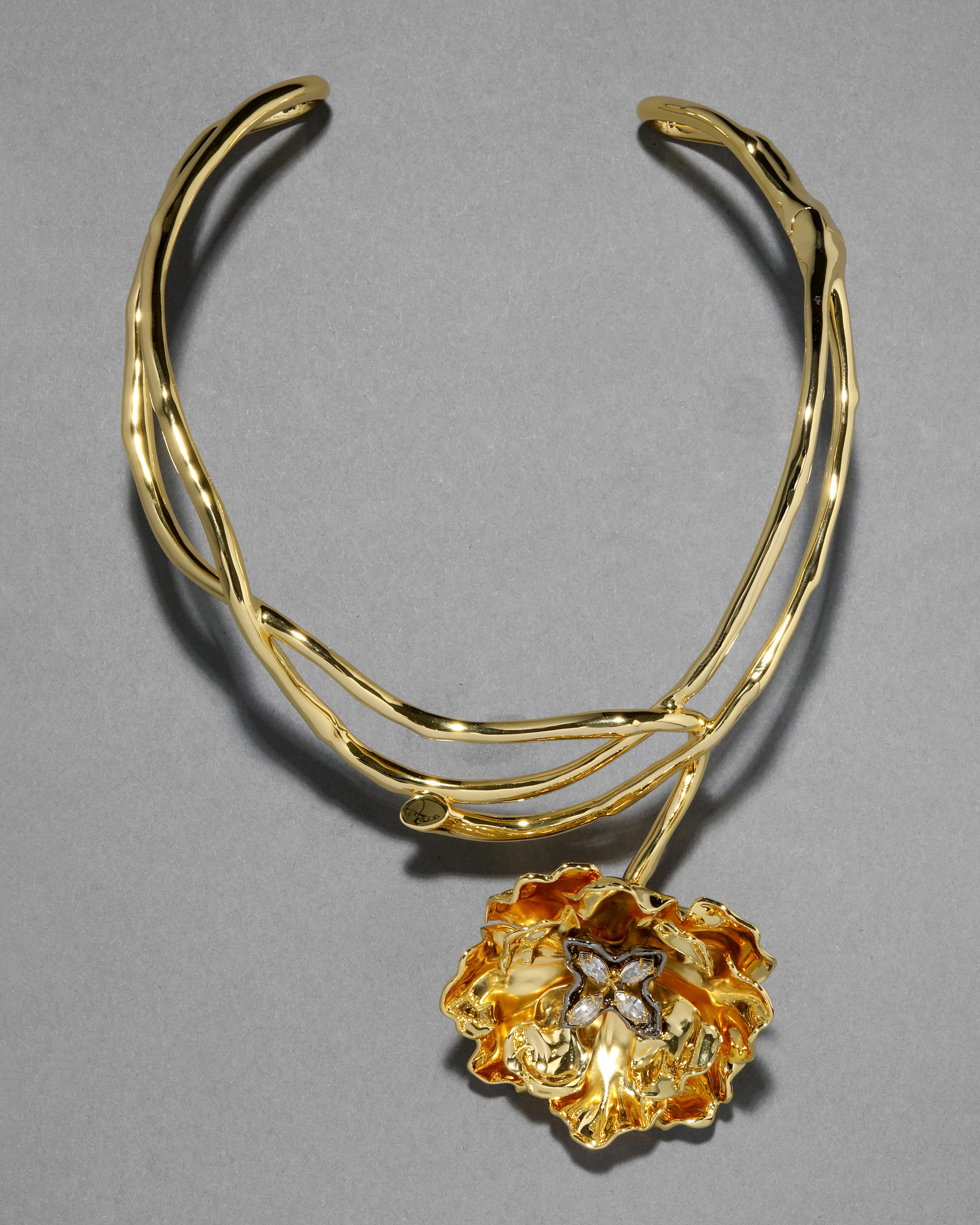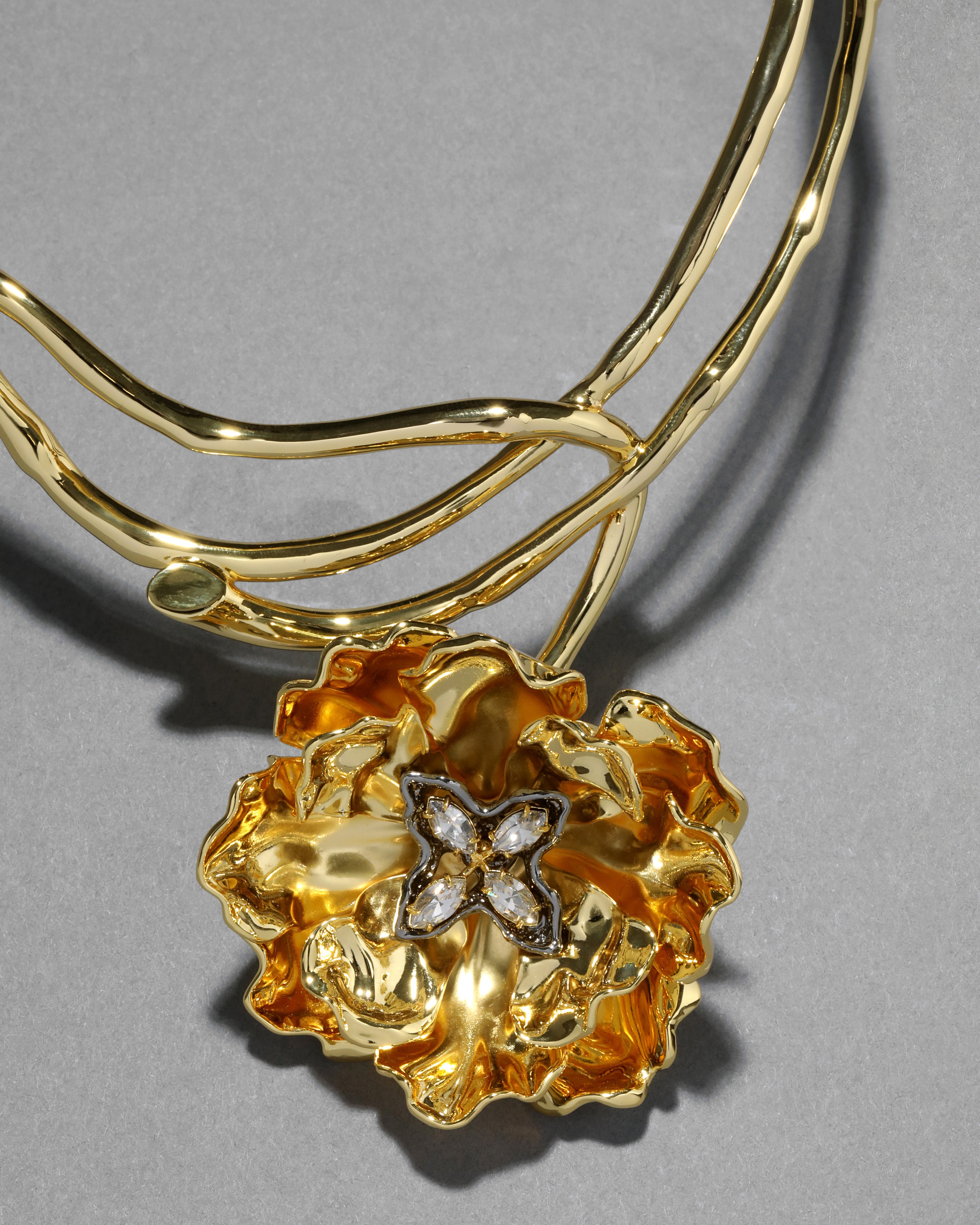 Vine-like metalwork sinuously winds across the neckline on this sculptural 14k gold plated collar necklace. A highly textured rose is suspended, slightly off-center, with layers of radiant crumpled petals surrounding a center of baguette crystals, in contrasting gunmetal plated settings.