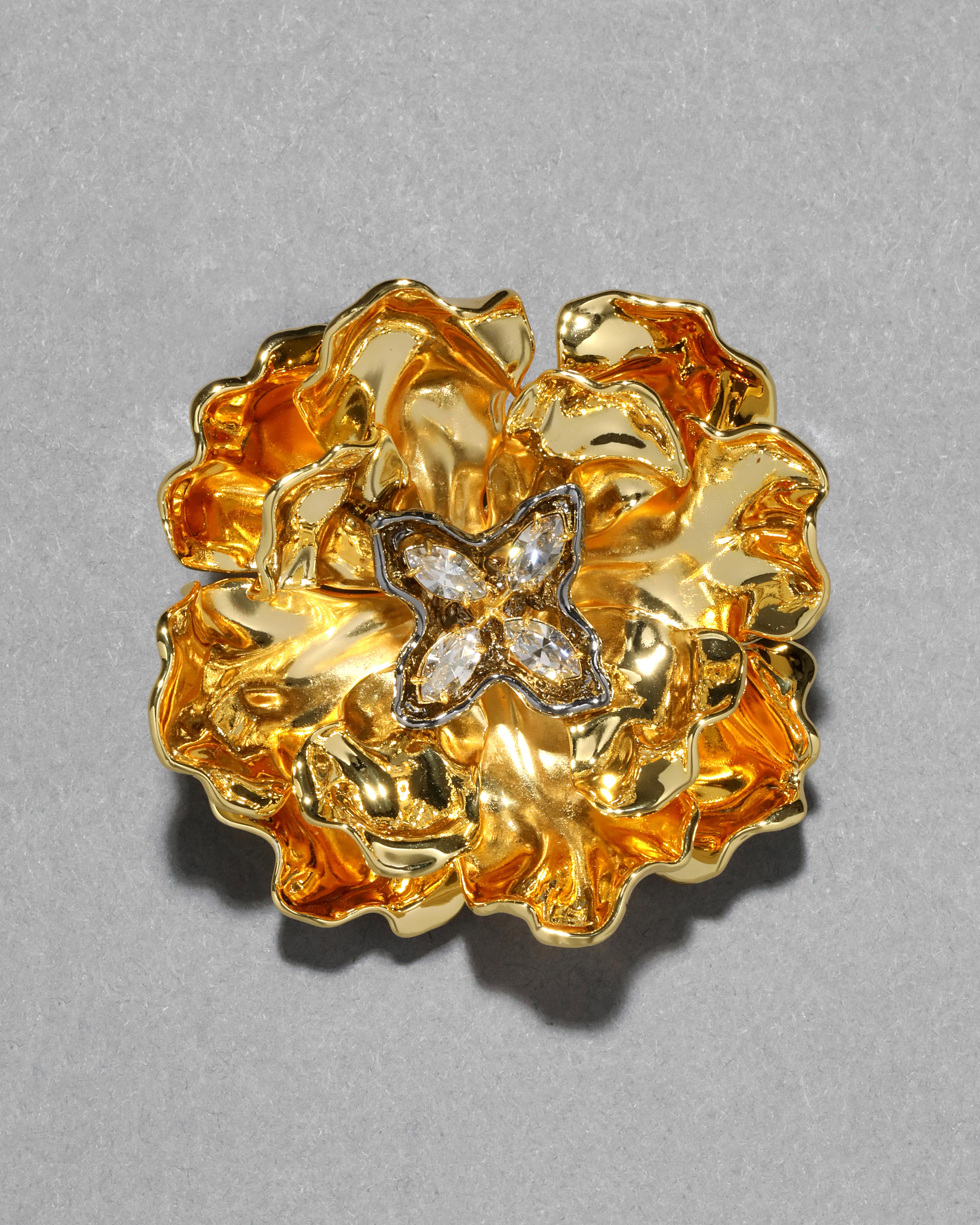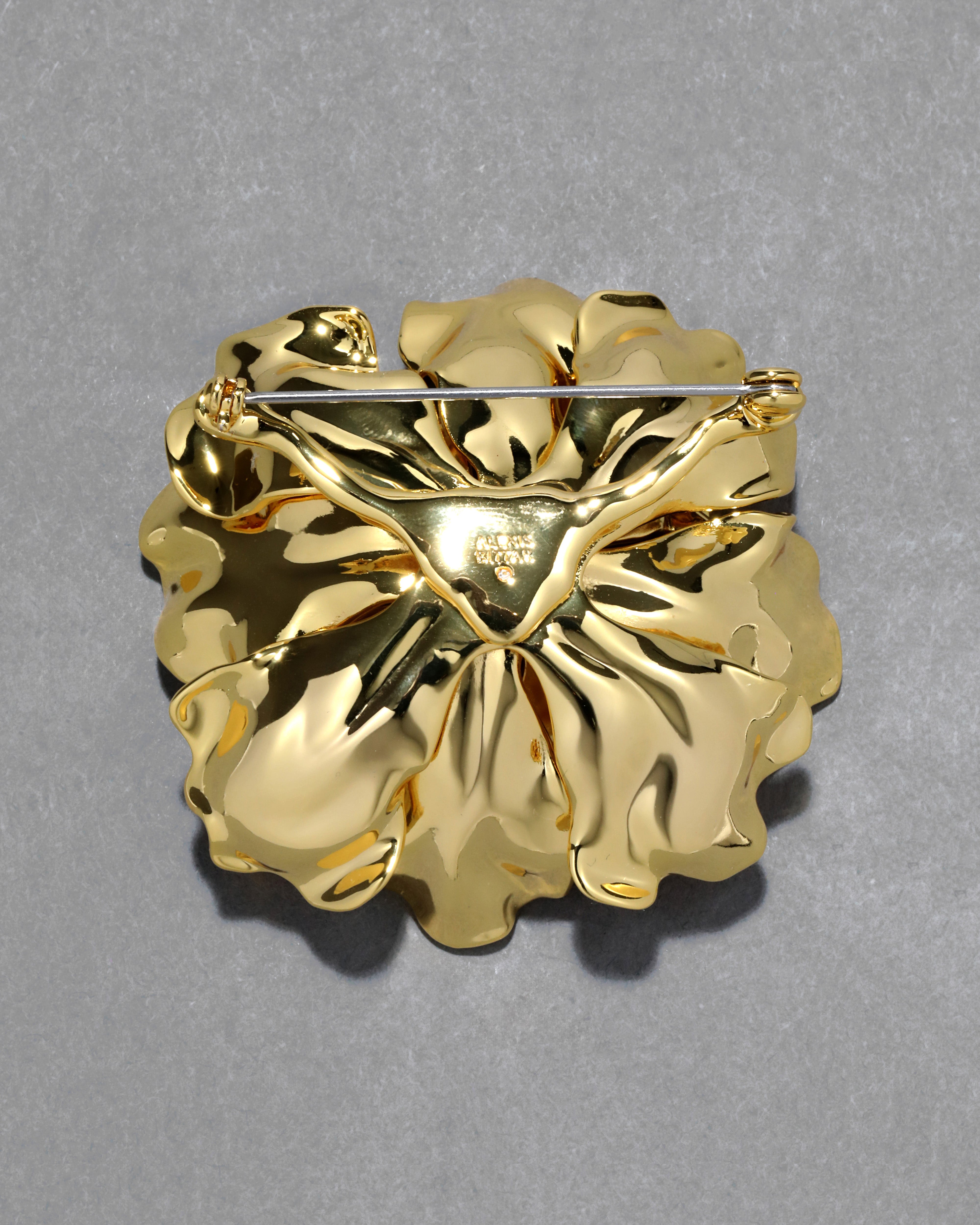 Highly sculpted layers of crumpled 14k gold plated petals spring from a center of baguette cut crystals, in contrasting gunmetal tone settings, on this gorgeous vintage-inspired rose pin.