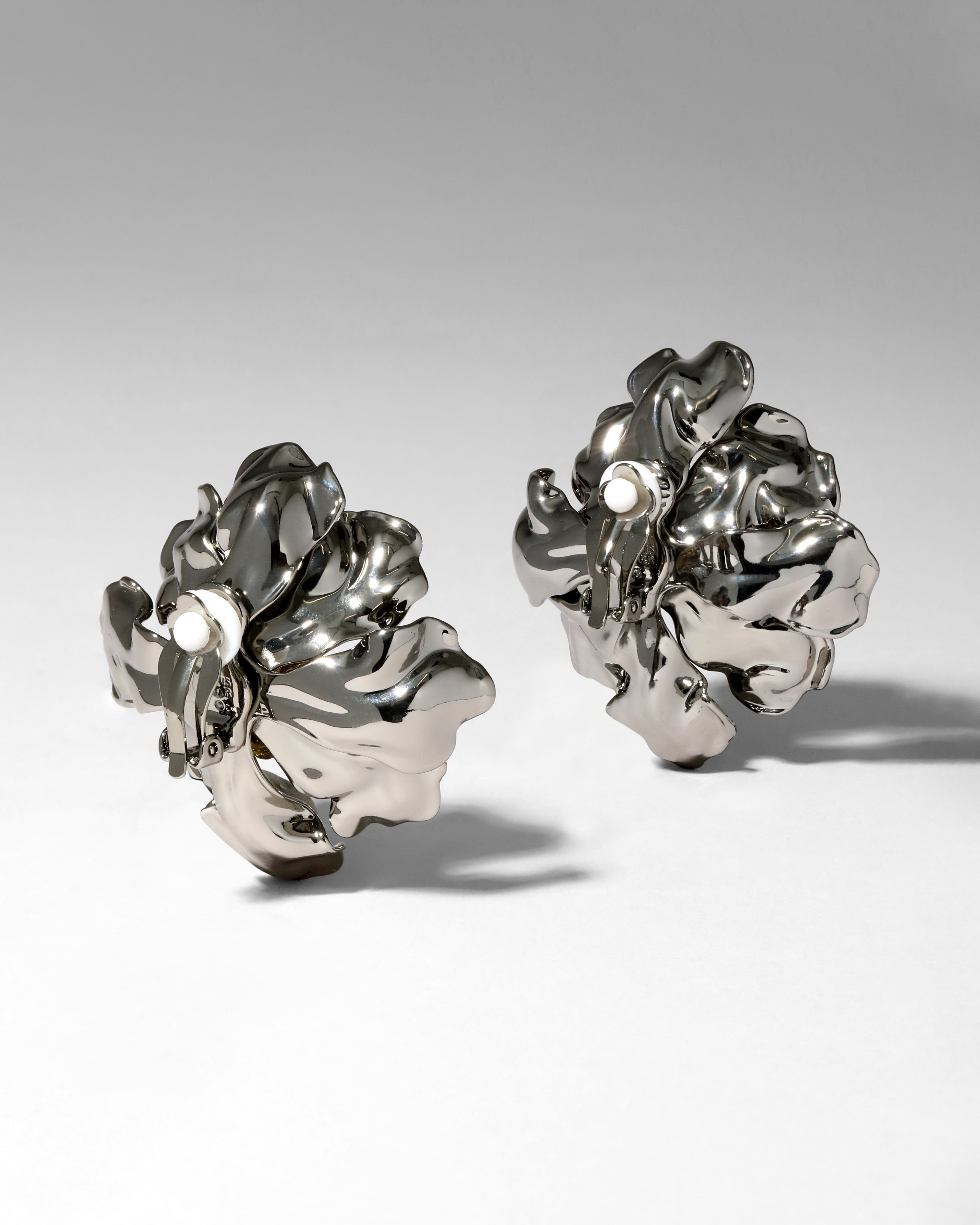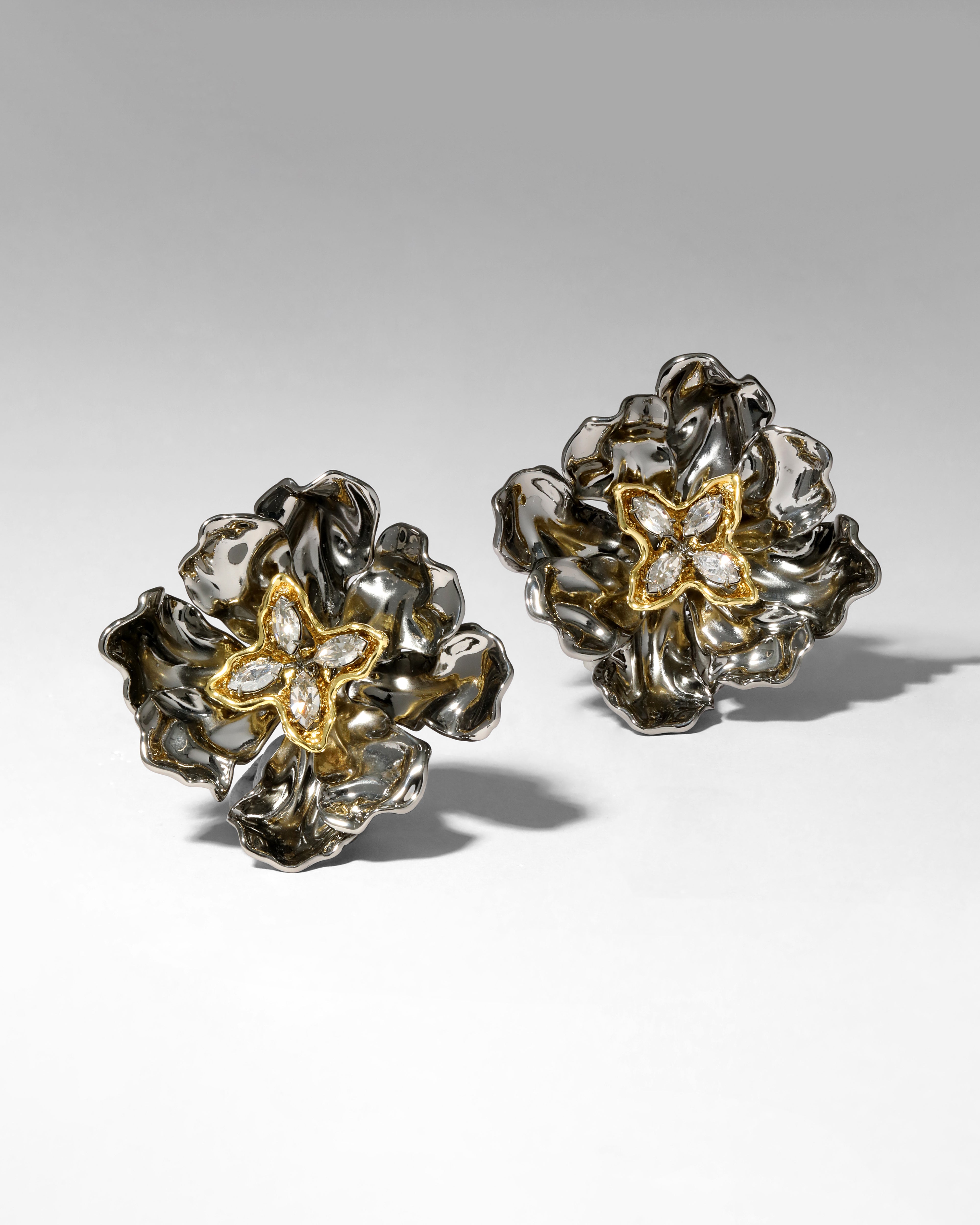 Crumpled reflective gunmetal tone petals surround a center of baguette cut crystals in custom 14k gold plated settings, on these highly-sculpted, oversize rose clip earrings.