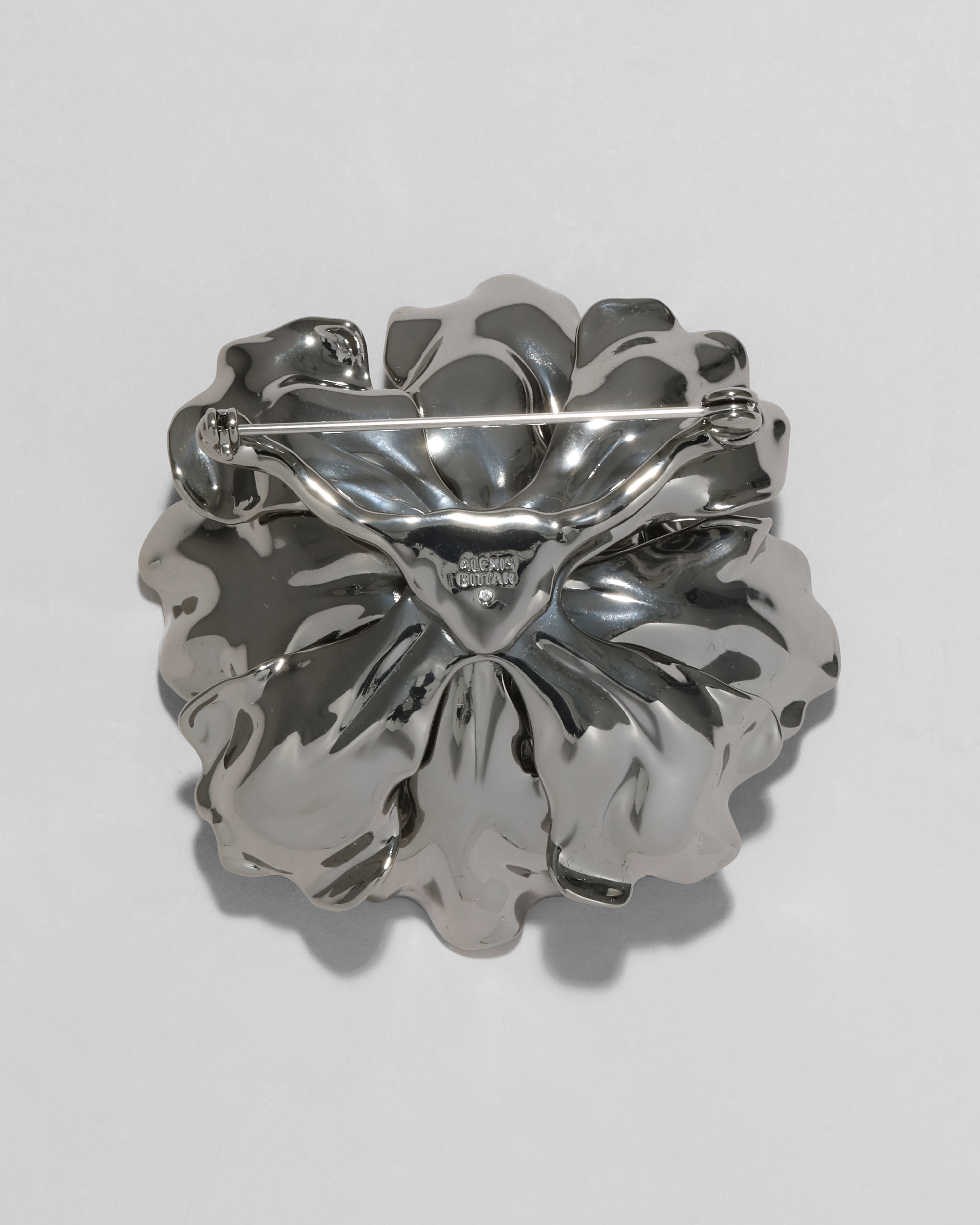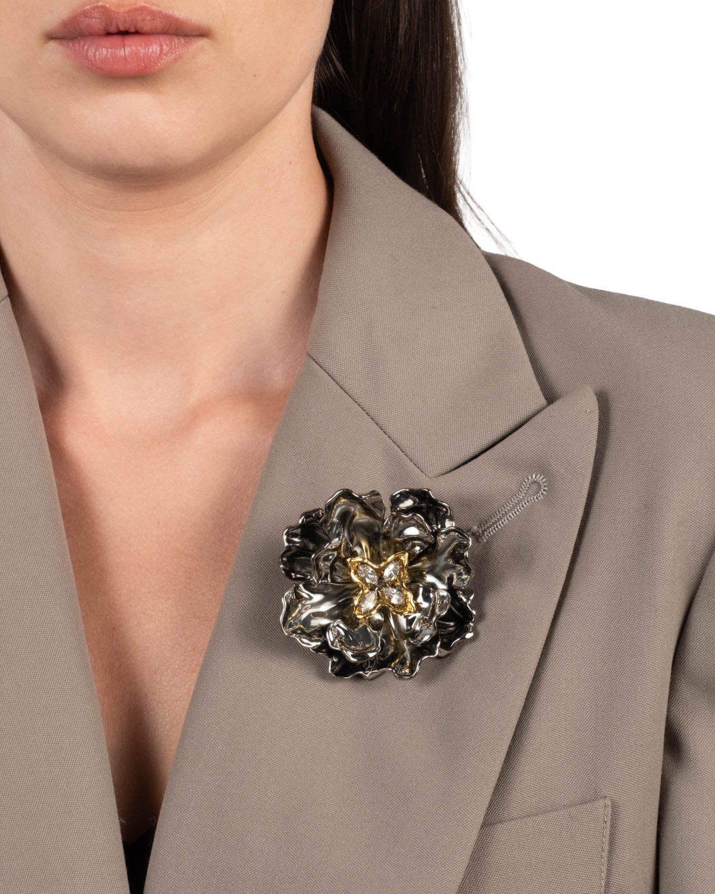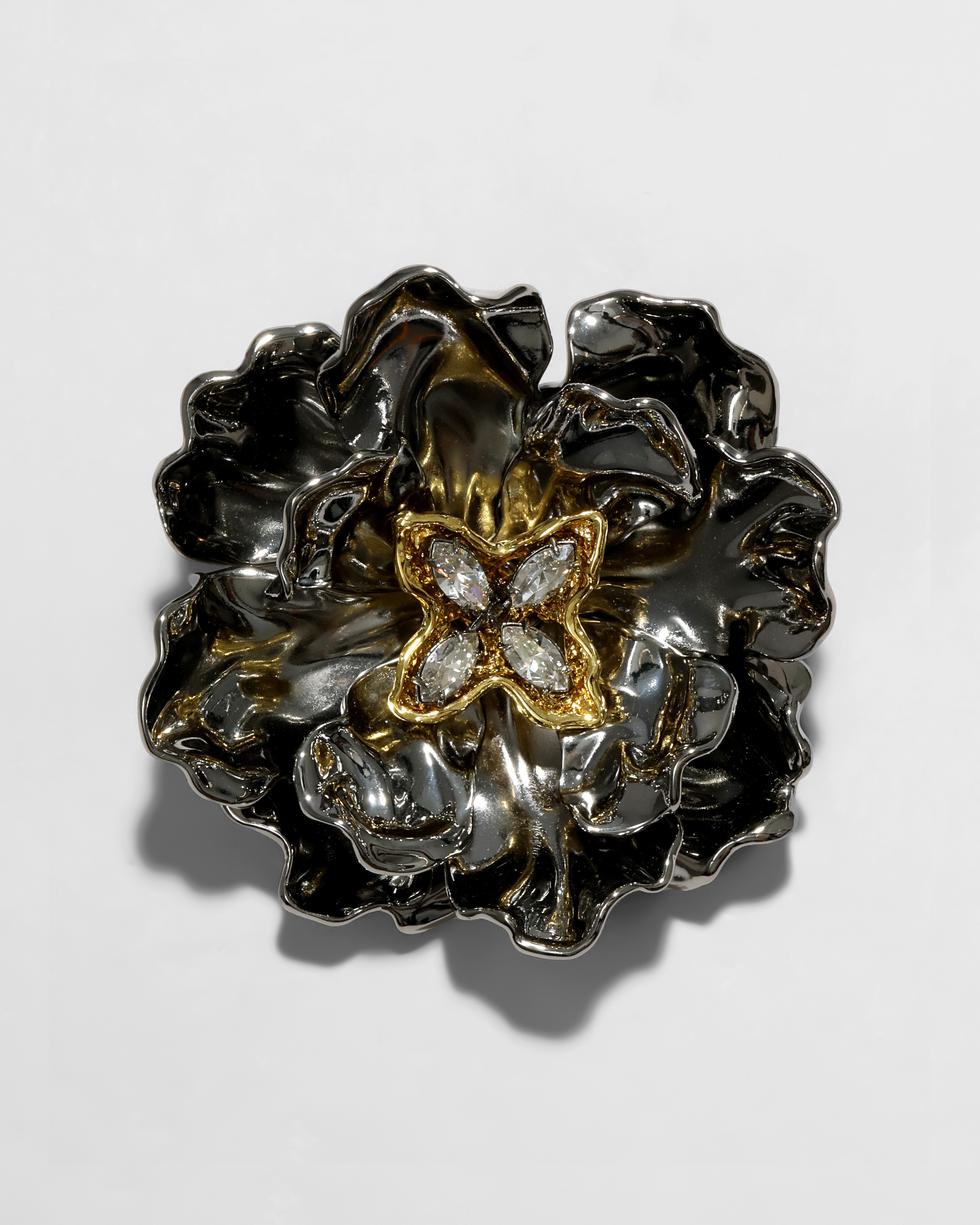 Highly sculpted layers of crumpled gunmetal tone petals spring from a center of baguette cut crystals, in contrasting 14k gold plated settings, on this gorgeous vintage-inspired rose pin.