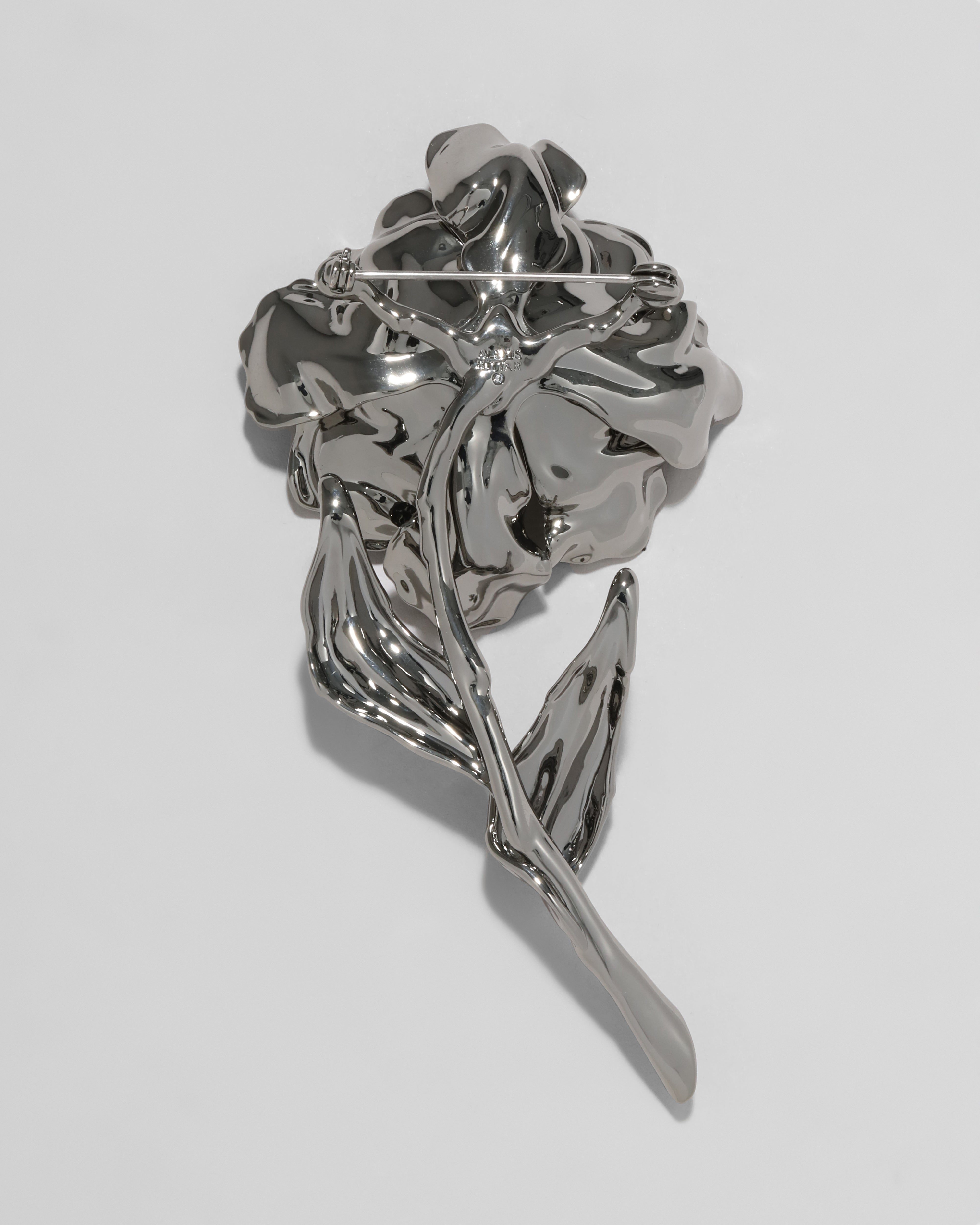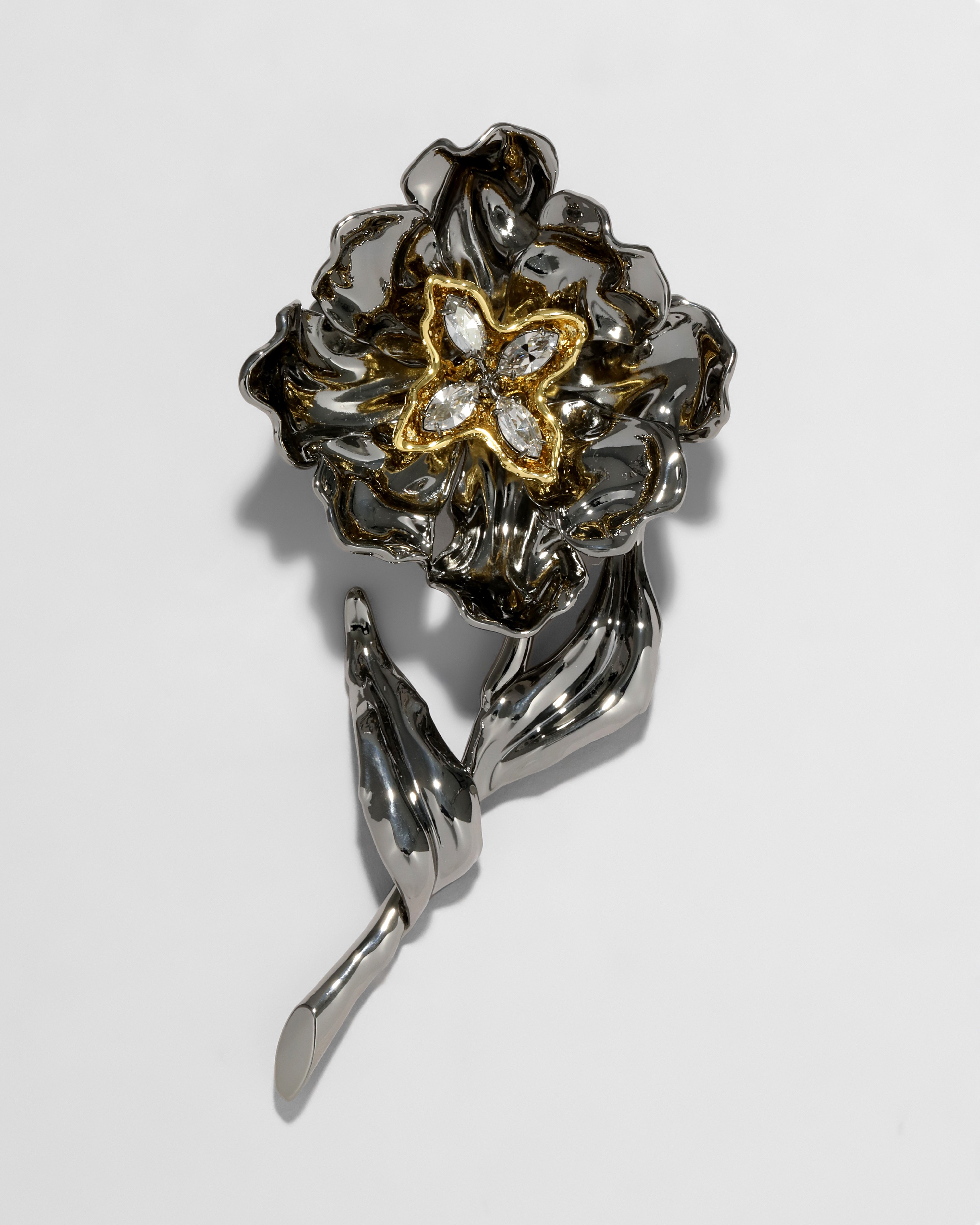 Taking inspiration from the Alexis Bittar archives, this highly sculpted stemmed rose pin features high shine gunmetal tone petals surrounding a center of marquis cut crystals, set in 14k gold plated metalwork. A true collector's piece.
