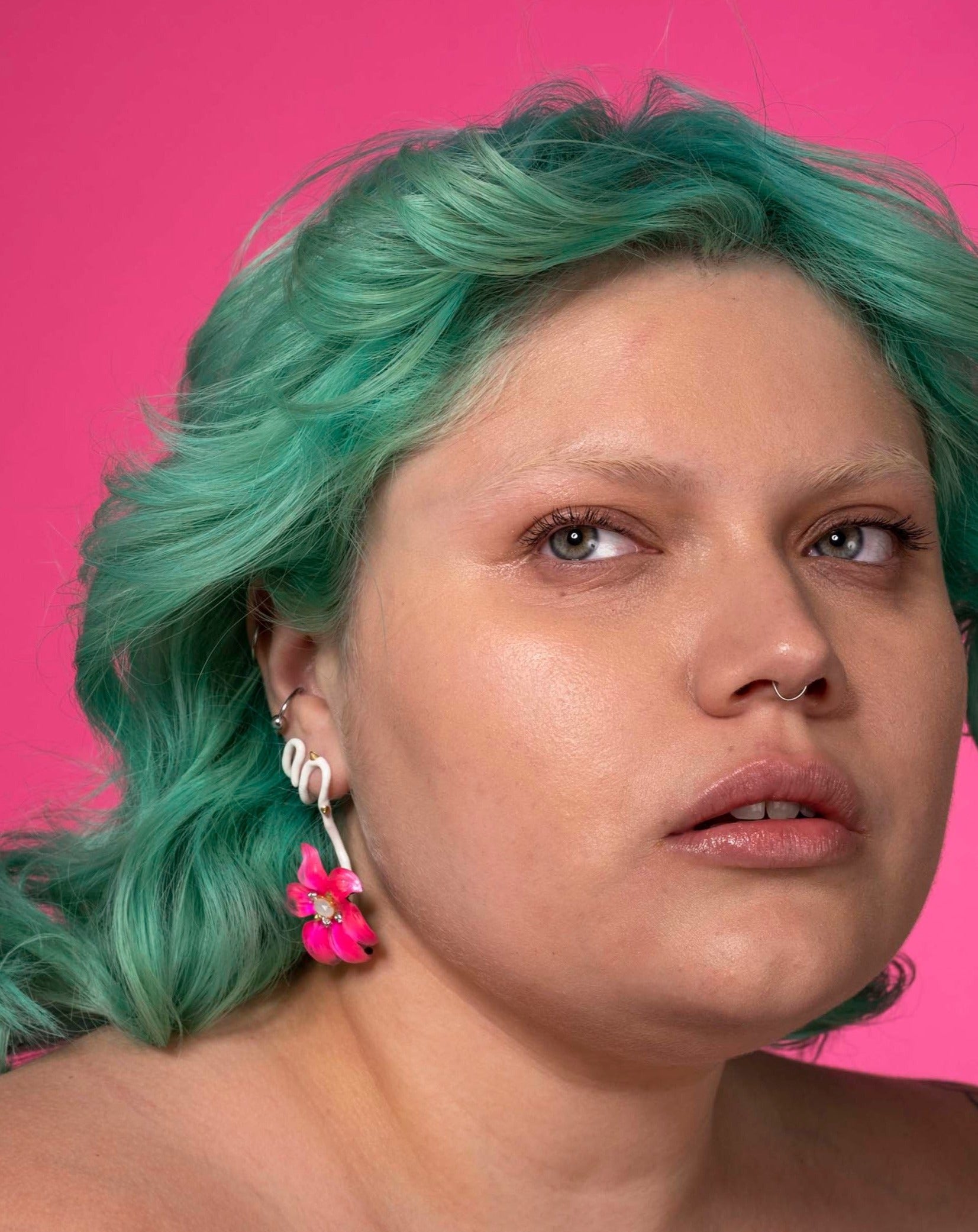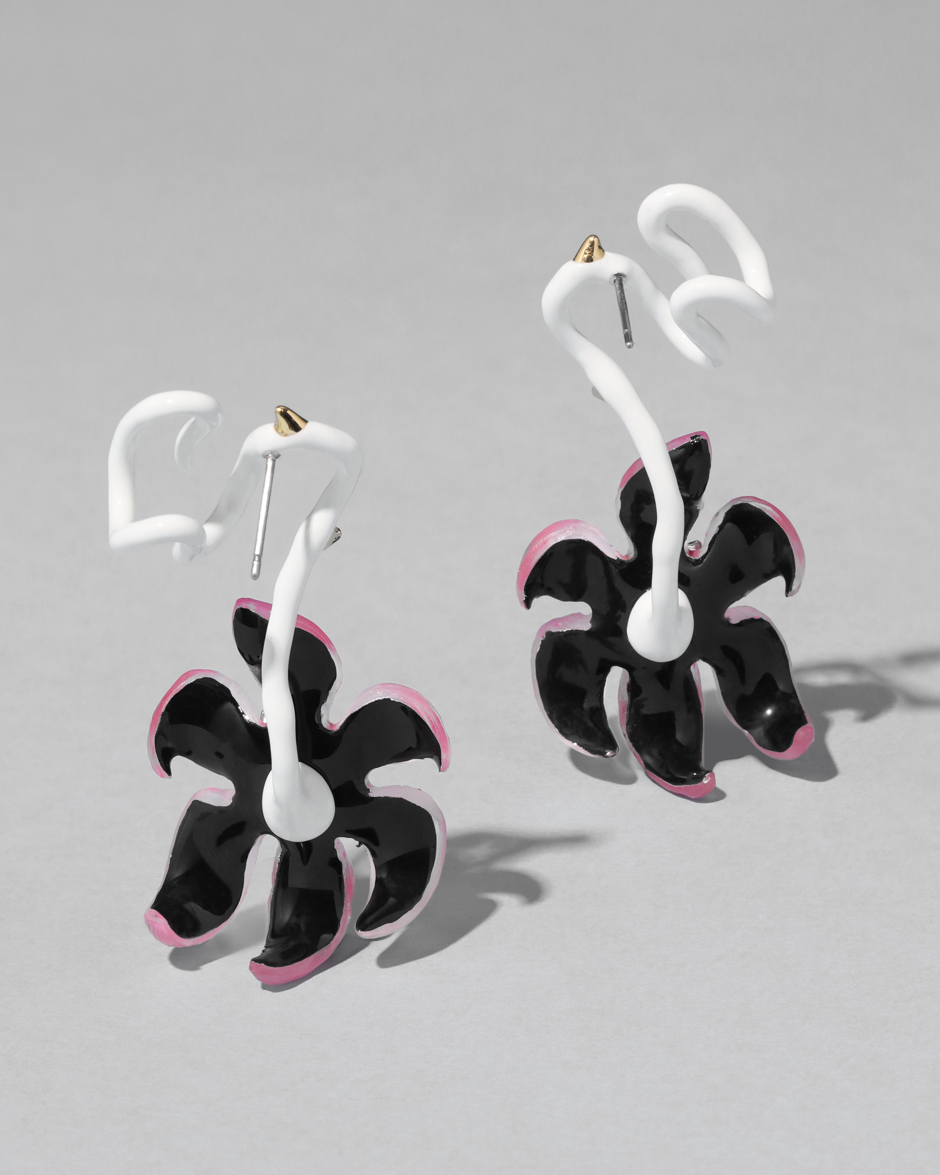 We recommend removing the magenta Lucite flower ear climber earrings before showering or swimming.